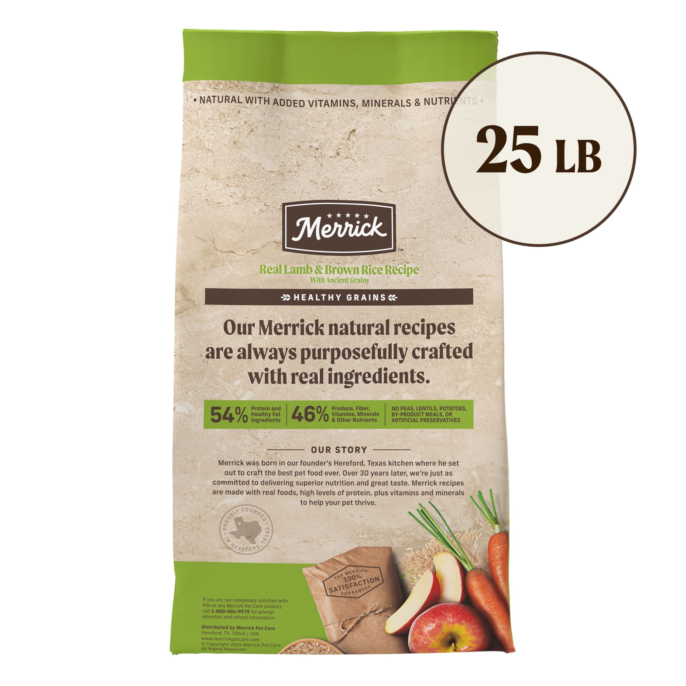 Merrick Healthy Grains Premium Adult Dry Dog Food With Lamb And Brown Rice, Wholesome And Natural With Added Vitamins And Minerals Kibble With Ancient Grains Real deboned lamb is always the first ingredient in this dry dog food recipe crafted with a holistic blend of whole grains like oats for healthy digestion Premium lamb and rice kibble is crafted with real produce and features high levels of glucosamine and chondroitin for dogs to provide hip and joint support in adult dogs Wholesome lamb dog food recipe formulated with real produce ingredients, and includes omega-6 and omega-3 fatty acids to nourish a healthy skin and coat Natural with added vitamins, minerals, and nutrients potato free dog food contains Omega-6 and Omega-3 fatty acids to nourish skin and coat. Proudly founded in Hereford, TX