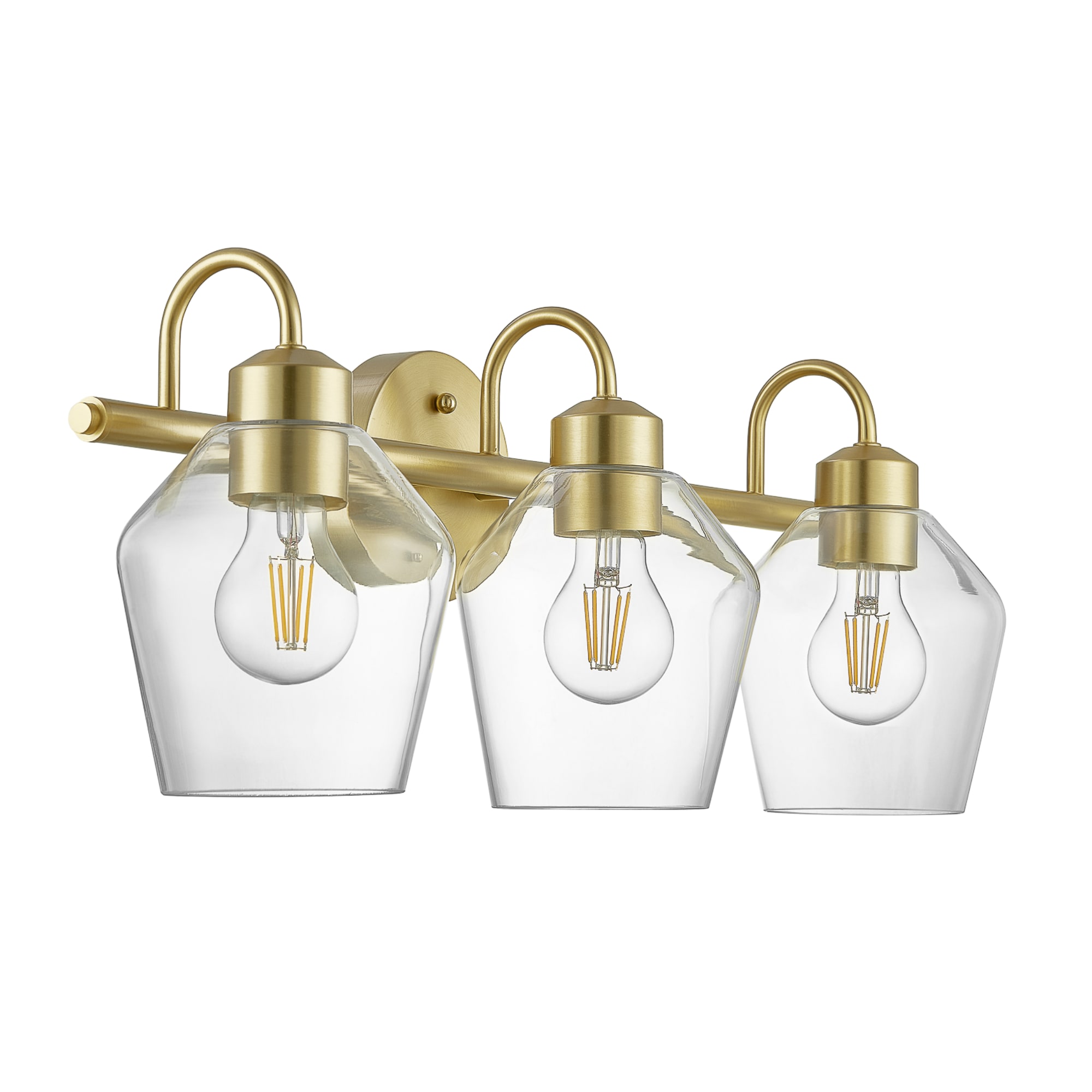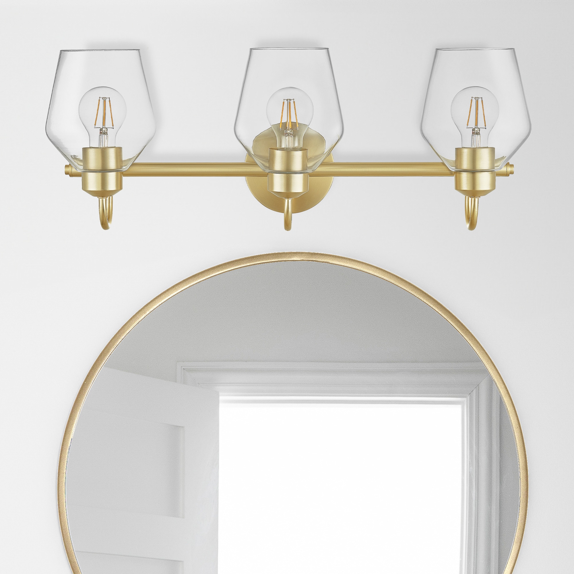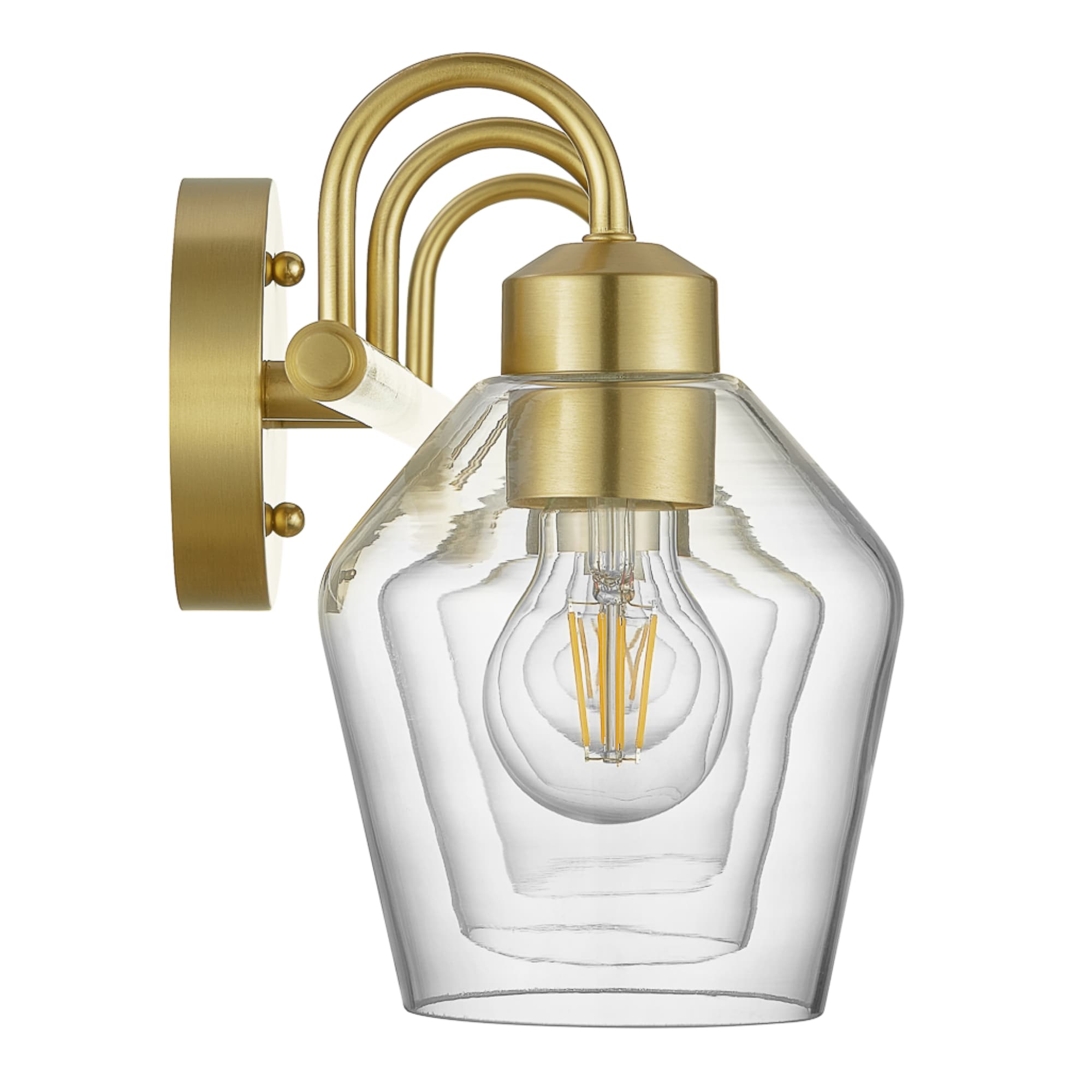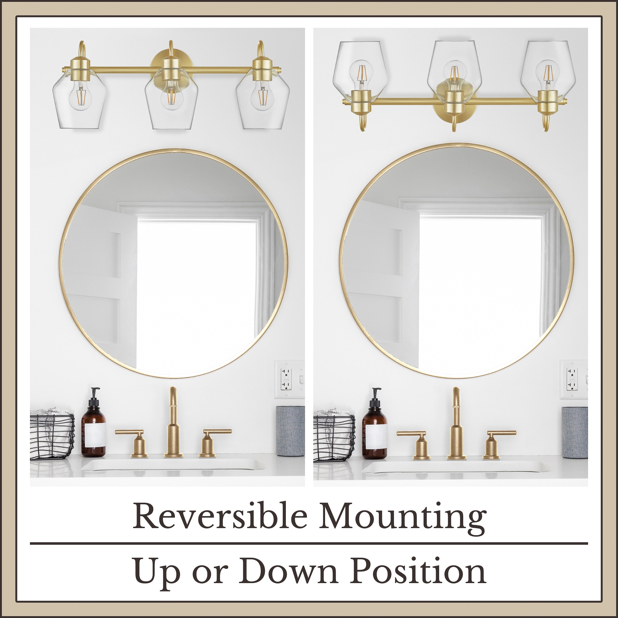 Gold is good, and so is this stylish vanity light. The clear glass shades feature a hip geometric shape that contrasts the straight and curved lines of the brushed gold base to give this vanity light it’s impressive appeal. A perfect fit for any transitional bathroom or powder room, this eye-catching light can be mounted with clear glass shades facing up or down to give you the exact look you are going for.