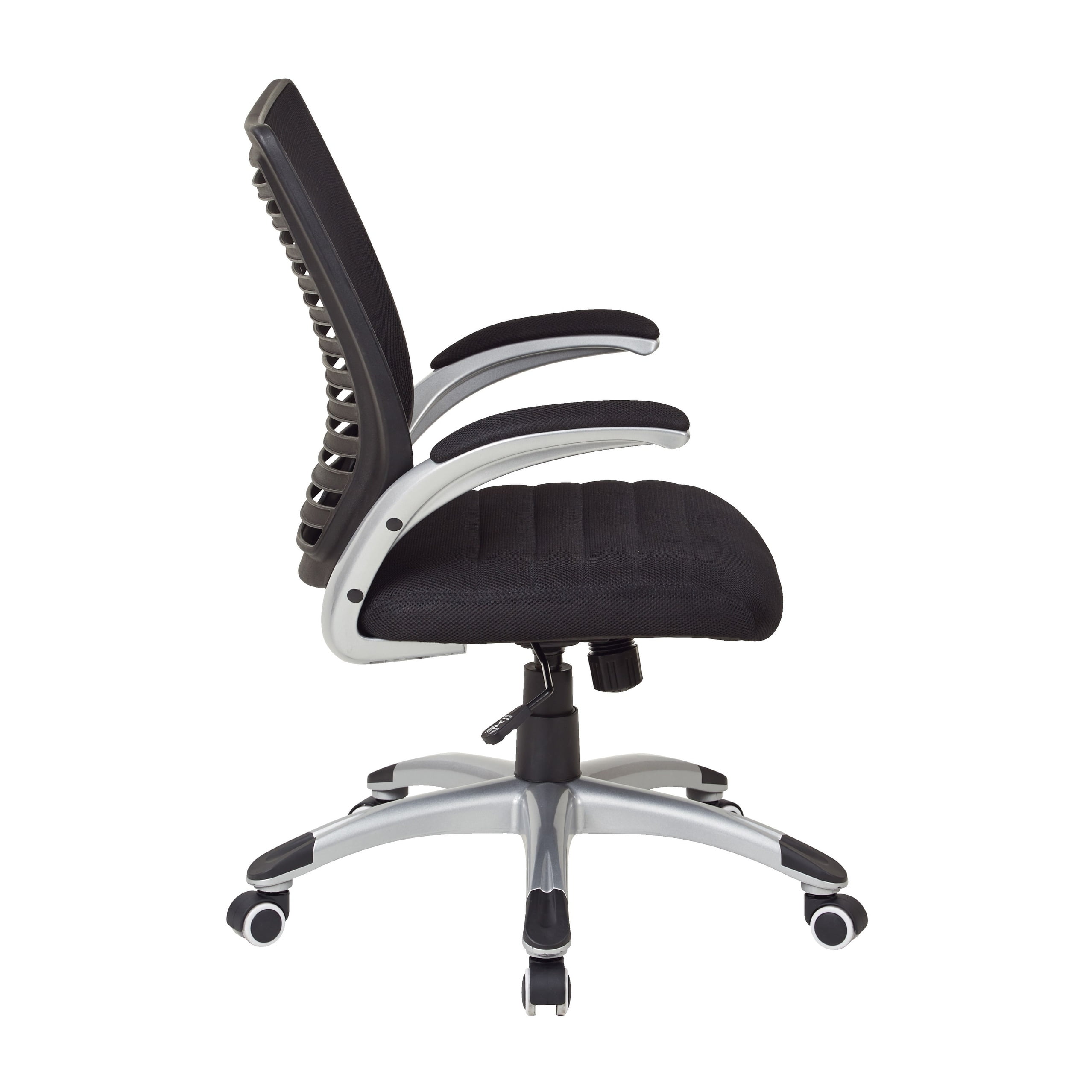 Finish: Black Material: Metal, Nylon, Mesh Fabric Breathable Screen Back with Built-In Lumbar Support One-Touch Pneumatic Seat Height Adjustment Locking Tilt Control with Adjustable Tilt Tension Black Mesh Seat Thick Padded Silver Arms Silver Nylon Base with Dual Wheel Carpet Casters Arms to Seat Height : 7.5″ – 7.5″ Arms to Floor Height : 25.75″ – 28.75″