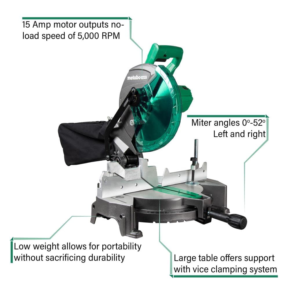 The Hitachi C10FCGM 10″ Compound Miter Saw is lightweight for easier transport. The 15 Amp motor generates a no-load speed of up to 5,000 RPM for making crosscuts and miter cuts with ease. This saw offers a bevel range of 0-45 degrees to the left to provide clean and accurate bevel cuts. It is designed for woodworkers who demand precision, reliability and versatility on the job. Features Large table for better material support with vice clamping system to secure work piece Thumb actuated positive stops for quick miter adjustments Horizontal handle for a secure hold Carbon brush access allows user to replace brush as needed to greatly prolong the life of the tool 0-52 degree miter angle range to the right & left for increased flexibility 0-45 degree bevel range to the left to provide clean and accurate bevel cutsSpecifications Size: 10 in. – SKU: JNSN98188