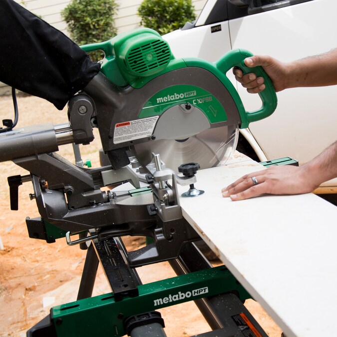 The Metabo HPT C10FSBS 10-inch sliding dual compound Miter saw offers the ultimate in form and function for trim carpenters, framers and woodworkers. The positive stops on the miter and bevel scales make for easy-to-read measurements and quick settings. With a 45 degree dual bevel angle range, users can quickly flip the saw blade and leave the material in place. The linear ball bearing slide system and white on black miter scale provide superior accuracy and visibility. Electronic speed control keeps RPM’s constant and unintended cuts are avoided with the electric brake feature.