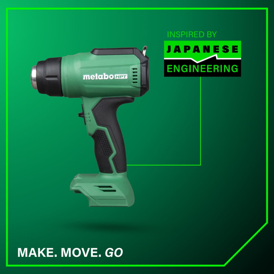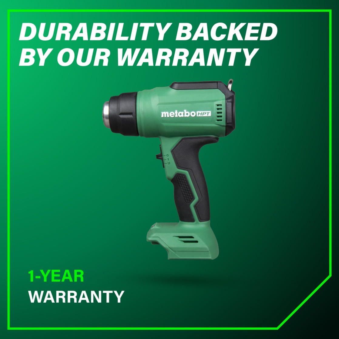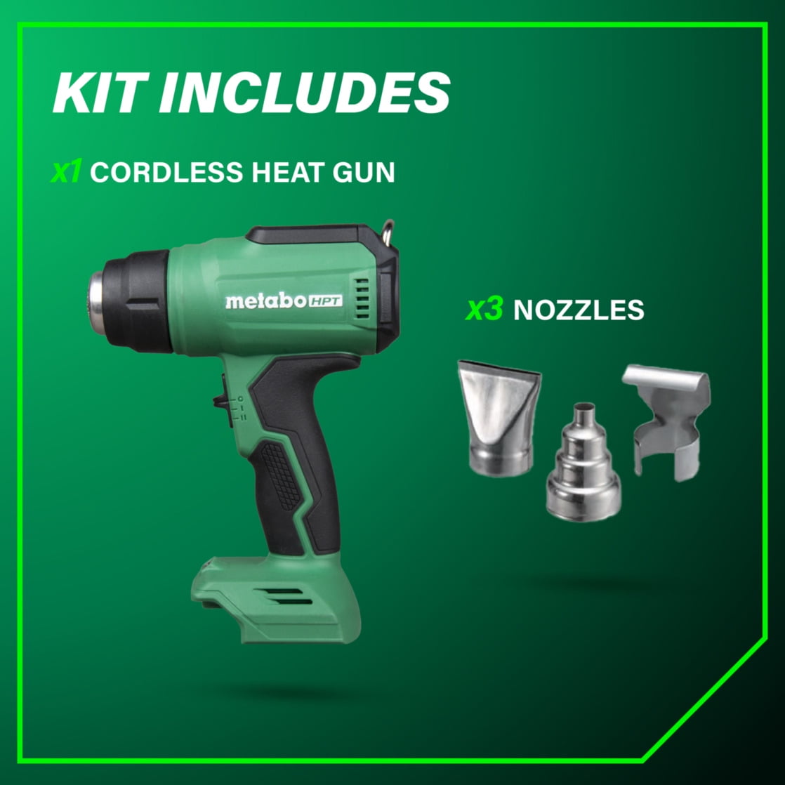 The Pro Preferred Brand of pneumatic nailers introduces a cordless heat gun! Bring heat with you no matter where the job takes you with the new 18V MultiVolt cordless heat gun (RH18dad4). Use this MultiVolt cordless heat gun for all your jobs that require a heat source thanks to its high temperature range settings from 86?? to 122?? F. Temperature is adjusted in 18?? F increments to find the ideal temperature for any project. The illuminated LCD display will ensure easy readout of your selected temperature setting, as well as your remaining battery charge. With three included accessories, you can be sure all your jobs are covered, and with multiple operating positions, including hands free operation, you can be sure every job is completed effortlessly. The 18V cordless heat gun (RH18dad4) is part of the expanding MultiVolt system of 18-Volt and 36-Volt power tools from Metabo HPT. Go lighter with 18V batteries or go longer with the unique MultiVolt battery that works on both 18V and 36V tools to double your runtime for up to 8.Ah of runtime per charge for more power on the go.