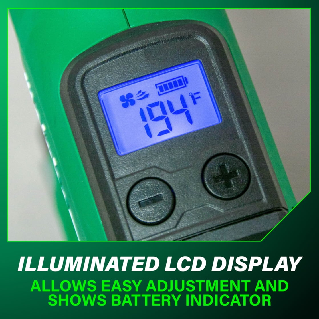Heat and air settings: 2 stages for heat and air volume settings, to find the ideal heat and fan speed output Heat temperature: range from 86 to 122?? F Illuminated LCD display: allows easy adjustment for different applications and shows battery indicator Adjustable temperature: 18?? F increments