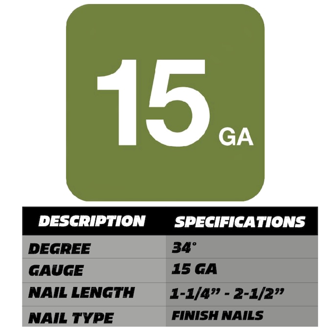 - FASTENERS: 15-gauge nails from 1-1/4-in Up to 2-1/2-in In length