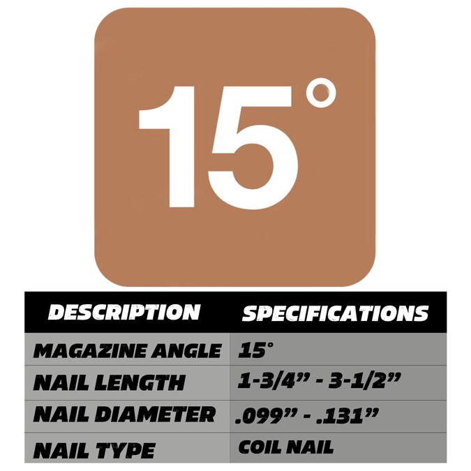 - FASTENERS: Accepts 15 degree +/- 1 wire coil nails from 1-3/4-in – 3-1/2-in