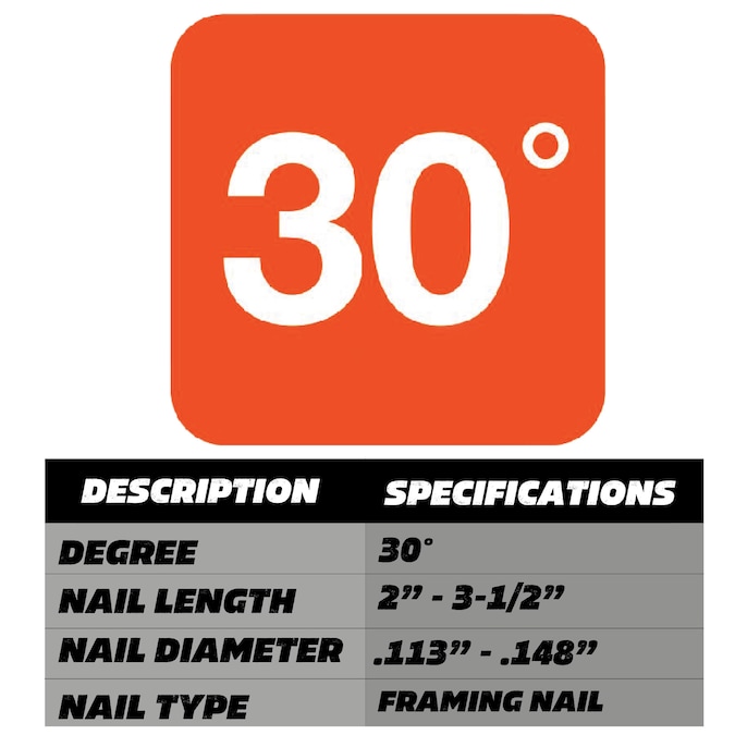 - FASTENERS: Accepts 2-in up to 3-1/2-in paper collated framing nails
