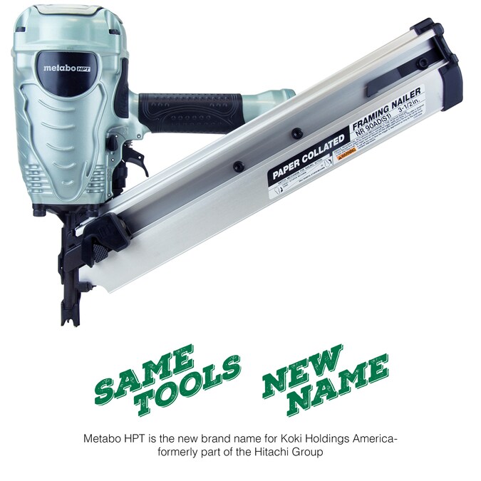 The NR90AD(S1)M framing nailer drives paper collated nails from 2″ up to 3-1/2″ in length and features Metabo HPT’s next generation “industrial design.” Weighing only 7 lbs, it is easy to use all day, while still providing the power of a bulkier, heavier nailer. It can be used for floor and framing, truss build-up, window build-up, sub flooring, roof decking, wall sheathing and housing construction. Allows for quick transitions between sequential and contact nailing with the simple flip of a switch.