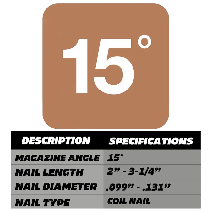- FASTENERS: Accepts 15 degrees +/- 1 wire coil nails from 2-IN – 3-1/4-IN