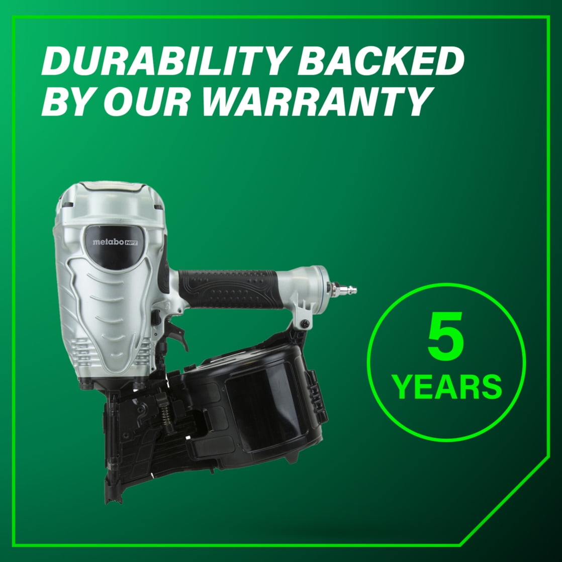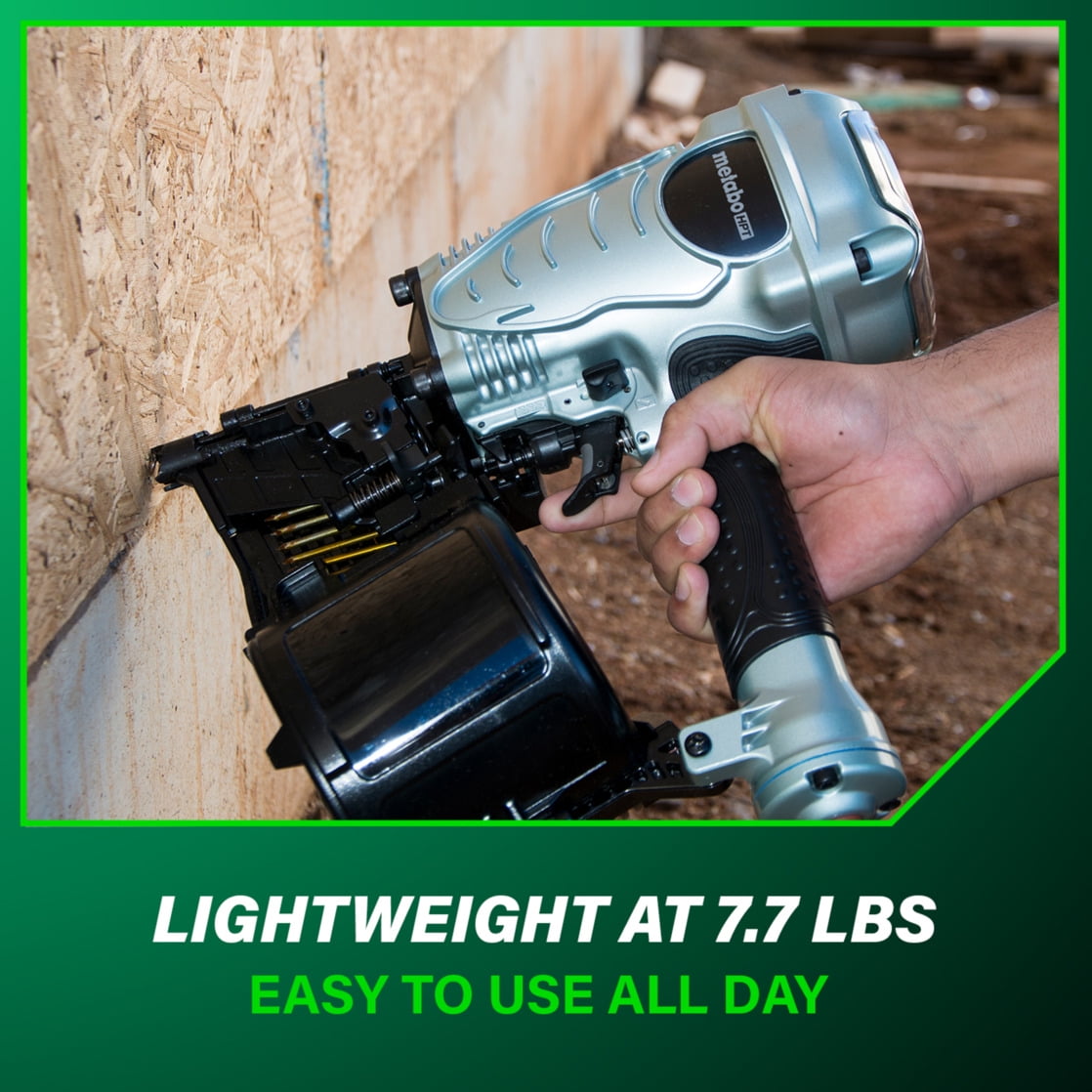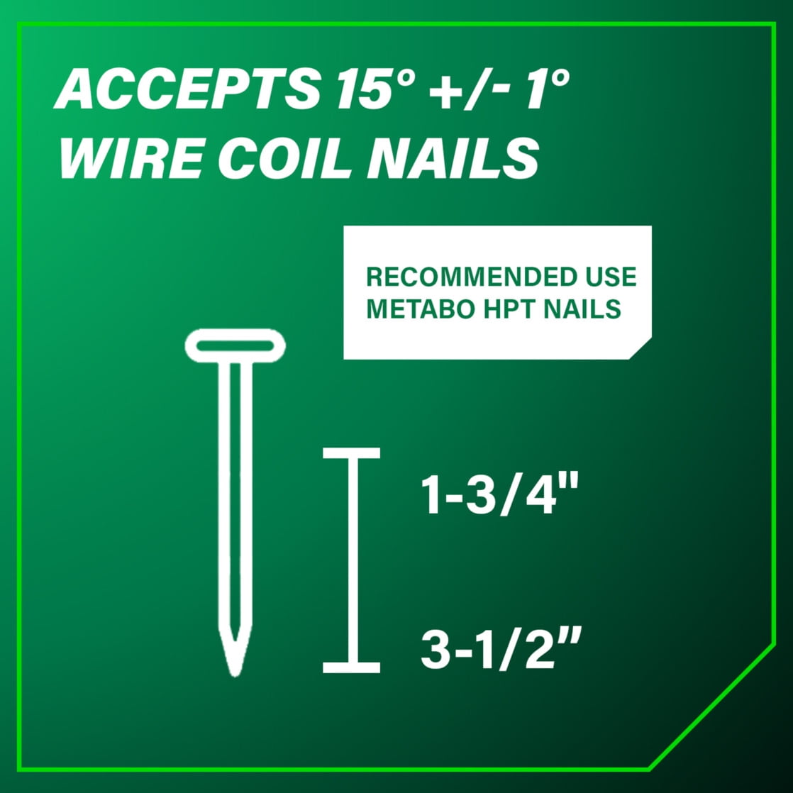 FASTENERS: Accepts 15° +/- 1 wire coil nails from 1-3/4-in – 3-1/2-in AWARD: Rated the Pro Preferred Nailer for 9 years running (2014 – 2022) by Builder and Developer Magazine WARRANTY: Covered by Metabo HPT’s Professional 5-Year Tool Warranty DEPTH ADJUSTMENT: Tool-less depth of drive dial adjusts for flush fastening in varying materials TRIGGER: Selective actuation switch allows for either sequential or contact nailing with the simple flip of a switch DEPTH ADJUSTMENT: Tool-less depth of drive dial adjusts for flush fastening in varying materials LIGHTWEIGHT: At only 7.7 lbs, it is easy to use all day OPEN NOSE: Open nose design for easy jam removal DURABLE: Steel head plate for increased durability RECOMMENDED: Use Metabo HPT Nails for best results