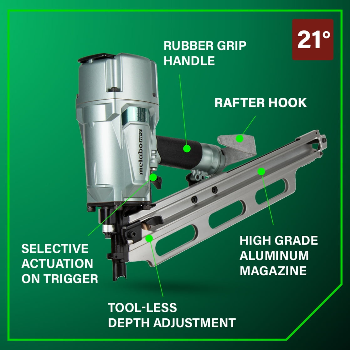 HIGH GRADE ALUMINUM MAGAZINE: Provides exceptional durability and protects against jams TOOL-LESS DEPTH OF DRIVE ADJUSTMENT: For flush fastening in varying material ACCEPTS: 2 strips of 21 degree x .113-.131-in collated nails ranging from 2-in-3.25-inches in length CYLINDER VALVE DRIVE SYSTEM: For rapid response and increased durability HARDENED CLAW TIP: Grips wood for driving nails at different angles and resists wear SELECTIVE ACTUATION ON TRIGGER: Allows for either sequential or contact nailing RUBBER GRIP: For control and comfort during use RAFTER HOOK: Included for convenience OPEN NOSE DESIGN: For extraction should a nail jam LOCKING FEEDER SYSTEM: Makes replenishments quick and easy WARRANTY: 5-Year