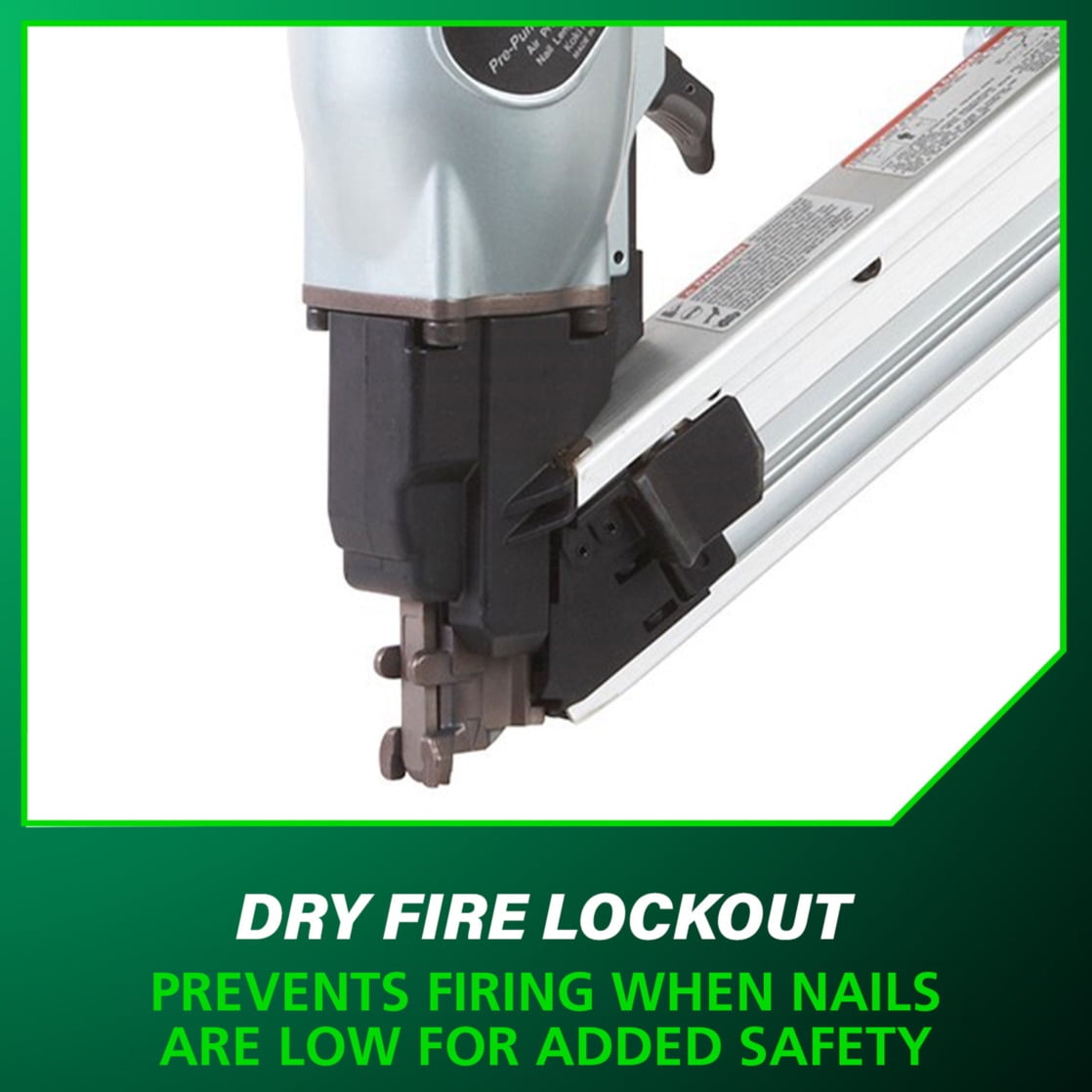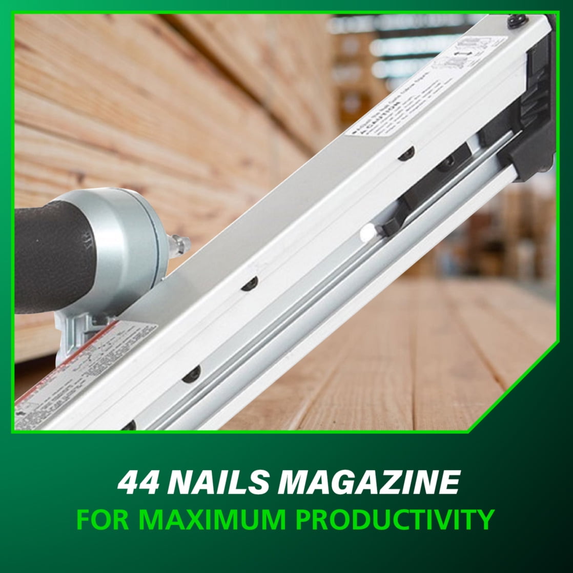APPLICATIONS: For fastening various types of pre-punched hole metal connectors to wood LIGHTWEIGHT: Only 6.4 lbs. for excellent maneuverability and less fatigue FASTENERS: Accepts 1-1/2 In. and 2-1/2 In. fasteners NAIL CAPACITY: Magazine can hold 44 nails EASILY PINPOINT LOCATION: Positive safety allows the tool to use the nail as a guide without damaging the collation TRIGGER: Sequential drive mechanism ensures precision nail placement along with a comfortable soft trigger covered with double-molded elastomer with AIR DEFLECTOR: Adjustable air deflector directs the air exhaust in any direction SAFETY: Dry fire lockout for assured nail placement