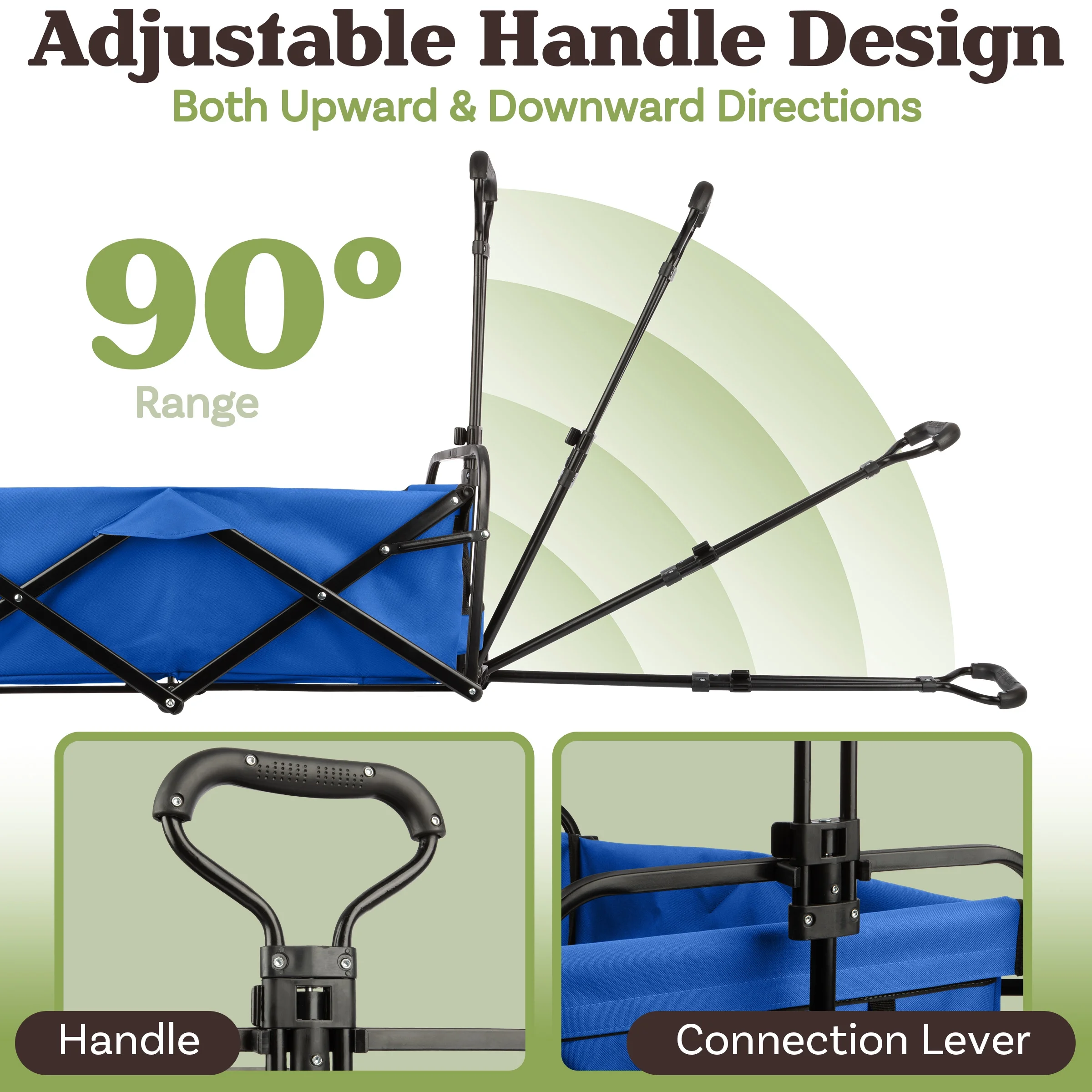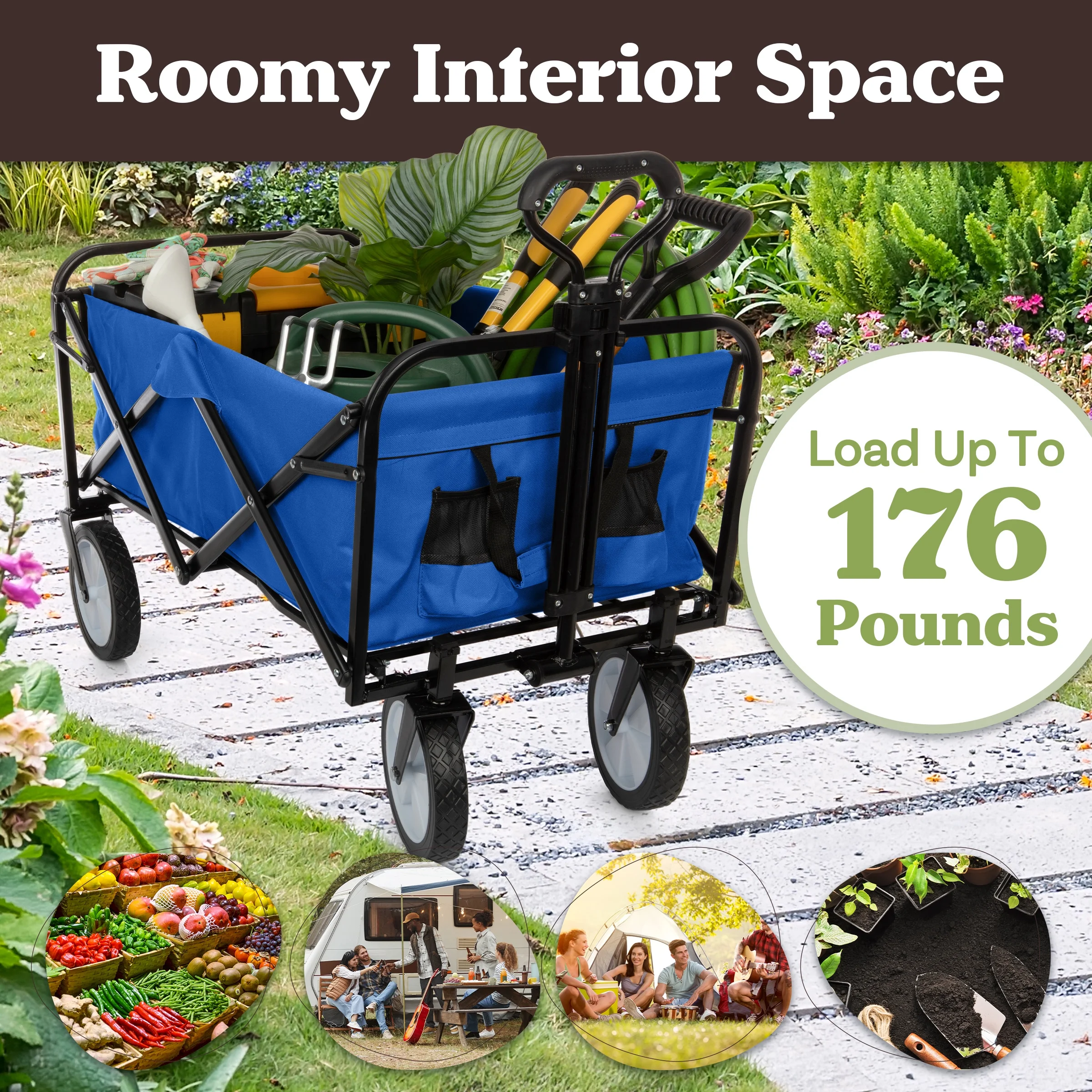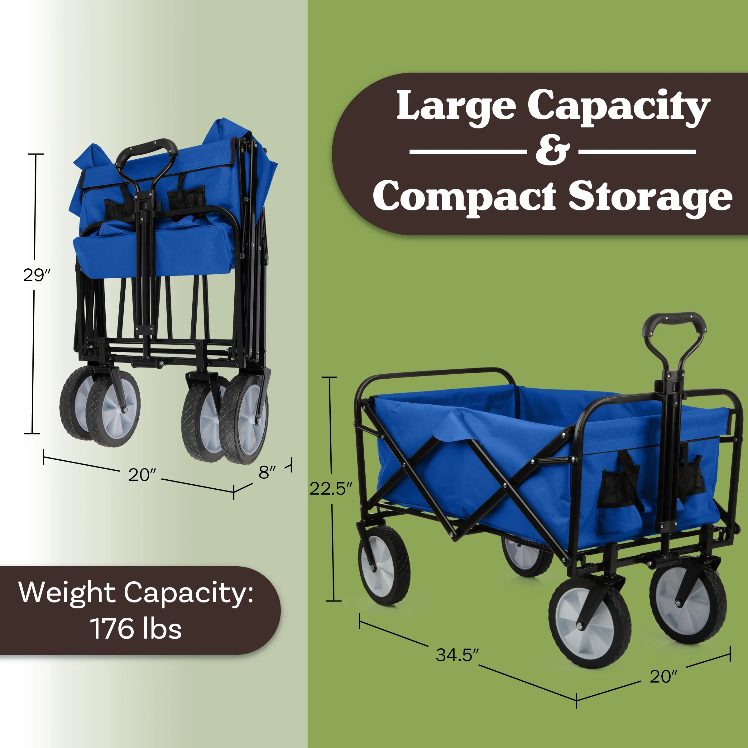 - PRODUCT DETAILS – Materials: Metal and 600D Polyester. Dimensions: (L) 34.5″ x (W) 20″ x (H) 22.5″. Folded: (L) 20″ x (W) 8″ x (H) 29″. Max Handle Length: 33″. Wheels: 8″ Diameter. 176 Pound Capacity. Not intended to carry children. Color: Blue.