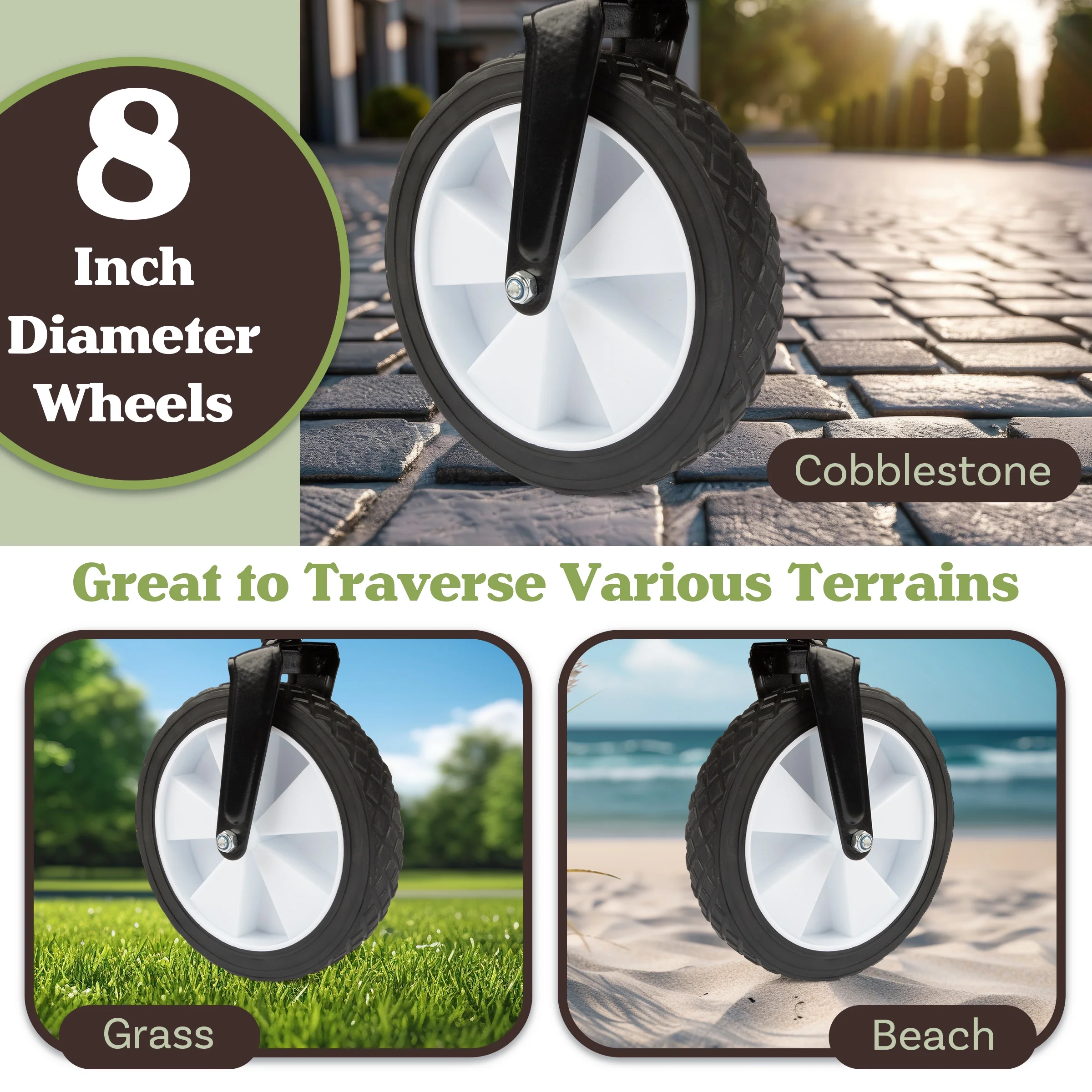 - ALL-TERRAIN – The wagon stroller has 8-inch wheels, giving it high clearance to protect from obstacles and make it suitable for any terrain, perfect in the garden or as a beach wagon. The front wheels also swivel 360 degrees for easy maneuverability.