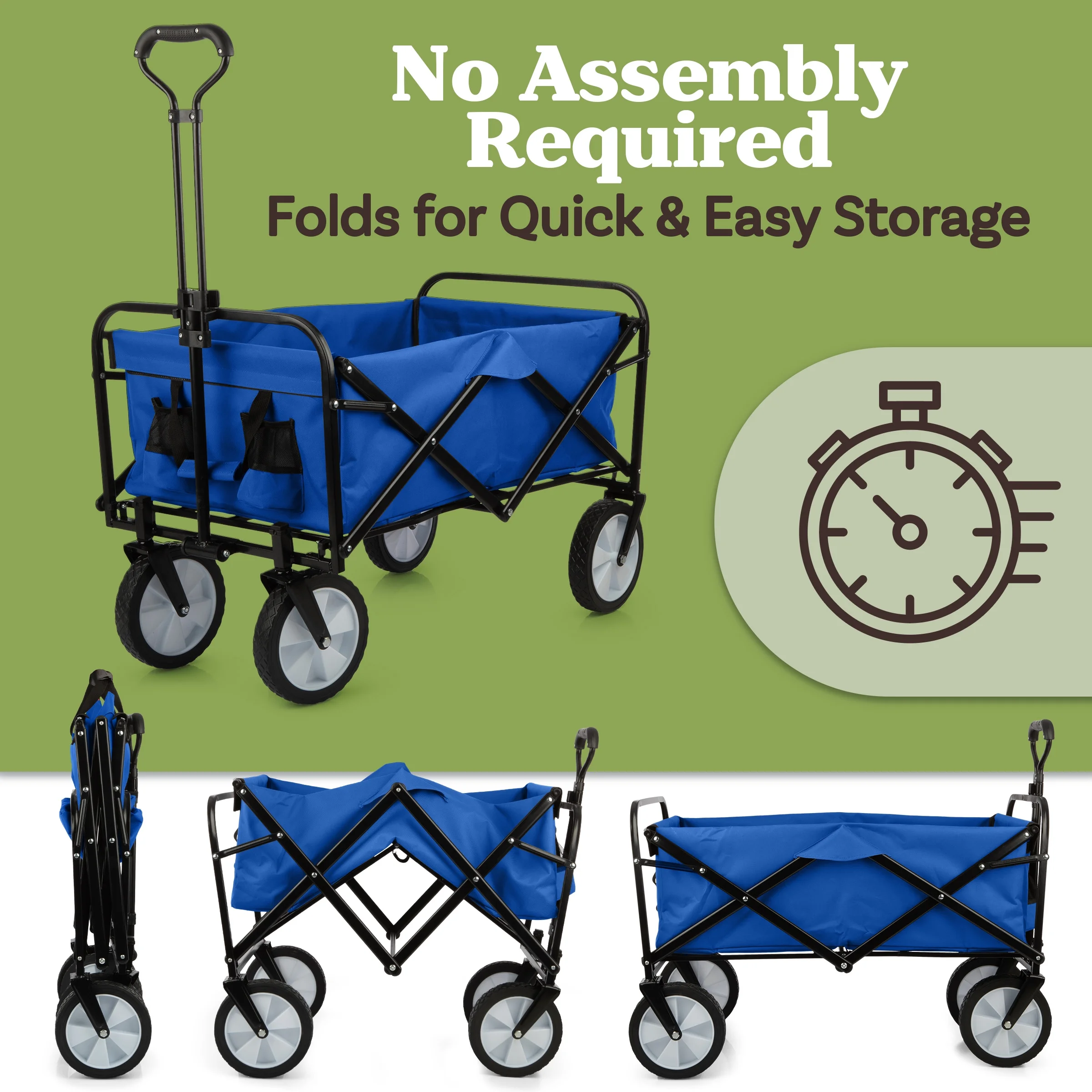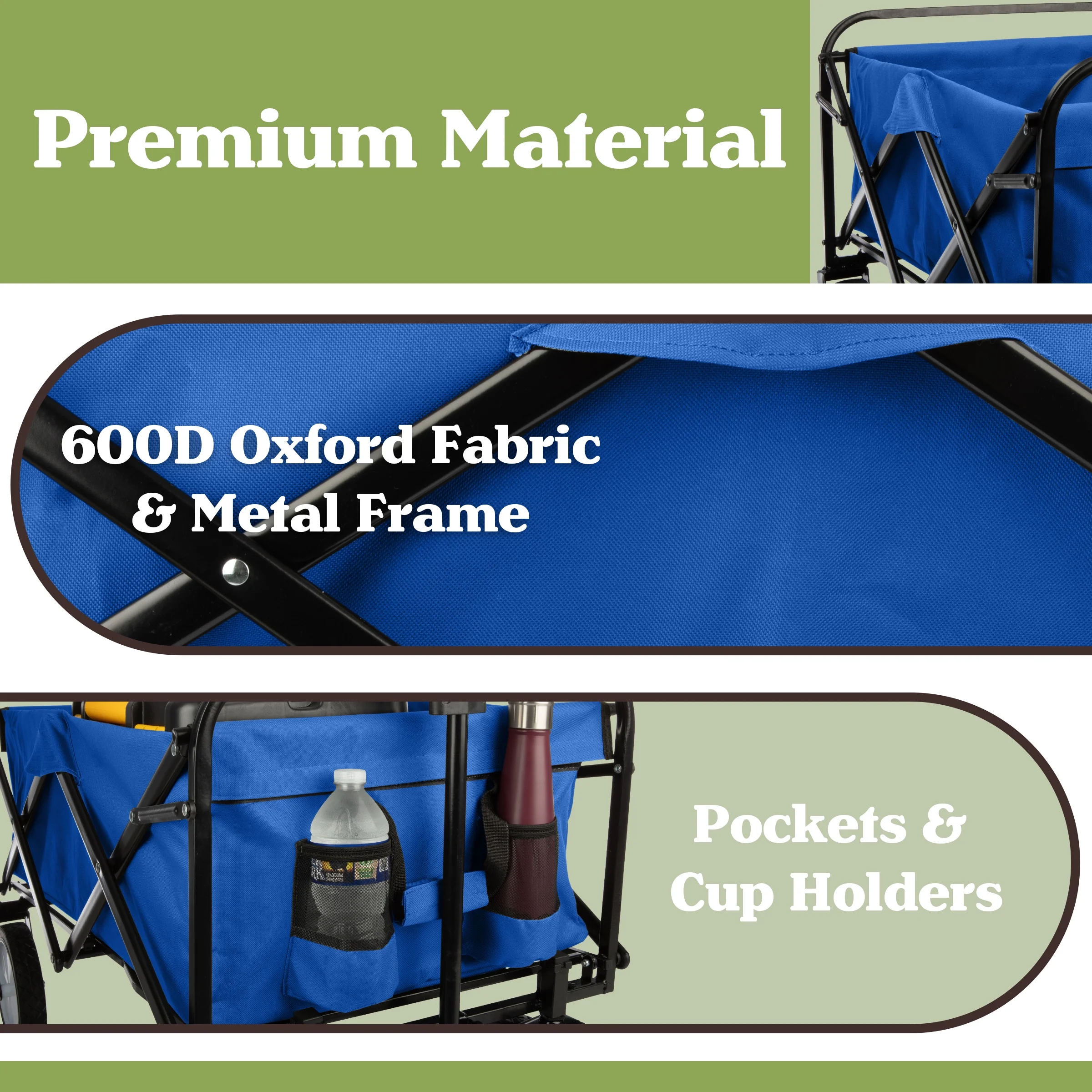 Carry everything you need for your next outdoor adventure with the Folding Multipurpose Utility Wagon by Wakeman Outdoors. When expanded, the wagon has a length of 34.5 inches and a 180-pound capacity, making it big enough to carry coolers, umbrellas and chairs to the beach, park or outdoor concerts. The handle telescopes to a maximum length of 33” to reduce strain on your back as you pull and has a locking mechanism to keep it in place when parked. The 8-inch tall wheels give the cart a high clearance to protect it from obstacles in your yard or on the beach and swivel 360 degrees for easy maneuvering. The steel frame is powder coated to resist rust and corrosion. This folding cart collapses in seconds by pulling the tab in the middle of the wagon bottom. SATISFACTION GUARANTEED- Wakeman Outdoors is committed to providing the consumer with the absolute best price and value on all of our products, which we ensure by applying a rigorous quality control process. NOTE: This is an exclusive product of Wakeman Outdoors and ONLY Folding Camp Wagons by Wakeman Outdoors are GUARANTEED to be genuine IMPORTANT: Avoid buying counterfeit products and transacting with unauthorized sellers. Look for our logo on the packaging for every one of our products. Wakeman Outdoors is a registered trademark protected by U.S. Trademark law and will be vigorously defended. COLLAPSIBLE- This wagon collapses in seconds with a pull of the tab in the middle of the bottom. There is no need for disassembly. The compact dimensions when folded make it able to be stored in small places or hung on a wall to free up floor space. ALL TERRAIN- The wagon has four 8-inch diameter wheels that give the cart a high clearance to protect it from damage from obstacles in your yard or on the beach. The wheels also swivel 360 degrees for maneuverability around corners and objects. DURABLE- The 100% 600D polyester body of this wagon spot cleans easily with a soft, damp cloth so that it can be ready for your next outdoor adventure and resists snagging. The steel frame is powder coated to protect it from rust and corrosion. 180 POUND CAPACITY- This cart has a 180-pound capacity, making it great for carrying everything from coolers, folding chairs, landscaping tools, sports equipment or groceries. The two mesh cupholders keep drinks handy while traveling. PRODUCT DETAILS- Materials: Steel and 600D Polyester. Open Dimensions: 34.5” L x 20” W x 22.5” H. Collapsed Dimensions: 20” L x 30” H x 8” W. Max Handle Length: 33”. Wheel Dimensions: 8” D x 1.5” Thick. 180 LB Capacity. Not intended to carry children.