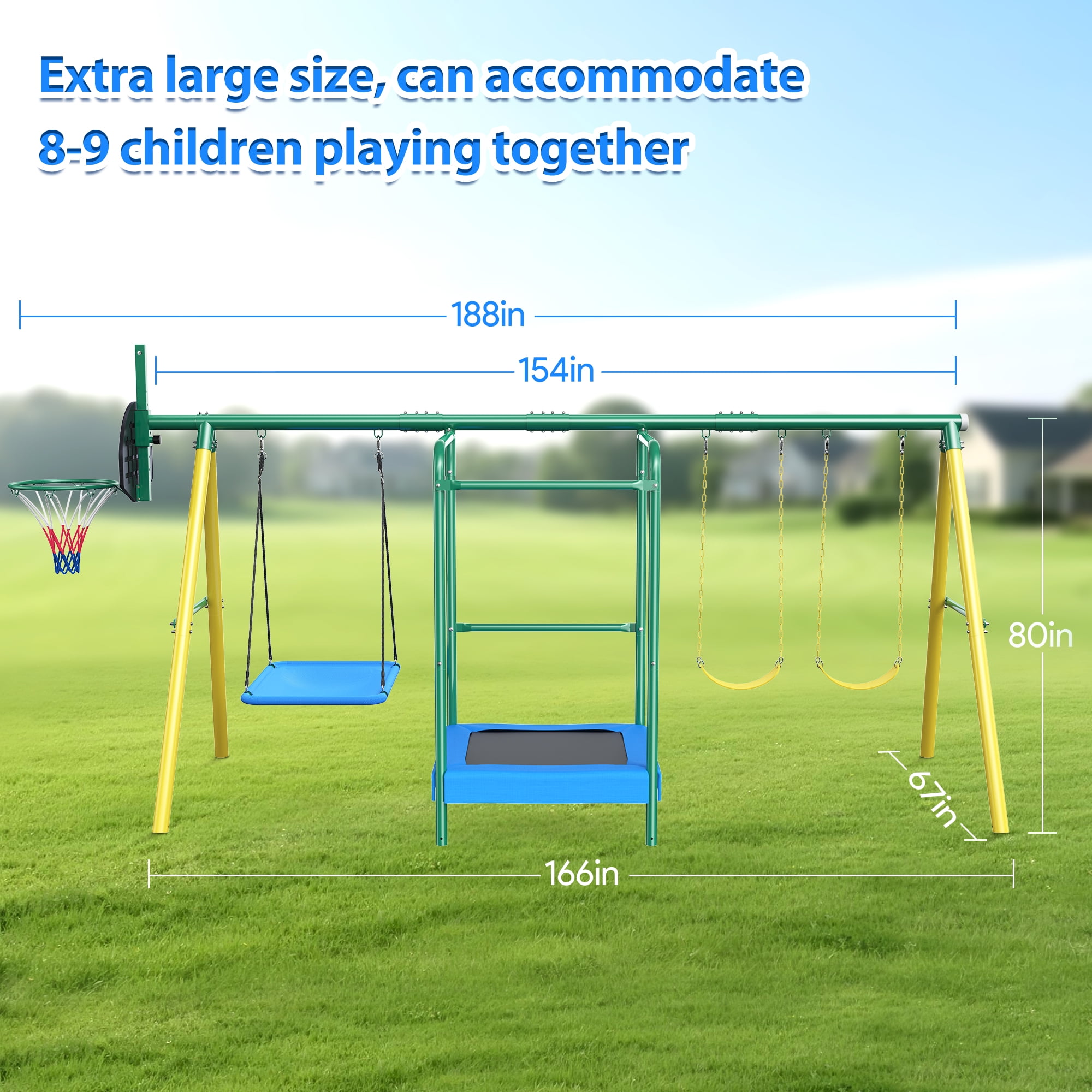 Metal Swing Sets for Backyard,Heavy-Duty Outdoor Kids Playsets for Playground,Outside Toys with Trampoline, Platform Swing, 2 Swings and Basketball Hoop for Aged 3-12 Color:Green Product Dimensions:166″D x 67″W x 80″H Frame Material:Metal Assembly Required:Yes Item Weight: 123 Pounds Maximum Weight Recommendation: 440 Pounds Maximum number of compatible seats:4 Three reasons to choose our swing sets –Sturdy and Stable: Metal swing sets are generally more durable and long-lasting than other materials such as wood or plastic. Our swing sets are made from high quality metal and are structurally sturdy to withstand harsh weather conditions. –Versatility: Featuring a trampoline, basketball hoop, platform swing and two small swings. Vibemo offers more entertainment options than other swing sets. –Personalise: Platform swing and small swings can be replaced with other swing accessories. You can DIY your own unique swing sets according to your needs.
