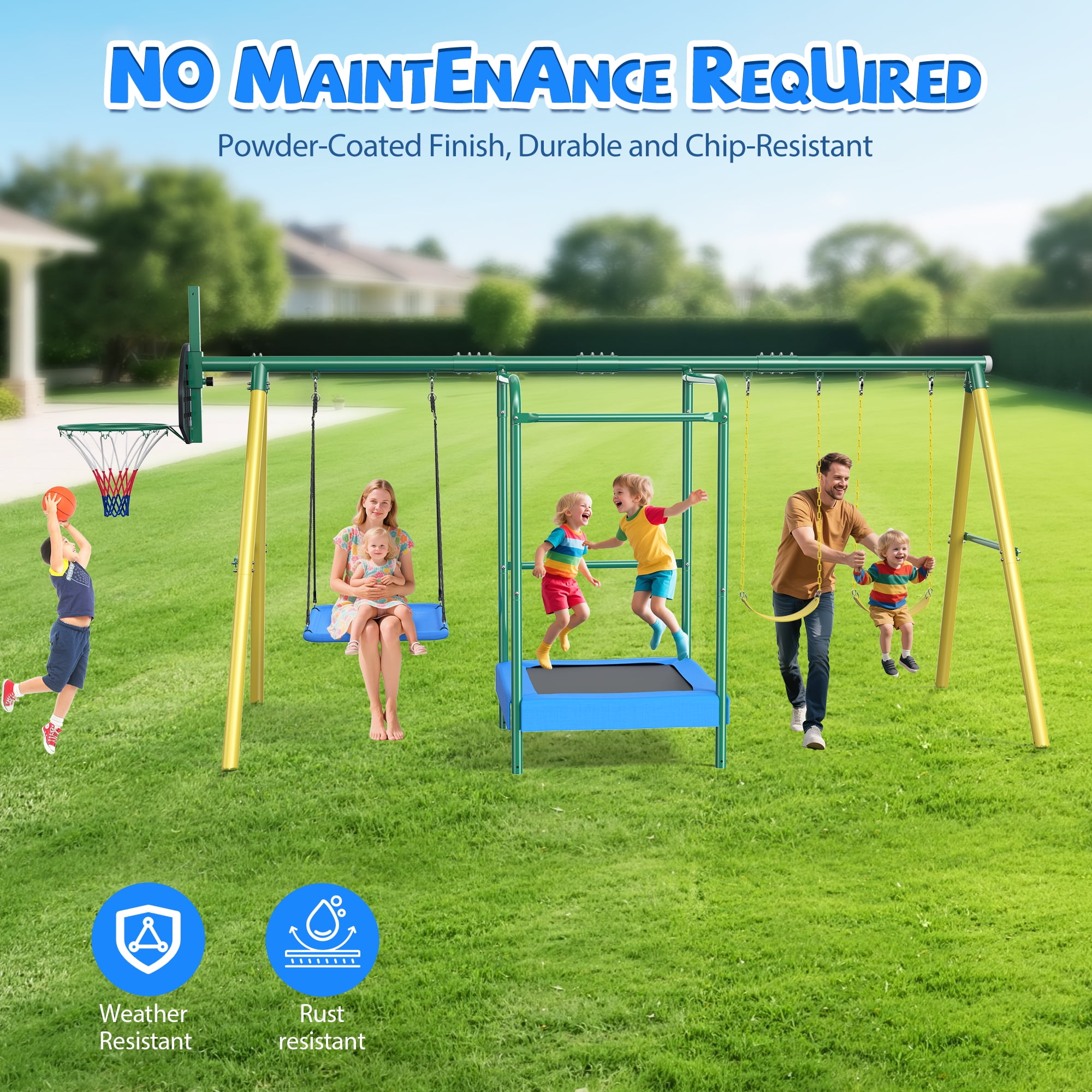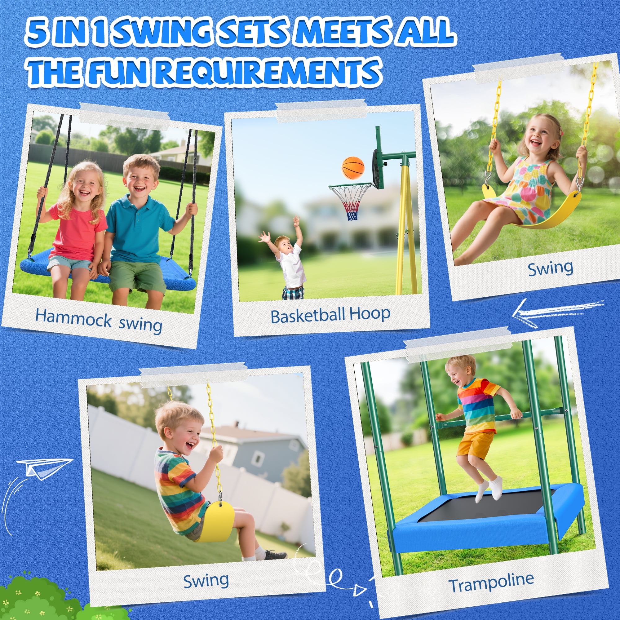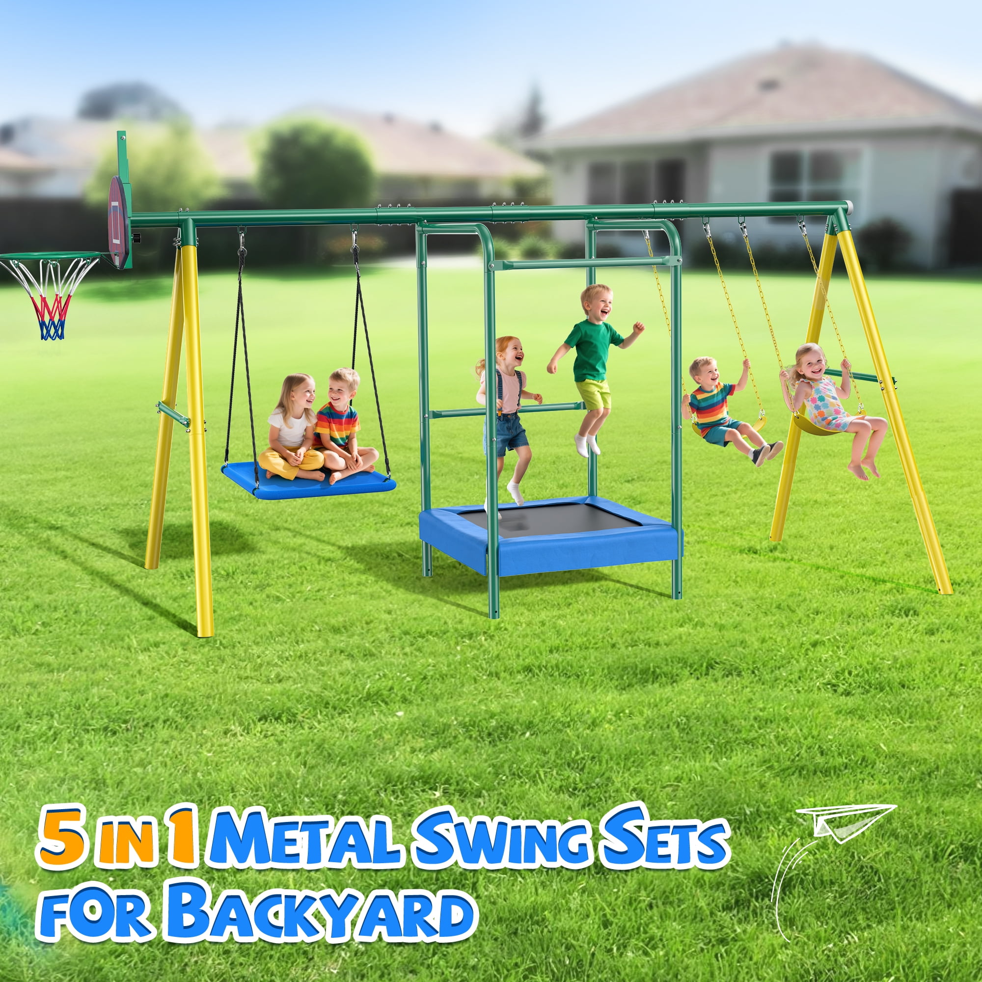 Metal Swing Sets for Backyard, Heavy-Duty Outdoor Kids Playsets for Playground,Outside Toys with Trampoline, Platform Swing, 2 Swings and Basketball Hoop for Aged 3-12