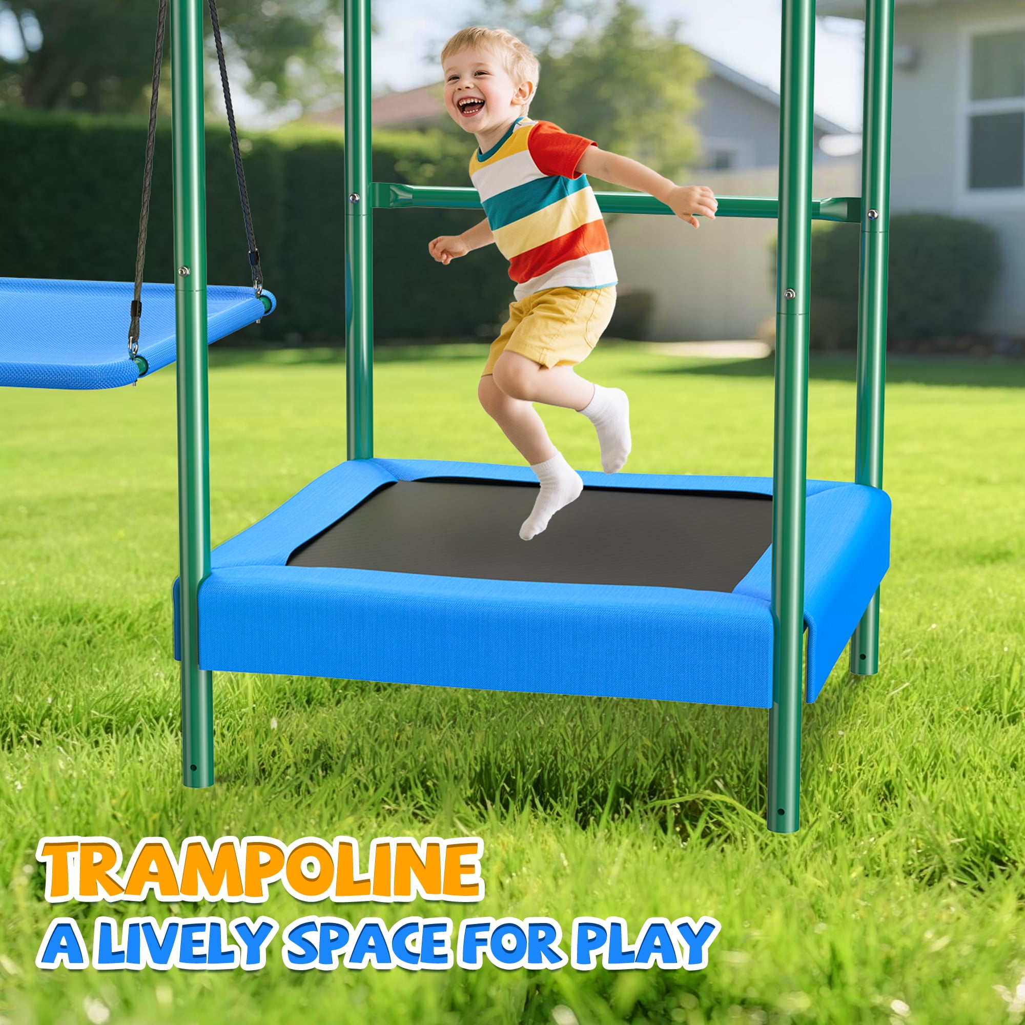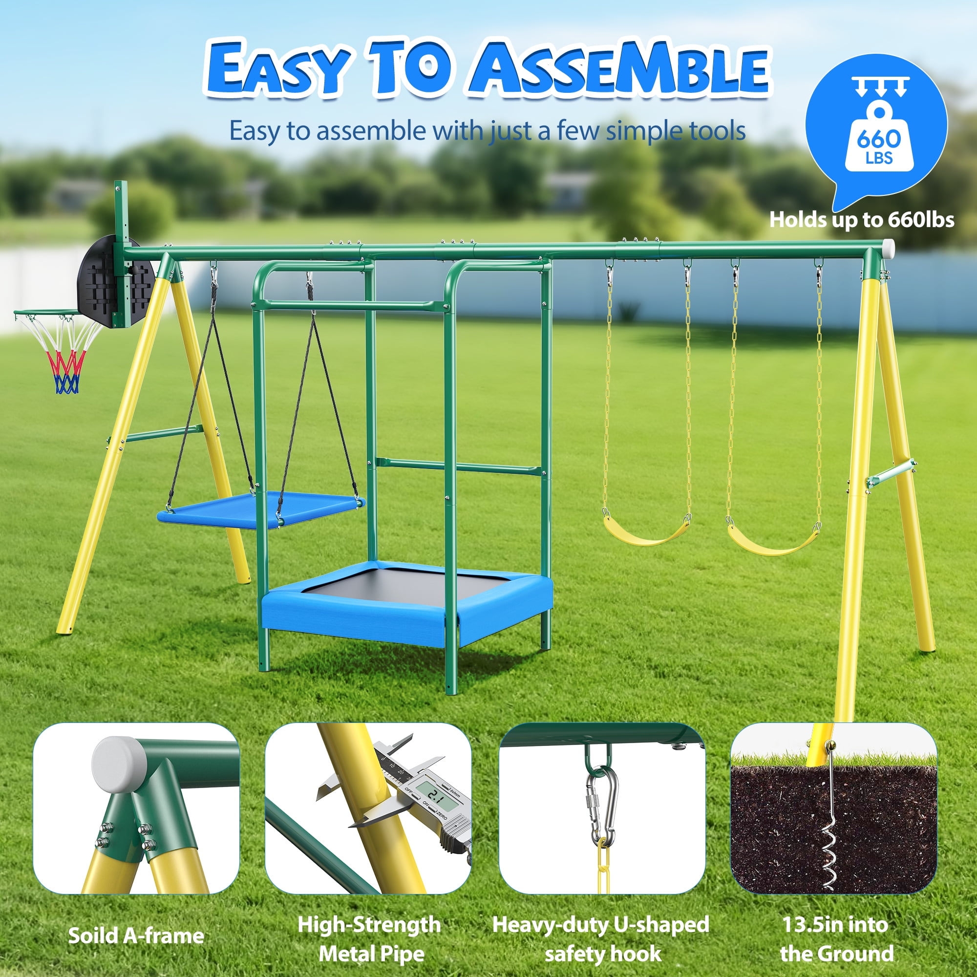 [OUTDOOR FUN] Swing set is feature packed with a trampoline, a platform swing, 2 single swings, and a basketball hoop [PERFECT FOR YOUR KIDS] Both swings are height-adjustable to accommodate growing kids. Rubber coated swing chains protect kid hands. [ HEAVY DUTY] Swing set is crafted from 2-inch heavy duty weather-resistant steel tubes, with welded joints and A-Frame design that provides strength and stability. Powder-coated paint finish adds to durability and long-lasting use. [ASSEMBLED DIMENSIONS] Swing set measures 11.1’L x 8.3’W x 6.1’H (adult assembly required)[SAFE DESIGN] Swing Set meets or exceeds all ASTM safety standards. Also, frame legs are foam-padded for additional safety. Age range: 3 to 8 years old. [BONUS] 4-piece anchor kit secures swing set to the ground for extra safety and stability [OUTDOOR FUN] Swing set is feature packed with a trampoline, a platform swing, 2 single swings, and a basketball hoop [PERFECT FOR YOUR KIDS] Both swings are height-adjustable to accommodate growing kids. Rubber coated swing chains protect kid hands. [ HEAVY DUTY] Swing set is crafted from 2-inch heavy duty weather-resistant steel tubes, with welded joints and A-Frame design that provides strength and stability. Powder-coated paint finish adds to durability and long-lasting use. [ASSEMBLED DIMENSIONS] Swing set measures 11.1’L x 8.3’W x 6.1’H (adult assembly required). [SAFE DESIGN] Swing Set meets or exceeds all ASTM safety standards. Also, frame legs are foam-padded for additional safety. Age range: 3 to 8 years old. [BONUS] 4-piece anchor kit secures swing set to the ground for extra safety and stability