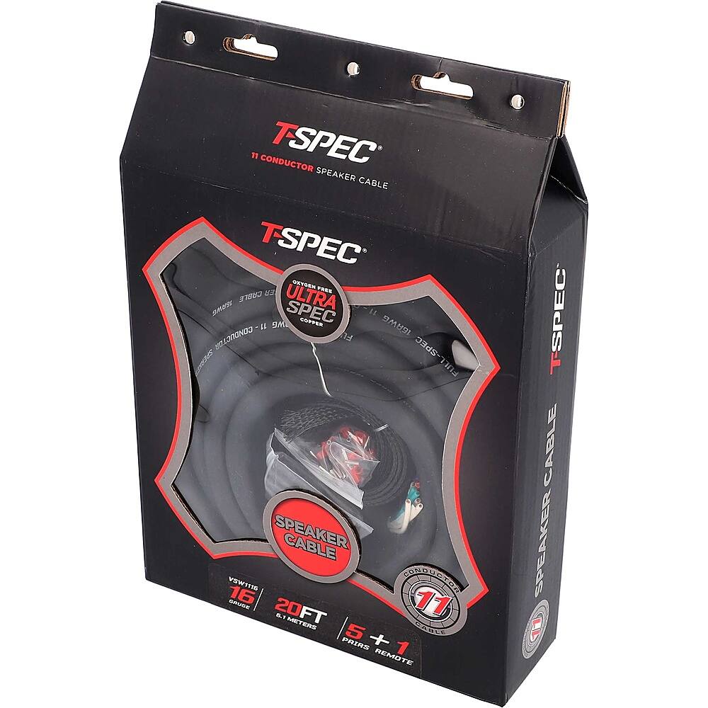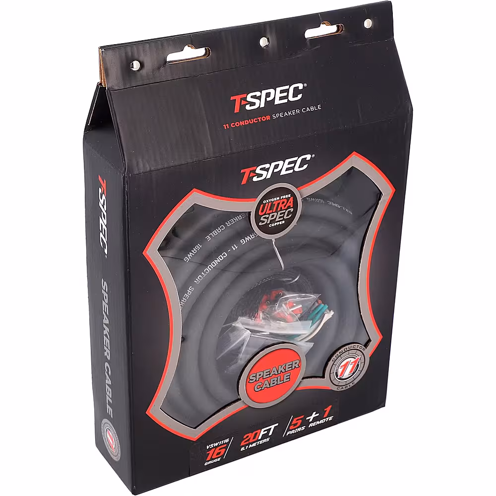 Upgrade your vehicle’s audio setup with this 11-conductor T-Spec 16-gauge speaker cable kit. The 20-foot length provides ample coverage and flexibility, while the braided cable cover resists wear and tear for lasting use. This T-Spec 16-gauge speaker cable kit includes a heat shrink jacket to protect termination points and labels for easy identification.