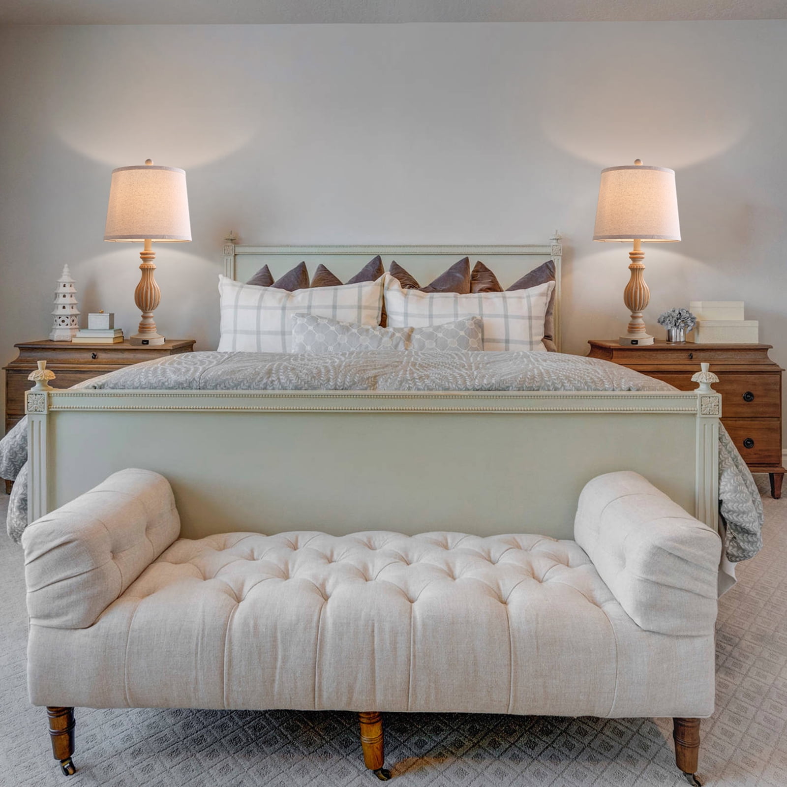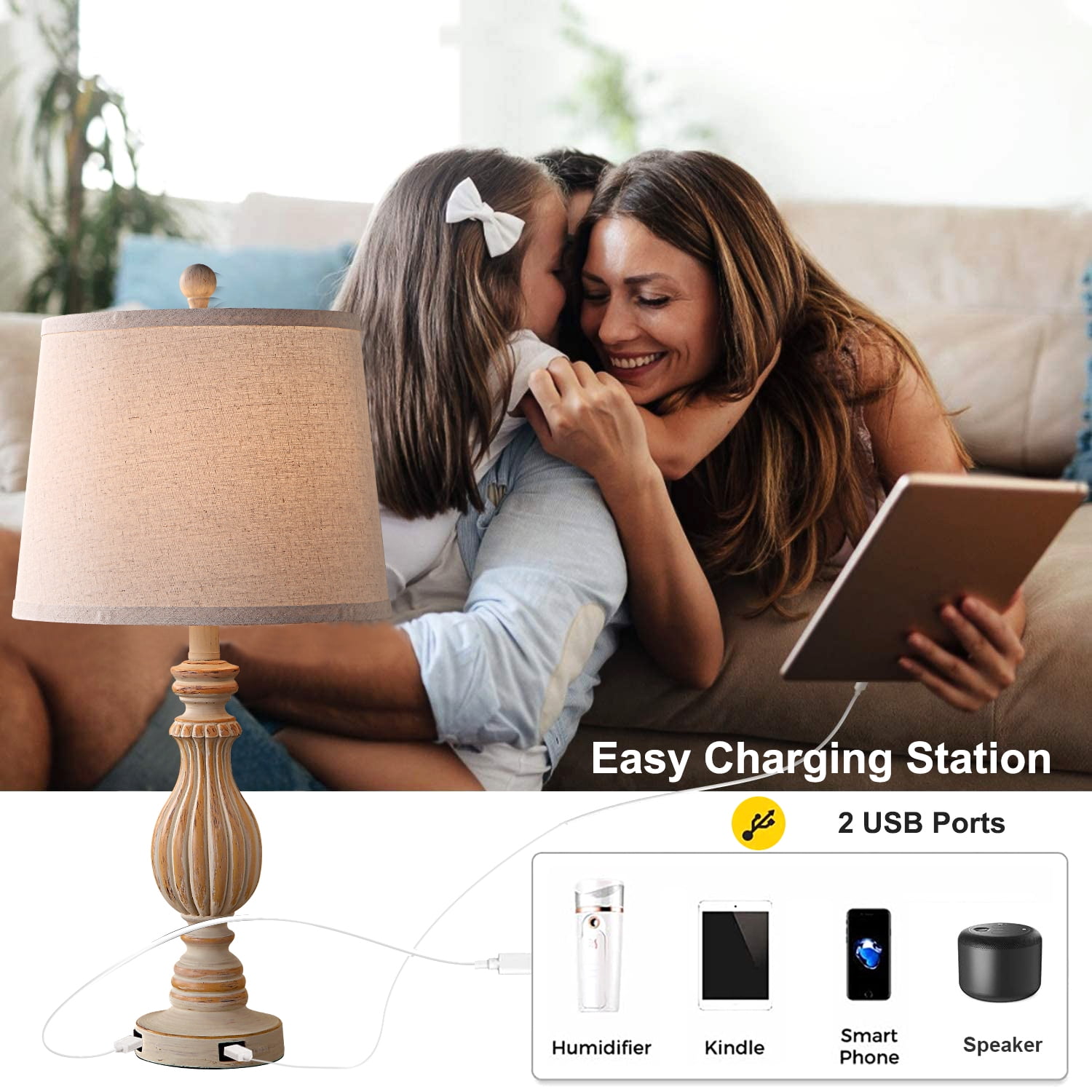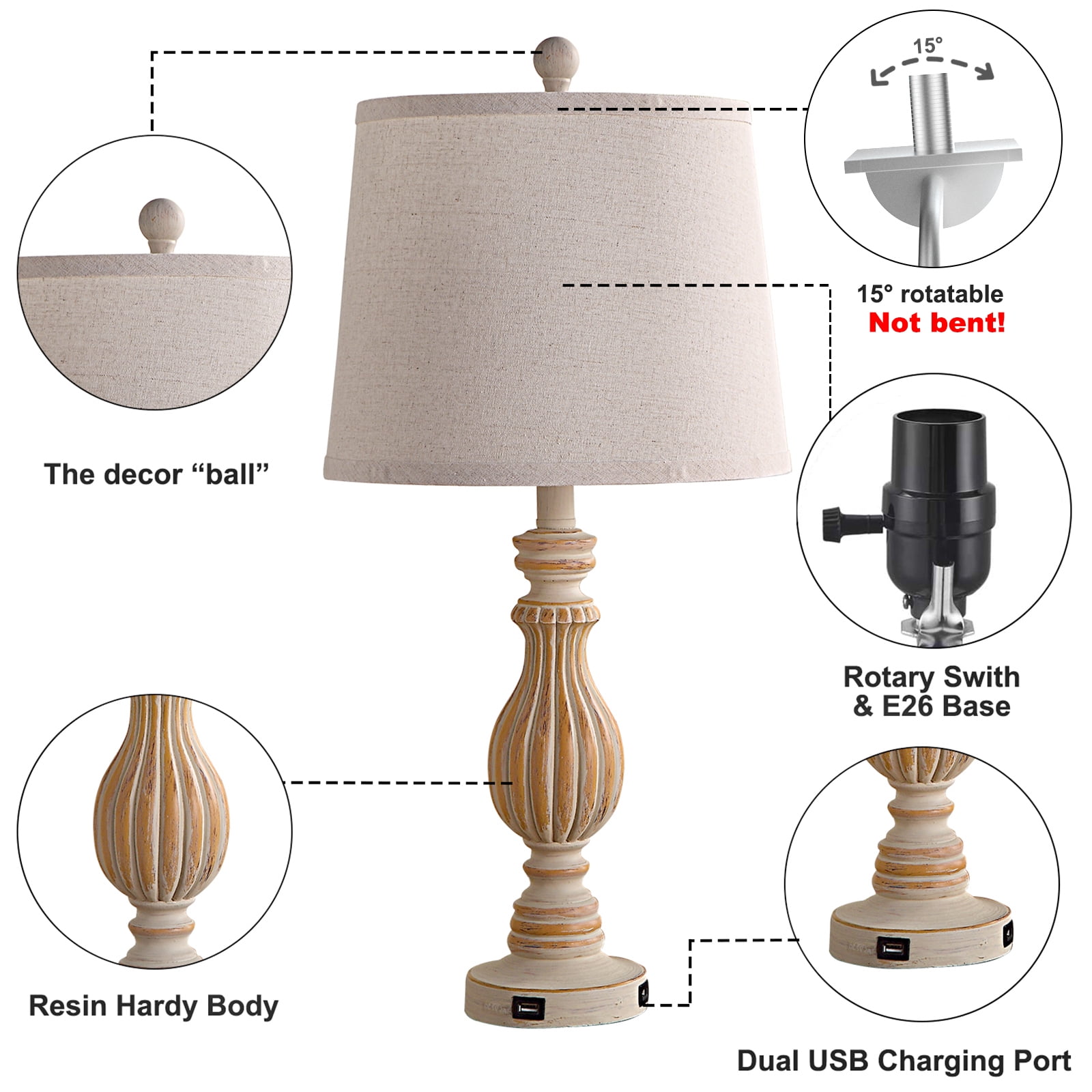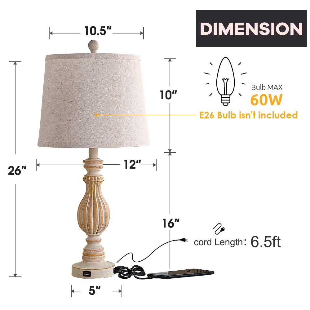 Offer Retro Charm: This vintage table lamp set designs with resin body and fabric shade, creates romantic, warm, cozy atmosphere. The rustic look goes well with any room styles such as minimalist, industrial, modern ,vintage style and so on. It’s great to be used as bedroom lamps, bed lamps, living room lamps, nightstand lamps, reading lamps, kid’s room lamps, etc. USB Ports For Convenient Charging: Each lamp has 2 useful 5V/2.1A USB Ports which allow you to charge your cell phone, iPad, Kindle, or other electronics within your arm’s reach, regardless of the lamp is on or off. It is a great design that saves you from the trouble of not having enough wall sockets to charge multiple devices at the same time and makes your life more convenient. Bulb Requirements and Dimension: Bulbs are not lincluded. This nightstand lamp set have E26 bulb bases, which compatible with variety of incandescent lamps, Edison, LED, CFL and halogen bulbs (MAX 60W). The height of this vintage table lamp is 26″, which is a perfect size for a bedside nightstand lamp. Installation Instructions & After-Sale Service: Instructions included, super easy to assemble. Please check all the contents carefully before installation. Any accessories missing or damaged parts please contact us directly and we will get back to you as soon as we can within 24 hours.