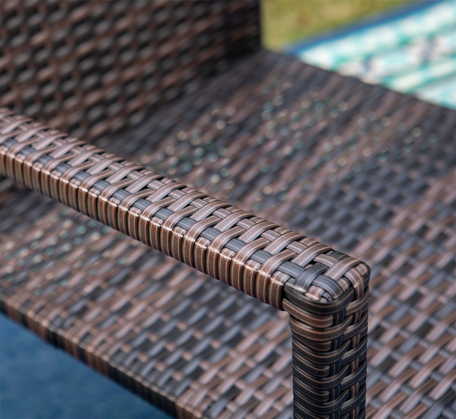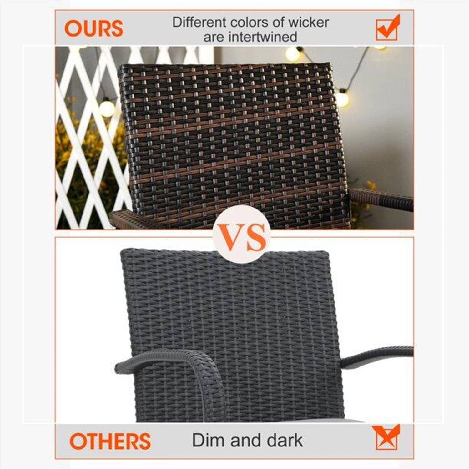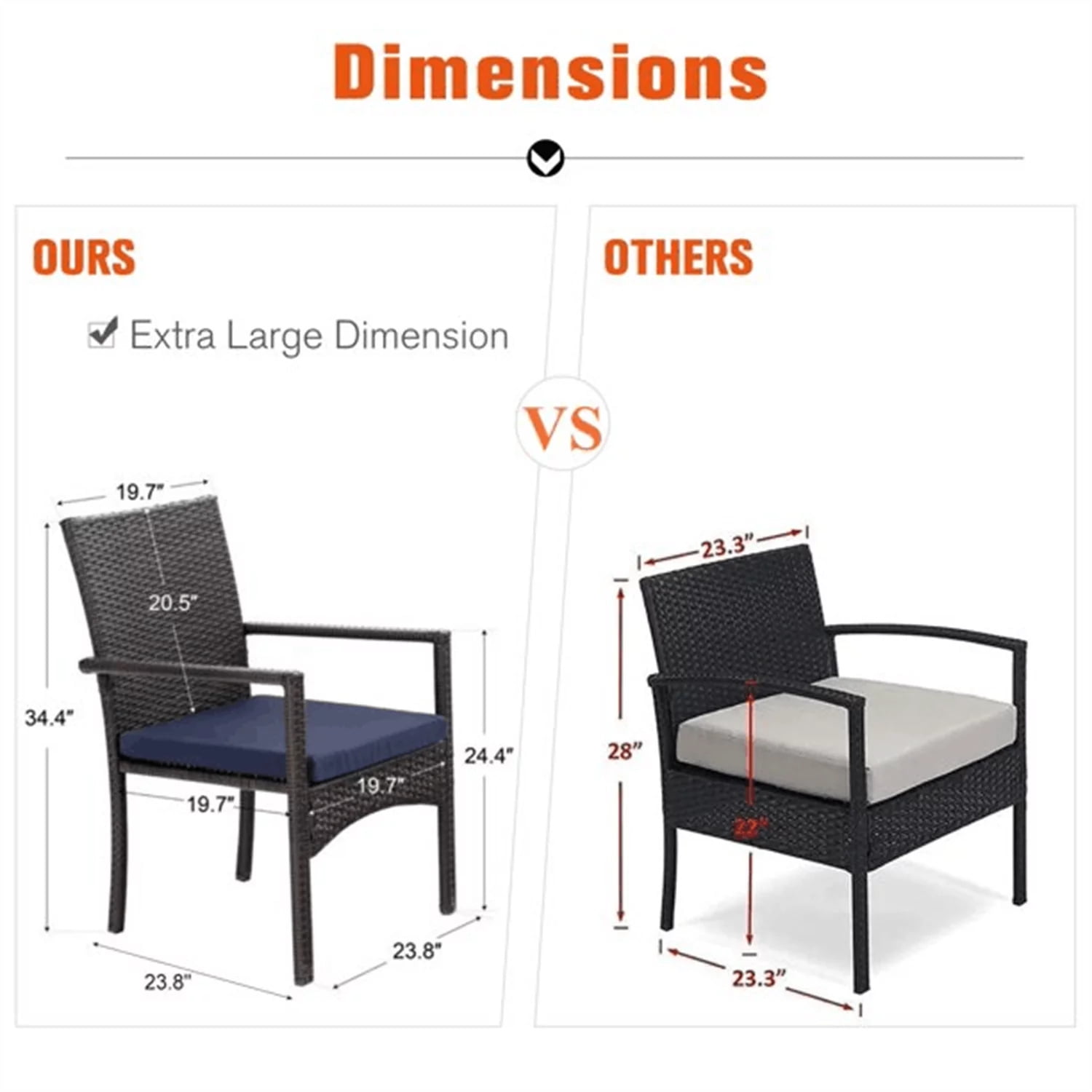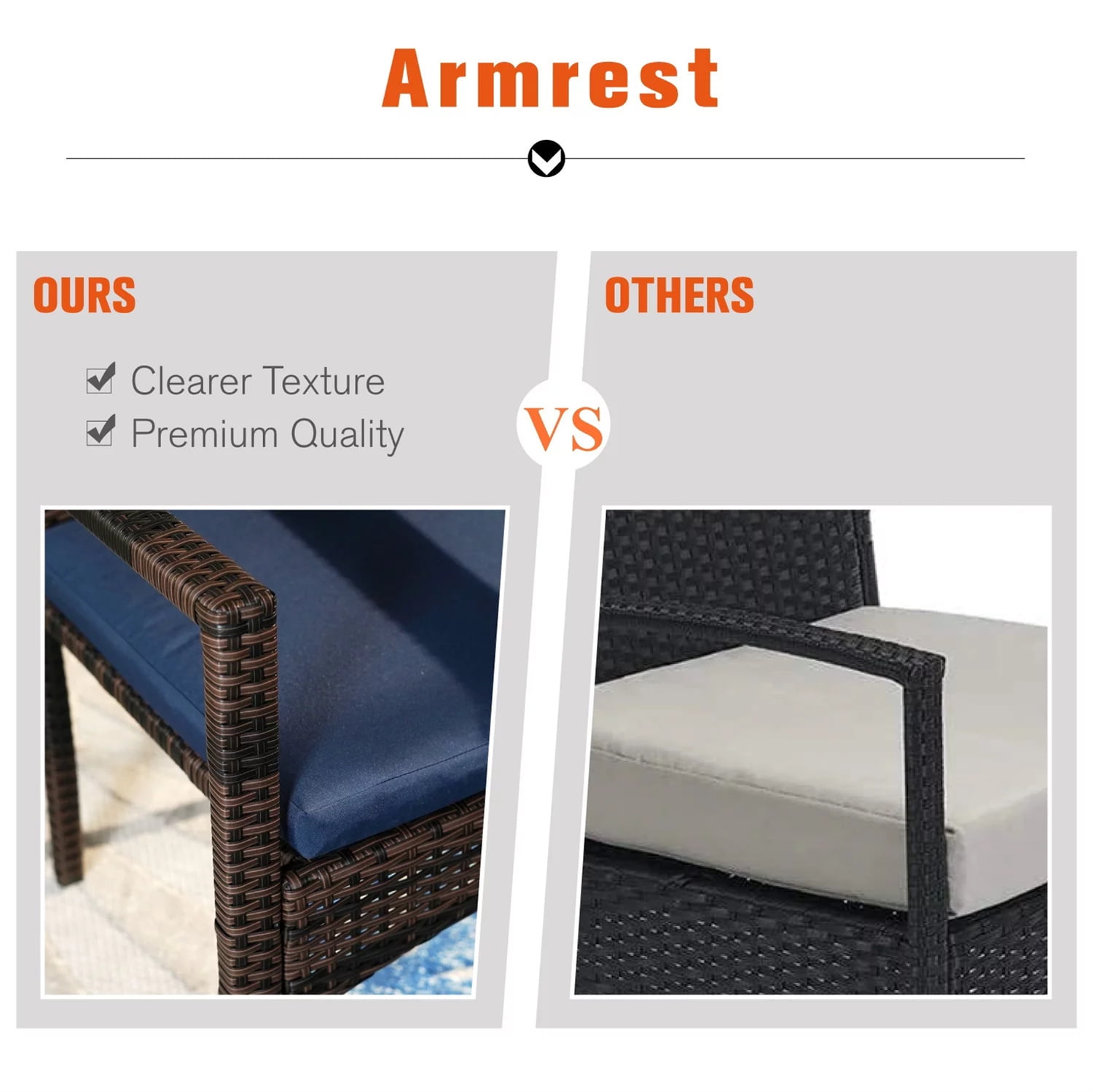 【Premium Material】This outdoor patio dining chair is made of high-quality steel frame with excellent E-coating finish and selective tightly woven PE rattan which offers supportive structure and stands up to outdoor elements for reliable long-lasting strength. 【Appealing Design】This armchair features clean lines, premium resin wicker back, exquisite powder-coated slatted shape and navy blue cushion that is perfect in shape and function which will certainly bring your outdoor decor to the next level. 【Energy&Comfort】This outdoor dining chair is perfect for family outdoor party&dinner. Reclining chair back can make you feel better when you lean back on your chair. The extended arm of our chairs provides you extra space, you can rest your arm on it. 【Durable Fabric】 The seat cushion is fulled with high-density foam for great comfort. Superior fade-resistant 100% polyester fabric for long wear and durability. 【Occasions】This set of 2 outdoor chair goes well with various home styles, perfect for your family/friends gathering, party, dinner, conversation and other activities. 【1 Year Warranty】We offer a guaranteed 1-year warranty, For customer support, questions and concerns, please contact Customer Service at [email protected] or dial our free service line, 877-606-2818. We promise to respond to any customer message within 24h.