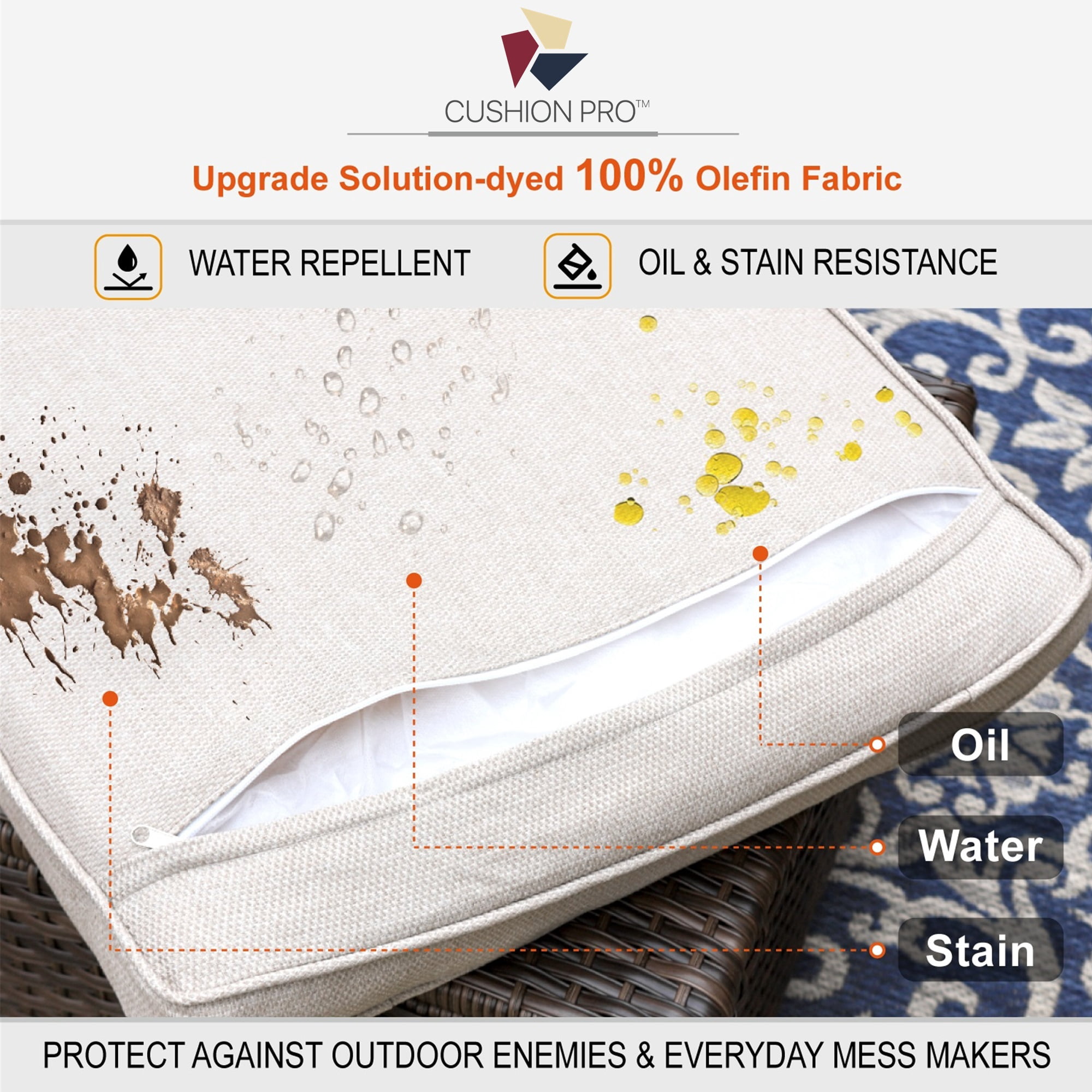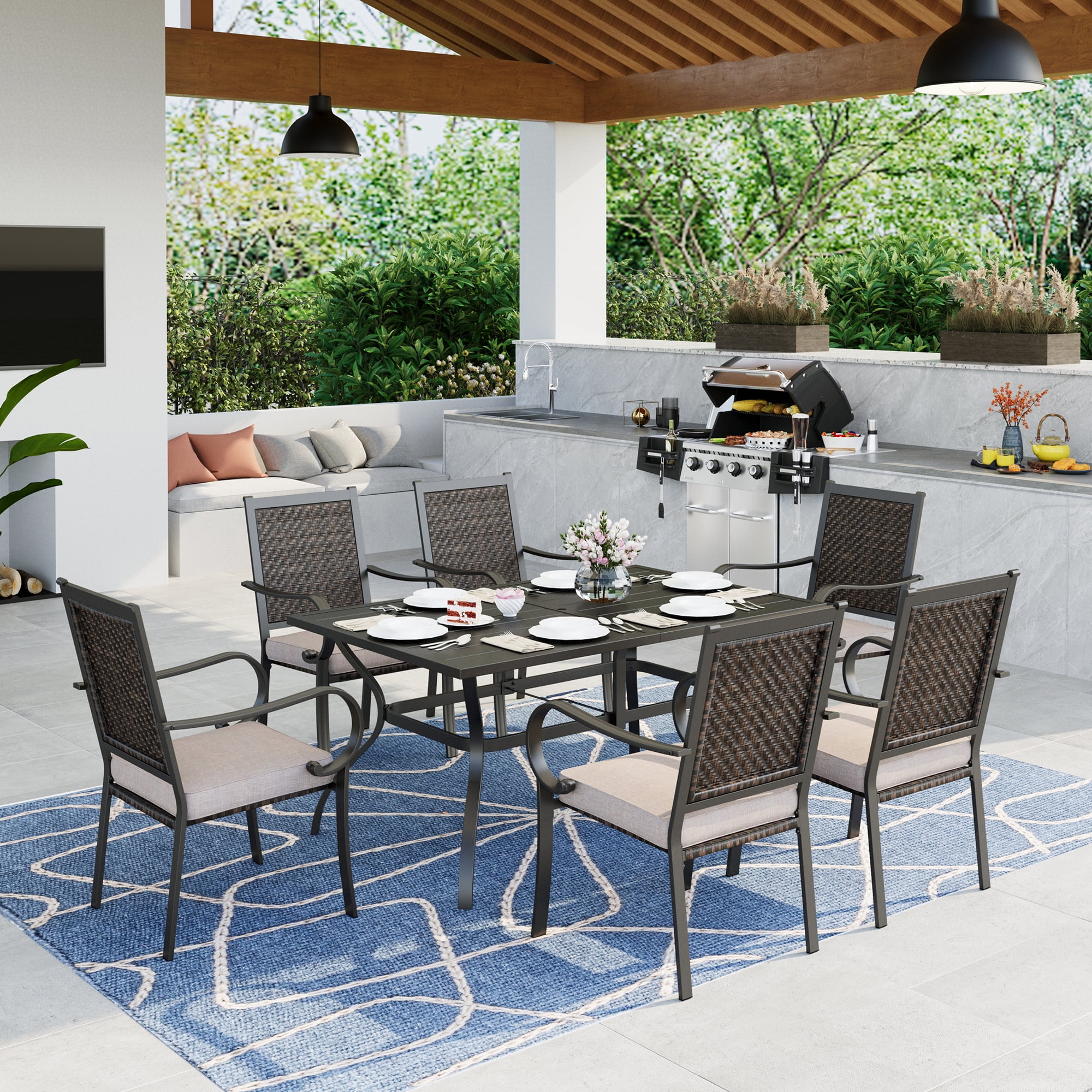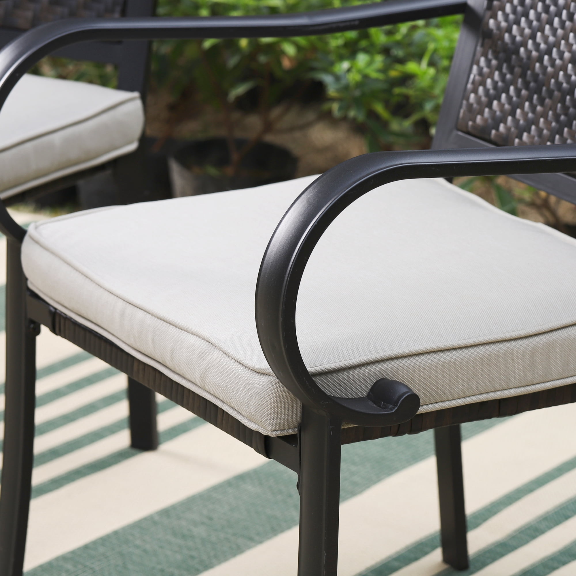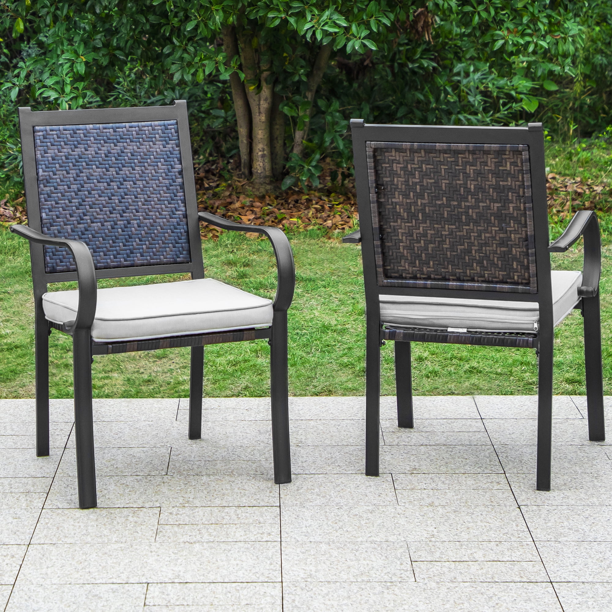 Power-coated steel frame wrapped with all-weather rattan, sturdy and light Heavy duty steel frame treated with coating for weather-resistant and corrosion-resistant Weather resistant PE rattan is great for indoor and outdoor use Support up to 350 lbs, suitable for all size people The seat and back of chairs are made of tightly woven weather-resistant rattan, UV & fade resistant Padded with removal high density cushion, soft and comfortable, making you feel relaxed for a long time seating Removal cover with zipper, water-repellent and machine washable