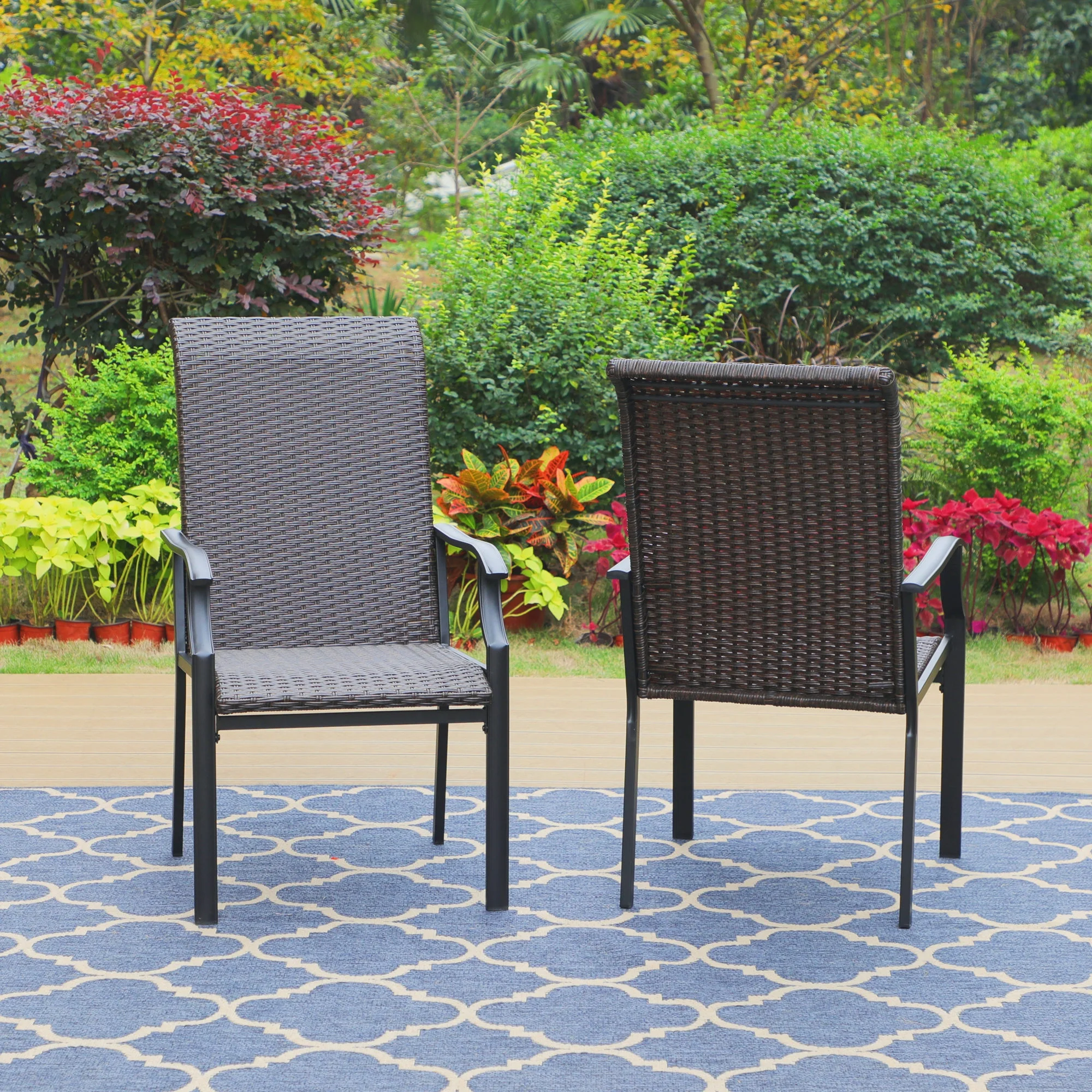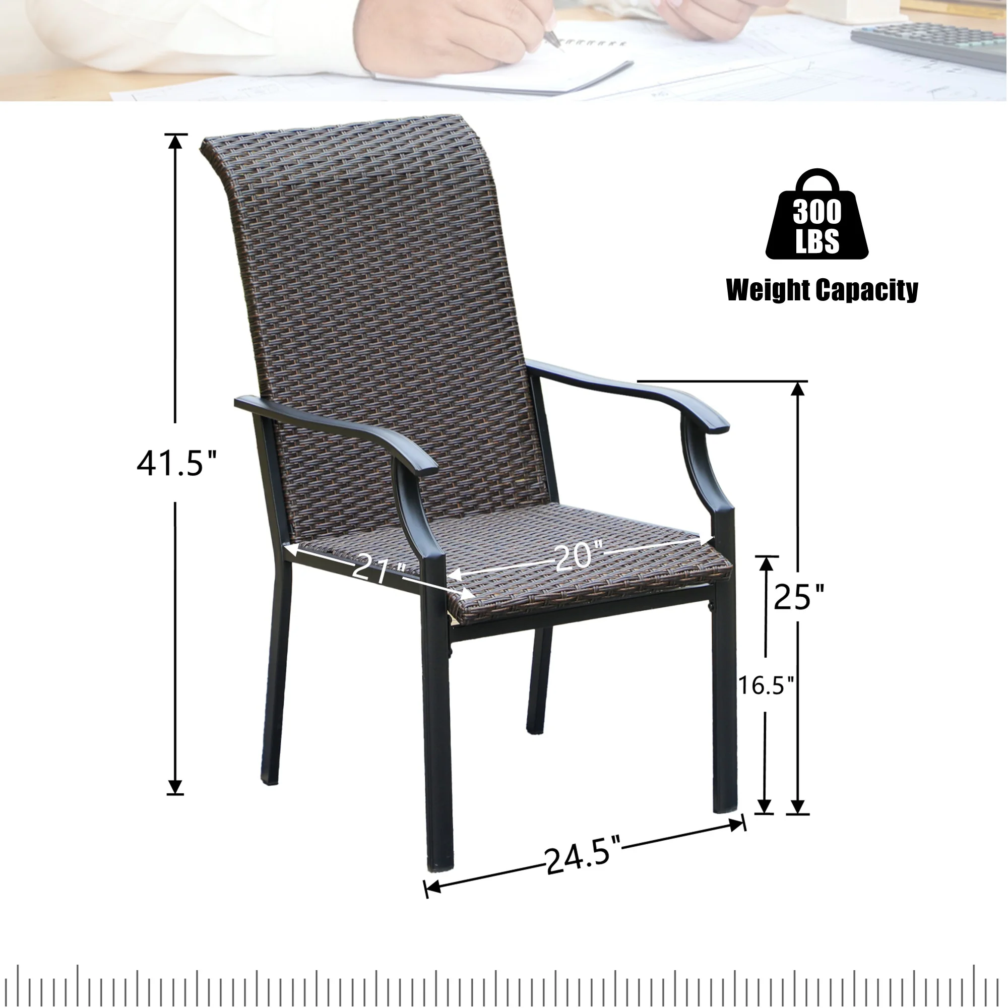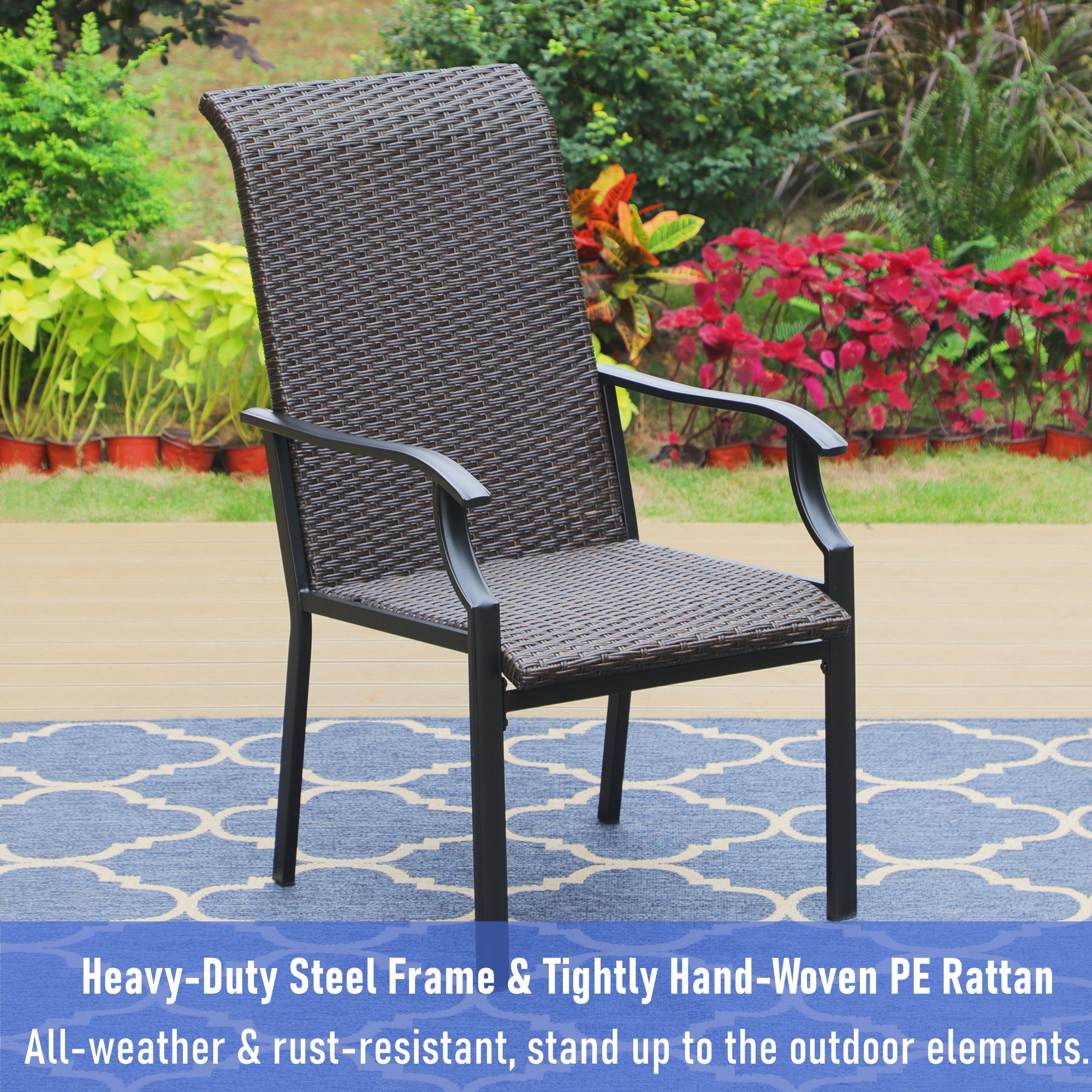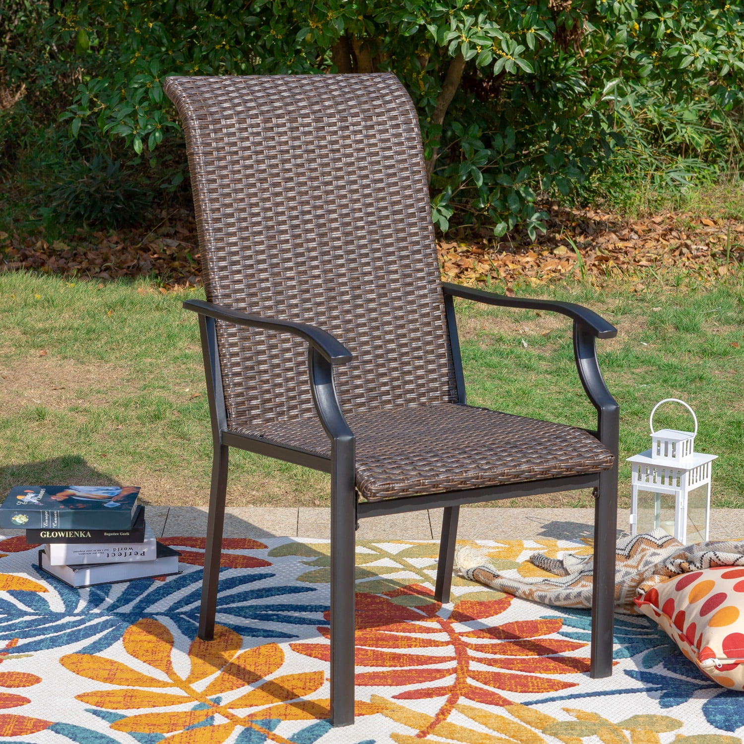 Set the foundation for a laid-back alfresco space by adding a pair of patio chairs, perfect picks for kicking back and soaking up the sun. This MF Studio high-back wicker chair is ideal for your family/friends gathering, dinner, party, conversation, party and other activities. The heavy-duty constructed metal steel frame is powder-coated to protect it from rust and tightly hand-woven PE rattan stands up to poor weather conditions for reliable long-lasting. The weaved rattan seat takes the shape of your body when you sit down, cradling your weight evenly and the 42″ high-back design extends more comfort & relax to your shoulder & neck. This is something that also improves as time goes by, as the weave loosens over time to provide even more comfort. Create your own outdoor oasis and patio season with MF studio that will be so much more than the occasional happy hour. Specification Overall Size: W 24.5″ x D 31.5″ x H 41.5″ Seat Dimension: W 20″ x D 21″ Seat Height: 16.5″, Armrest Height: 25″ Color: Dark Brown Rattan & Black Metal Frame Weight Capacity: 300 lbs