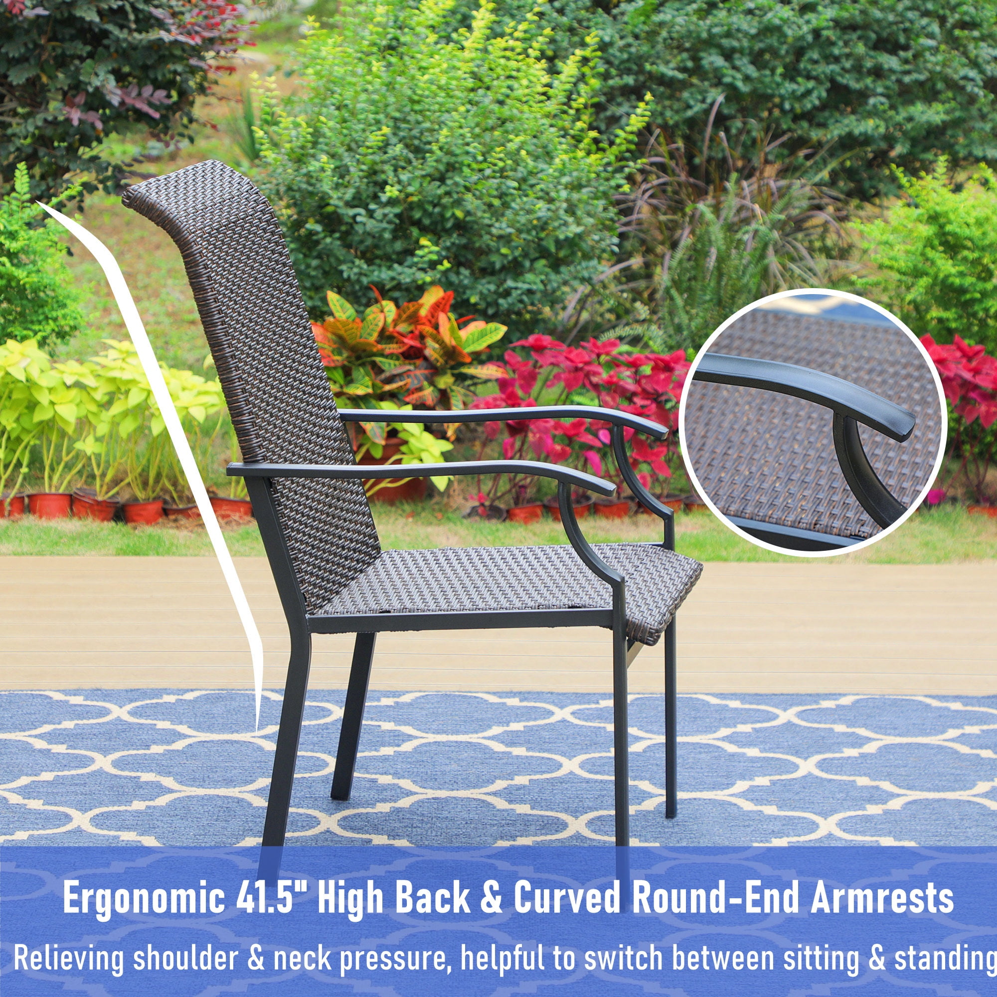 Made of heavy-duty steel frames with powder-coated finish, the chairs offer supportive structure and stand up to outdoor elements for reliable long-lasting strength. Tightly hand-weaved rattan seat takes the shape of your body when you sit down, cradling your weight evenly and remains cool to the touch in hot weather and warm to the touch in cold weather. 42″ high-back design extends more comfort & relax to your shoulder & neck, and curved armrests with handles relieves your body’s pressure and is helpful to switch between sitting & standing.
