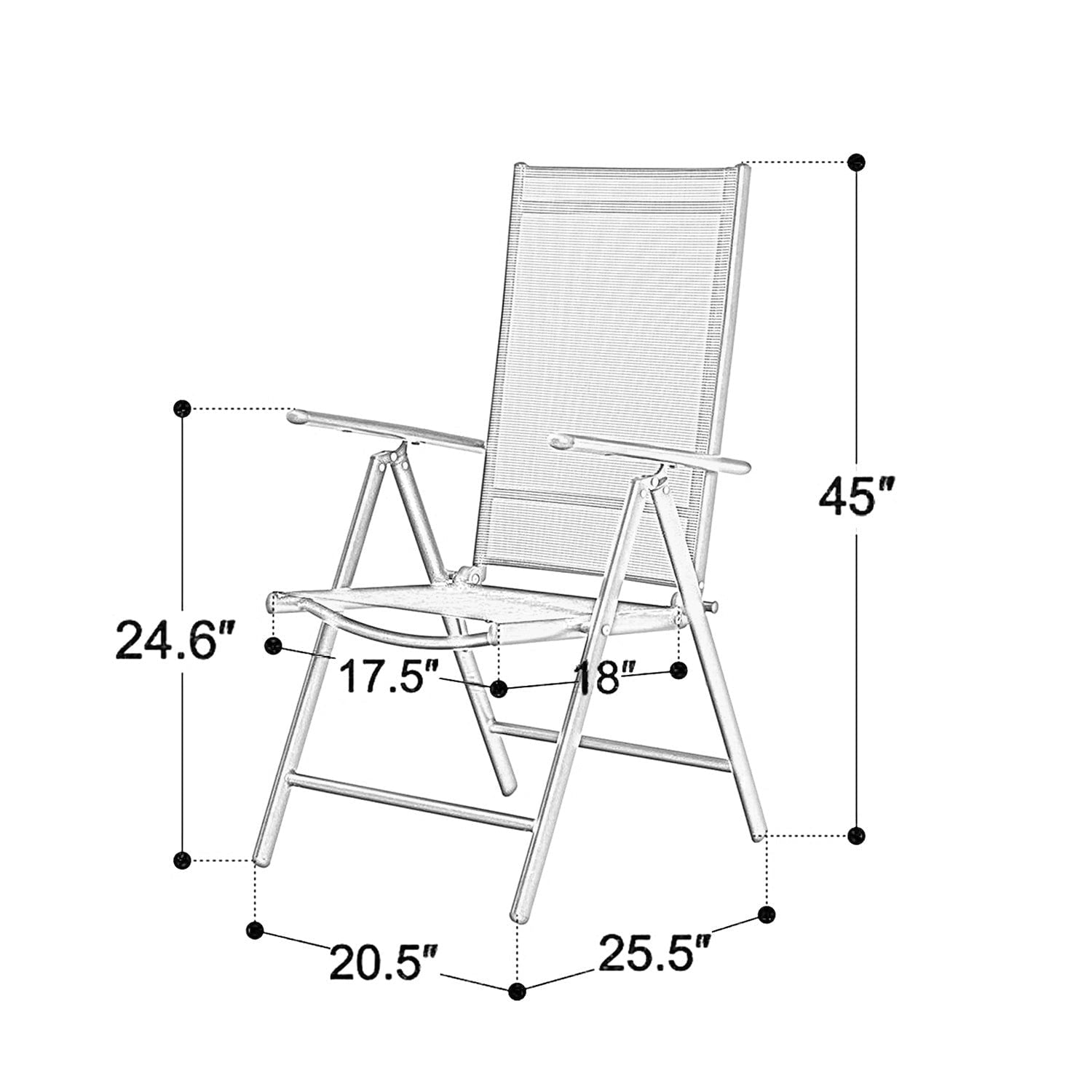 Features Premium Material: High-quality aluminum alloy&steel structure makes the set stable, durable and long-lasting. Made of tightly woven polyester with specially formulated PVC coating, the textilene seating has good performance of UV-protection, breath ability and bearing capacity. 7 Angles of Backrest: The chair back can be adjusted from 100° to 130° with 7 positions by handling the armrests forward or backward, allowing you to choose a most comfortable position for sitting or lying. Function&Energy: This outdoor dining set provides with seating for 4, perfect for family outdoor dinners and the light-weight chair can be easily folded into a small size for moving, storing&saving space. Safety&Protection: All edges of the chair are rounded-corner to protect you or your family from being injured. The umbrella hole on table top is suitable for most patio umbrellas, preventing the harmful UV rays outdoors. 1-Year Warranty: If you have any questions about our products or assembly, please feel free to contact with our professional service team: [email protected]. Please kindly note this 5-Piece patio dining set includes 3 cartons and may be delivered separately. Please wait patiently for all packages. If you have any questions about the logistics, you can also contact with our service team, [email protected]. If missing or delay, please dial our free service line, 877-606-2818. We recommend you to store and cover your patio furniture in a coll dry place when not in used.