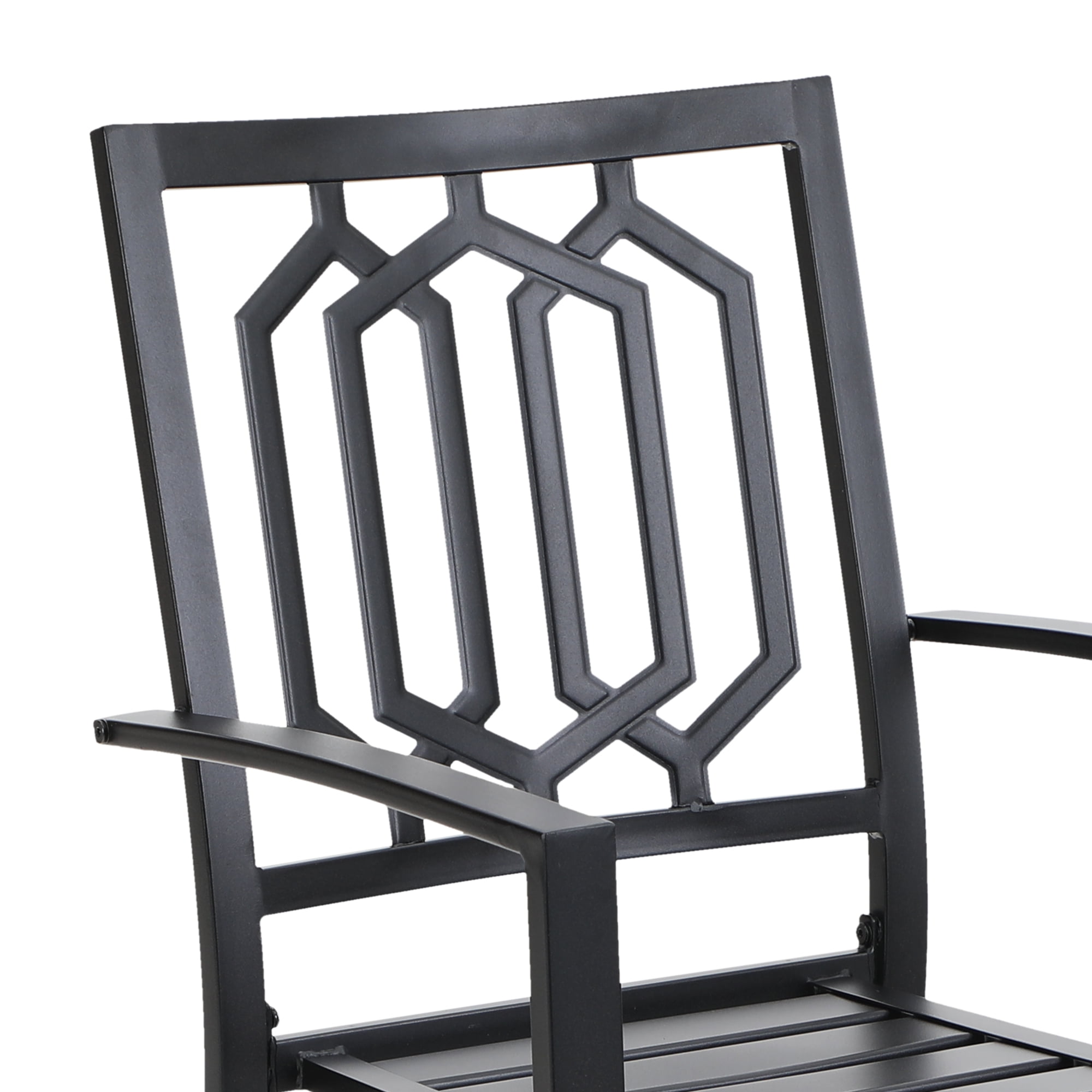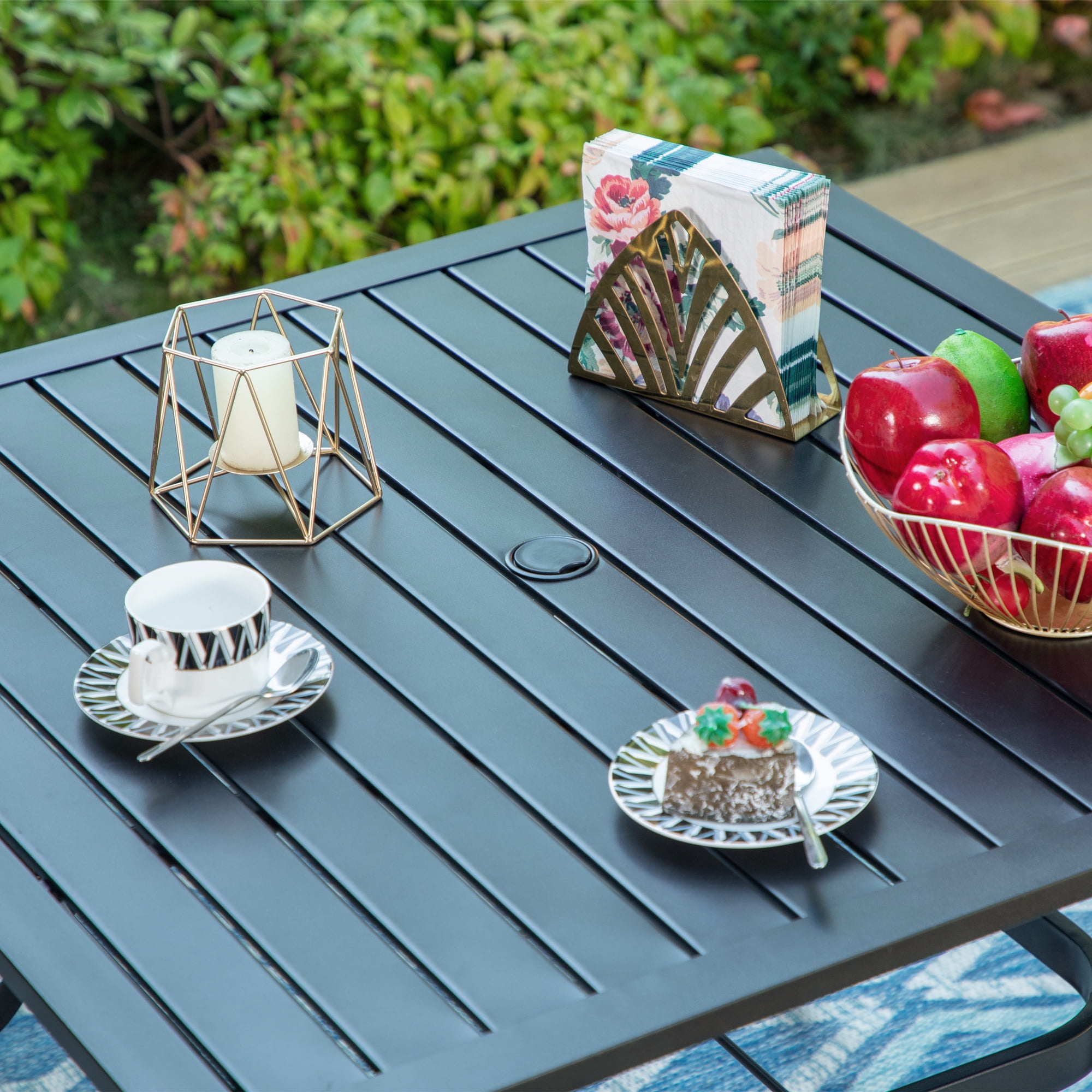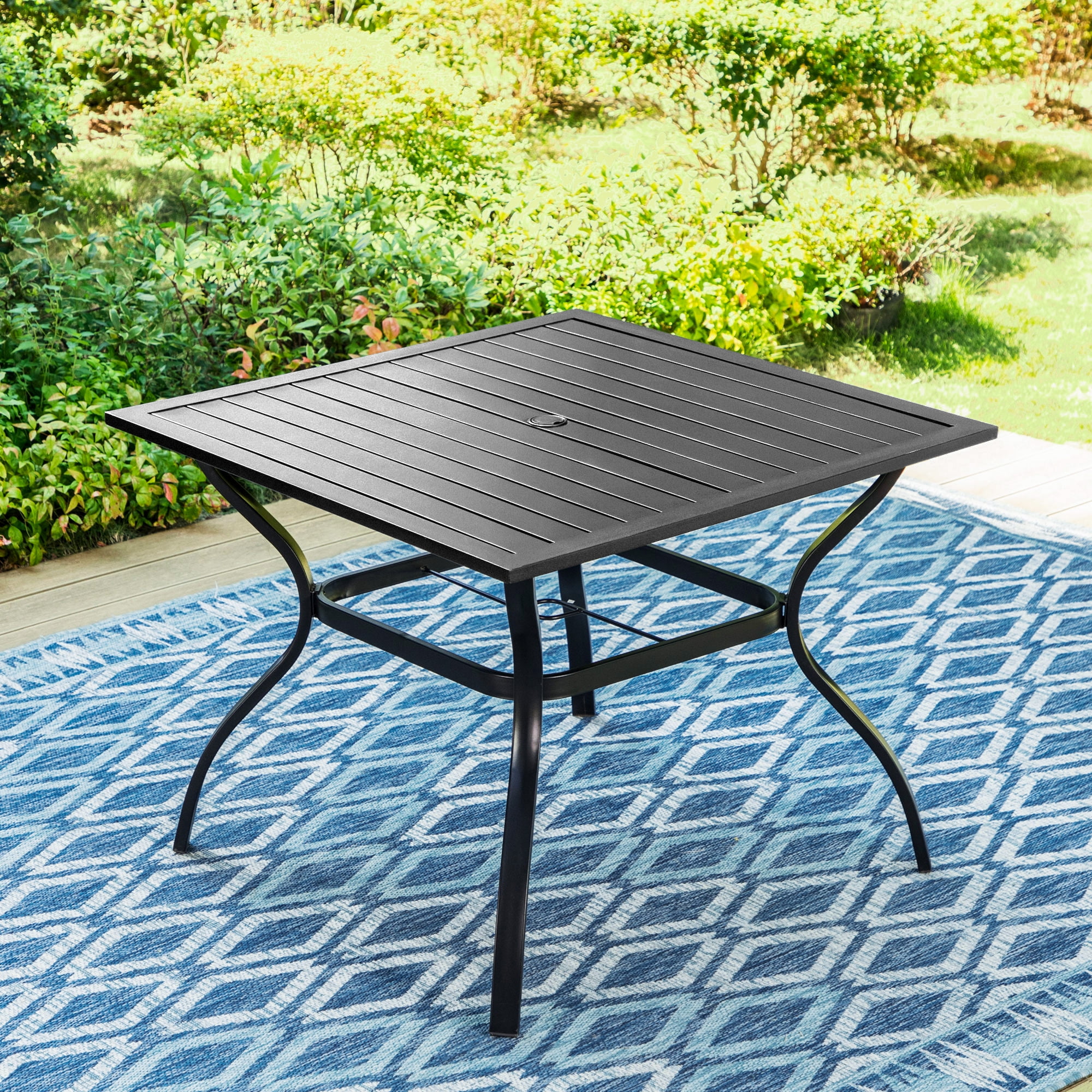 This MF Studio 5-piece patio dining set is ideal for your family/friends gathering, party, dinner and conversation. It includes one square table and four armchairs. Made of heavy-duty steel frame with E-coating & powder-coated finish, the set offers supportive structure and stands up to outdoor elements for reliable long-lasting strength. Featuring clean-lined appearance of sturdy steel structure, wide seat & armrests, classic lattice backrest and stackable design, the chair creates a casual spot to relax. The square table has an umbrella hole on its slatted top and can seat 4-person comfortably, perfect for family gatherings and backyard get-togethers. Table x 1 Overall Size: 37″ L x 37″ W x 28″ H Slatted Tabletop & Bowed Legs Umbrella Hole, Dia.1.57″ Chair x 4 Overall Size: 22.4″ W x 25″ D x 35″ H Seat Height: 16.5″ Weight Capacity: 300 lb.