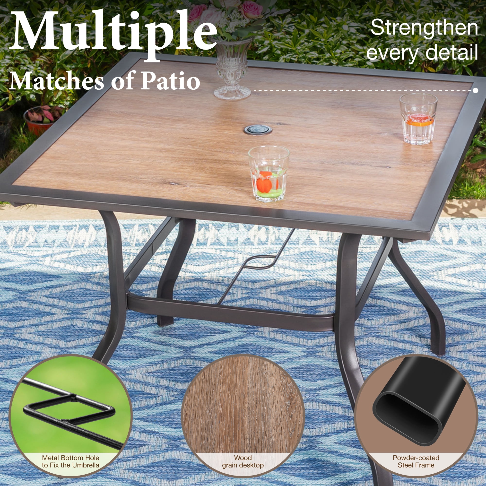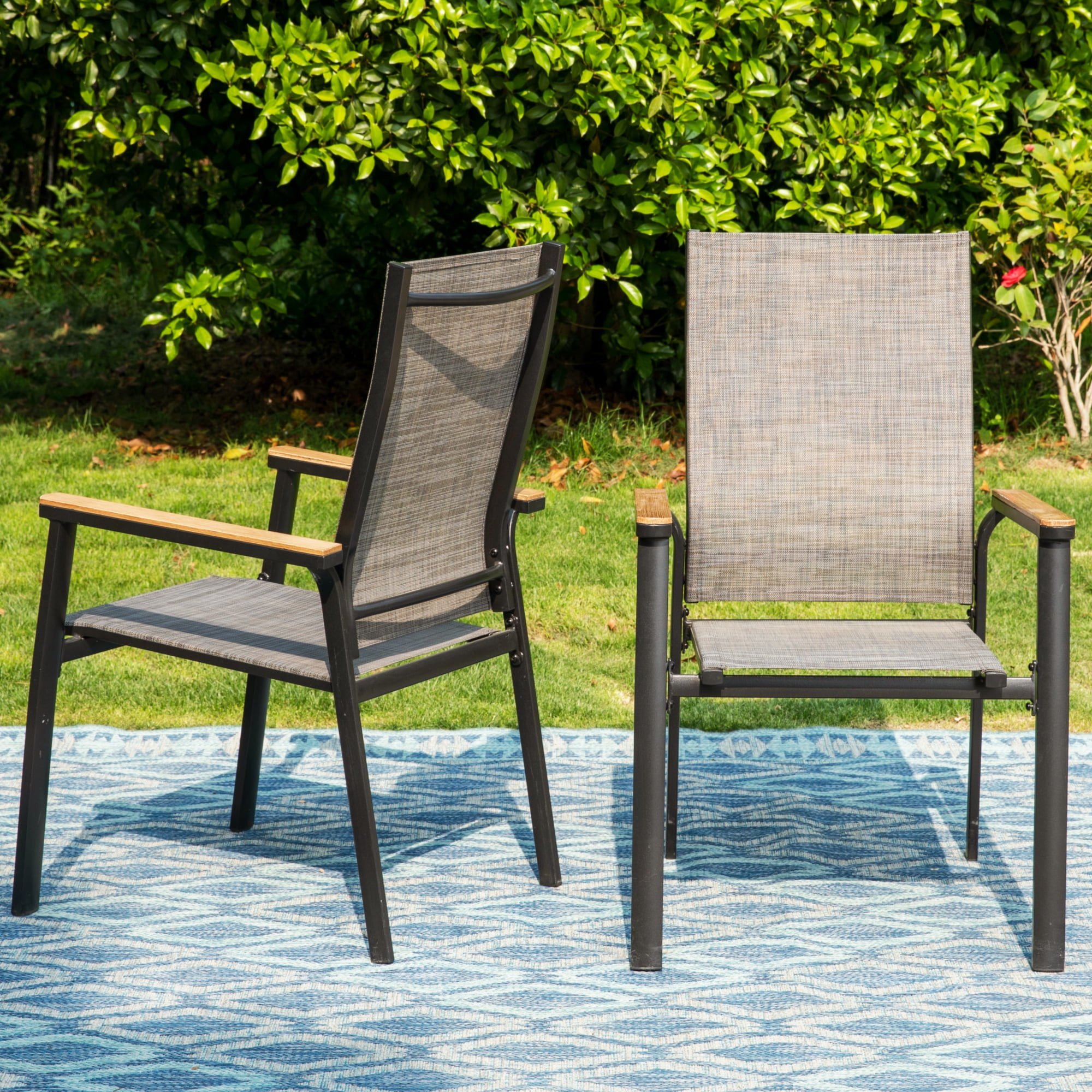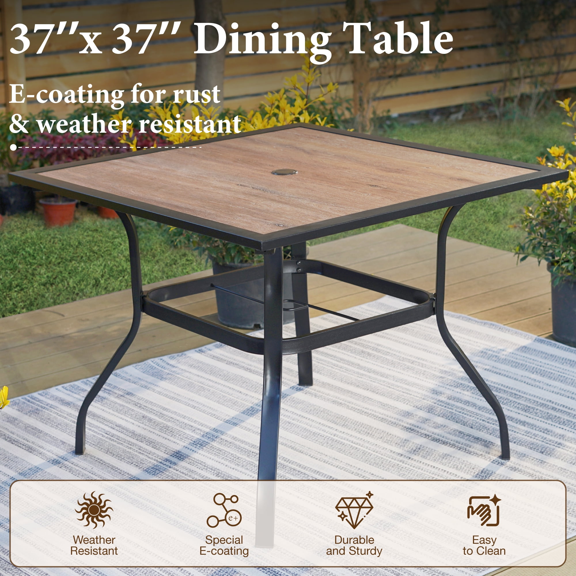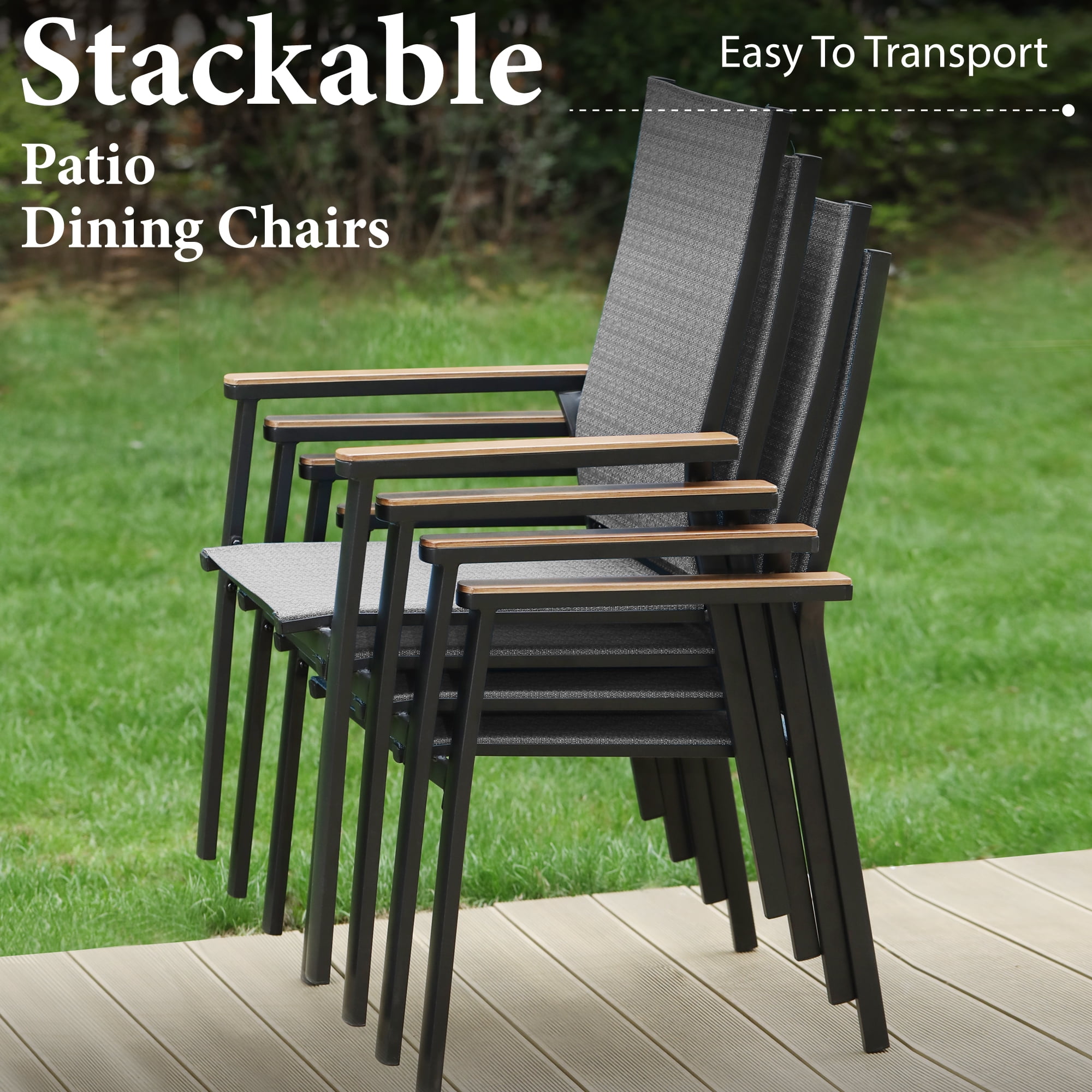 Configuration: Set includes 4 pieces aluminum stackable armchairs & 1 piece square metal steel dining table. Stable & Durable: These chairs are made of high-quality aluminum frame (not rust when exposed to rain or sunlight), which makes them more suitable for outdoor use. High-quality metal structure with powder-coated & E-coating makes the table and chairs are durable and long-lasting. Comfortable Seat: Deep wide seat and high-back design bring you extra comfort. Lightweight & Stackable: Aluminum frame chair weighs only 6.7 lbs, you can move and store them easily. The chairs using a stackable design will save more storage space. High Performance Fabric: Made from tightly woven polyester with specially formulated PVC coating, the Textilene seat has good performances of UV-protection, breath ability, bearing capacity. Metal Patio Table: Square table with wood-look top, bow legs & 1.57″ diameter umbrella hole, great for patio life. After Sale Service: If any questions, feel free to contact our service team, we will reply within 24 hours. Thank you.