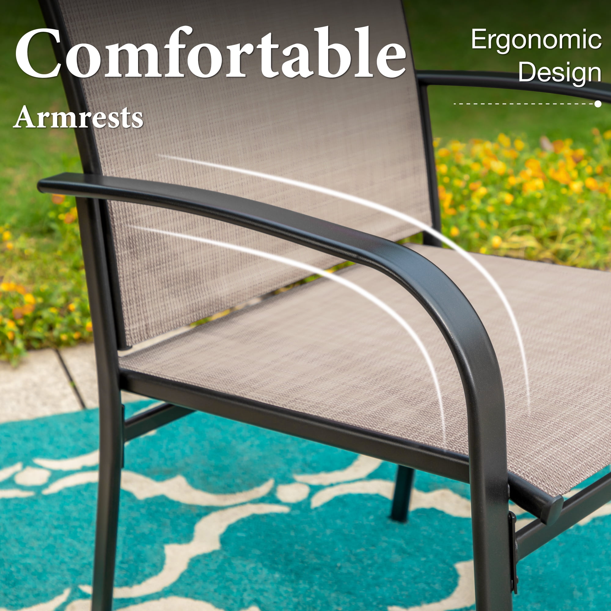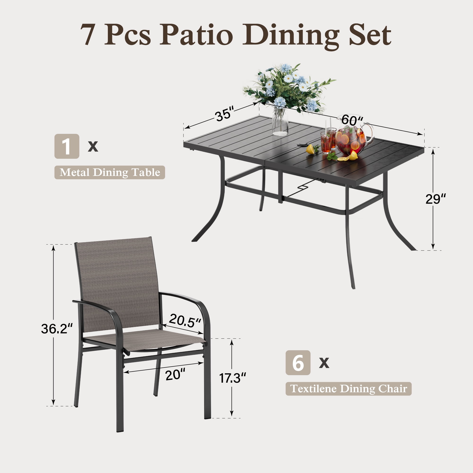 Turn your backyard into a unique, comfortable getaway with this stylish MF Studio outdoor patio furniture that provides seating for 6, perfect for entertaining, hosting a dinner, gathering or a party. The set includes one large rectangle table and six armchairs. Crafted with heavy-duty steel frame with E-coating & powder coated finish, this patio set offers supportive structure and stands up to outdoor elements for reliable long-lasting strength. The chair features a clean-lined design of black powder-coated steel frame & Textilene seat that looks simple, but elegant with a timeless look. The Textilene fabric is made of tightly woven polyester with specially formulated PVC coating which has good performance of UV-protection, breath ability and bearing capacity. The 60″ x 36″ table offers a large resting place for beverages, snacks for endless backyard barbecues and it is topped with an adjustable umbrella hole with diameter 1.57″/1.9″ which is suitable for most patio umbrellas, protecting your family/friends away from the harmful UV rays. If you’re looking for outdoor furniture to enjoy your family gathering or a party, this MF Studio 7-piece set is sure to be your favorite. Entertaining outside with MF Studio is a breeze, taking in the great outdoors in style. Specification Table Overall Size: L 60″ x W 35″ x H 29″ Rectangle Slat Top & Bow Legs Adjustable Umbrella Hole With Removable Ring, Diameter 1.57″/1.9″ Chairs Overall Size: 27.2″ D x 21.7″ W x 36.2″ H Seat Dimension: 20″ x 20.5″ Seat Height: 17.3″ Weight Capacity: 300 lbs