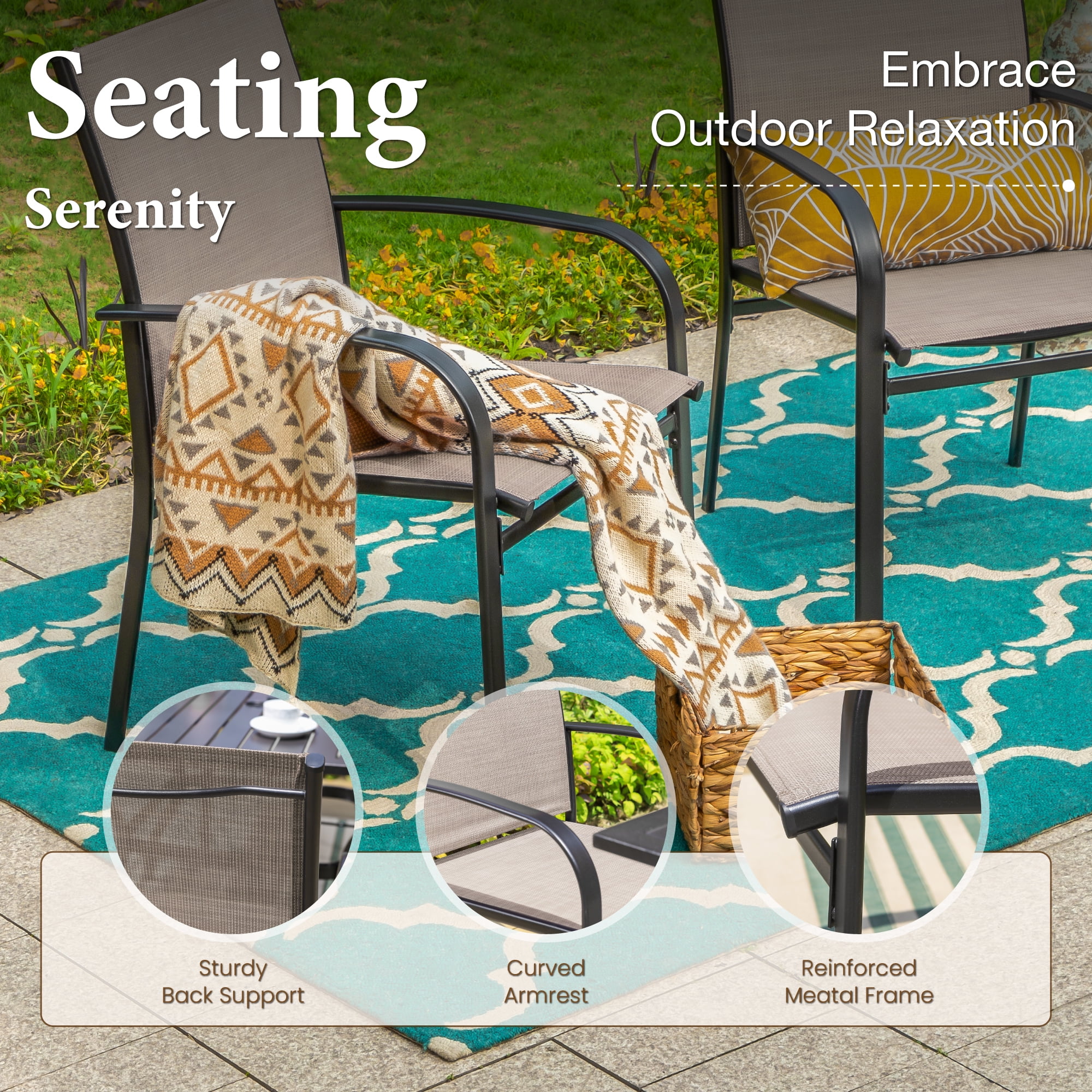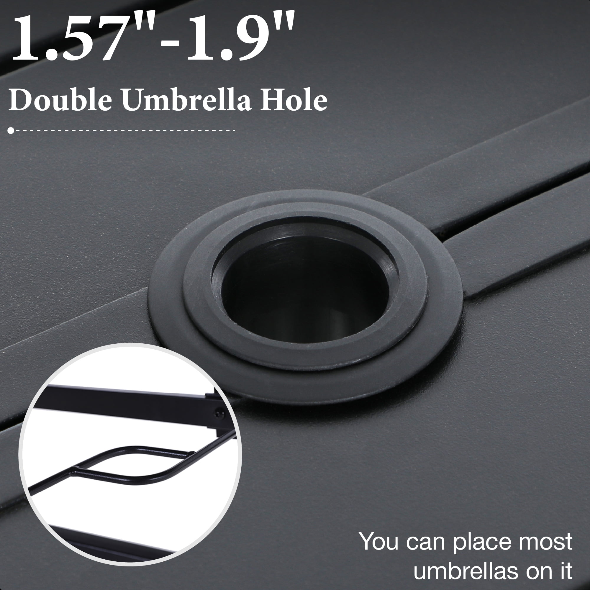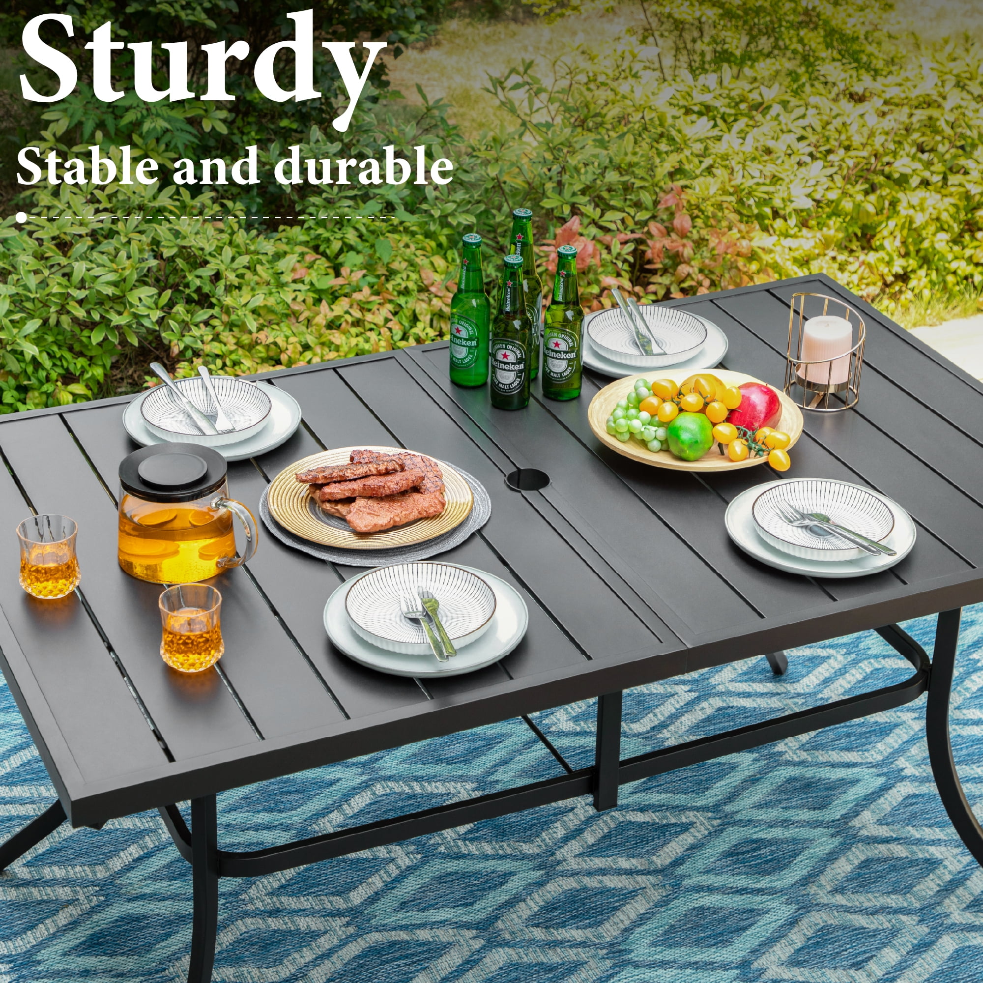 Set including one large rectangle dining table & six steel armchairs Heavy-duty steel frames with E-coating & powder coated finish, all weather & strong rust resistant Table with adjustable umbrella hole, diameter 1.57″ & 1.9″ with removable ring, suitable for most patio umbrellas Chairs with tightly woven Textilene fabric, good performance of UV-protection, breath ability & bearing capacity 6-seat outdoor dining set, perfect for entertaining, hosting a family dinner, gathering or a party
