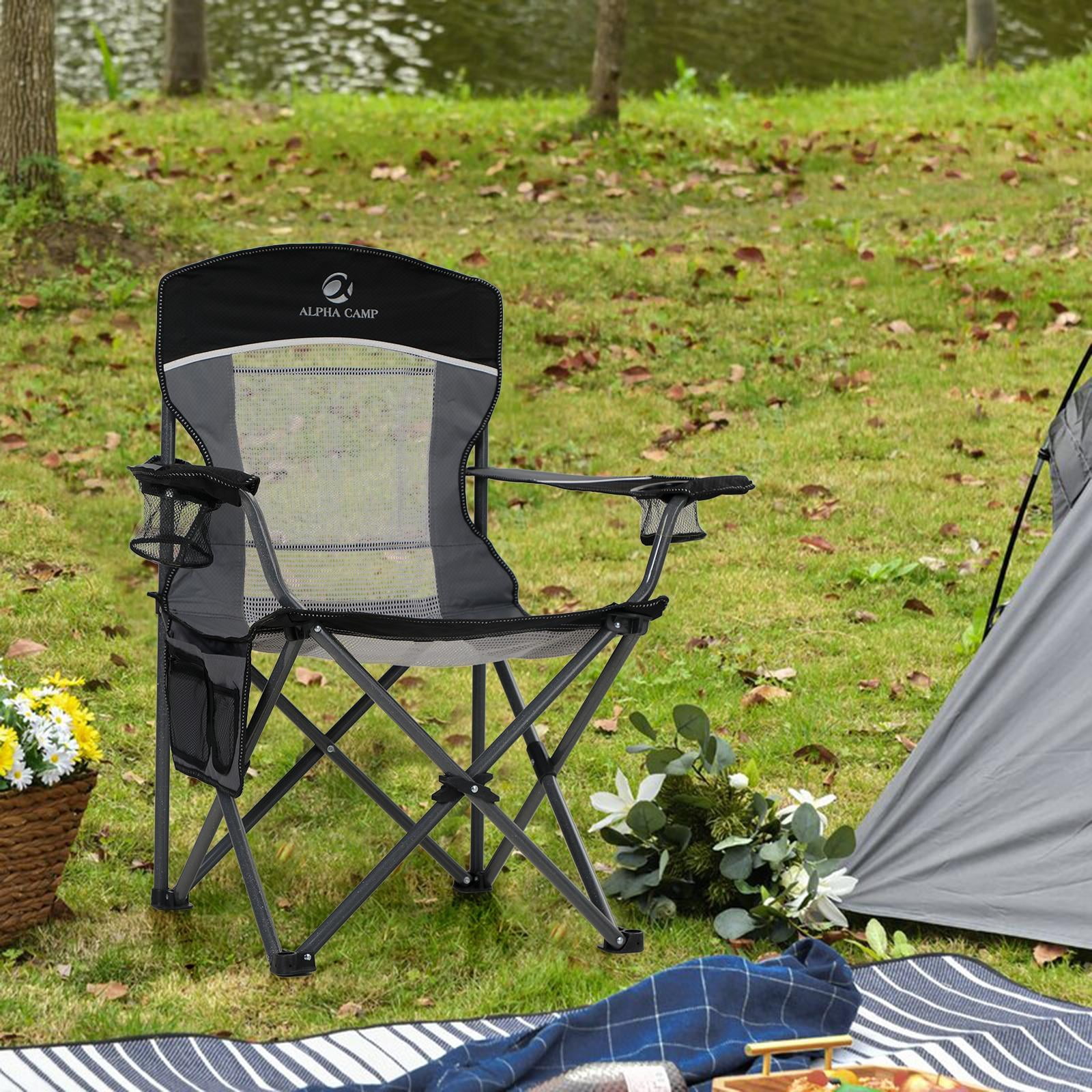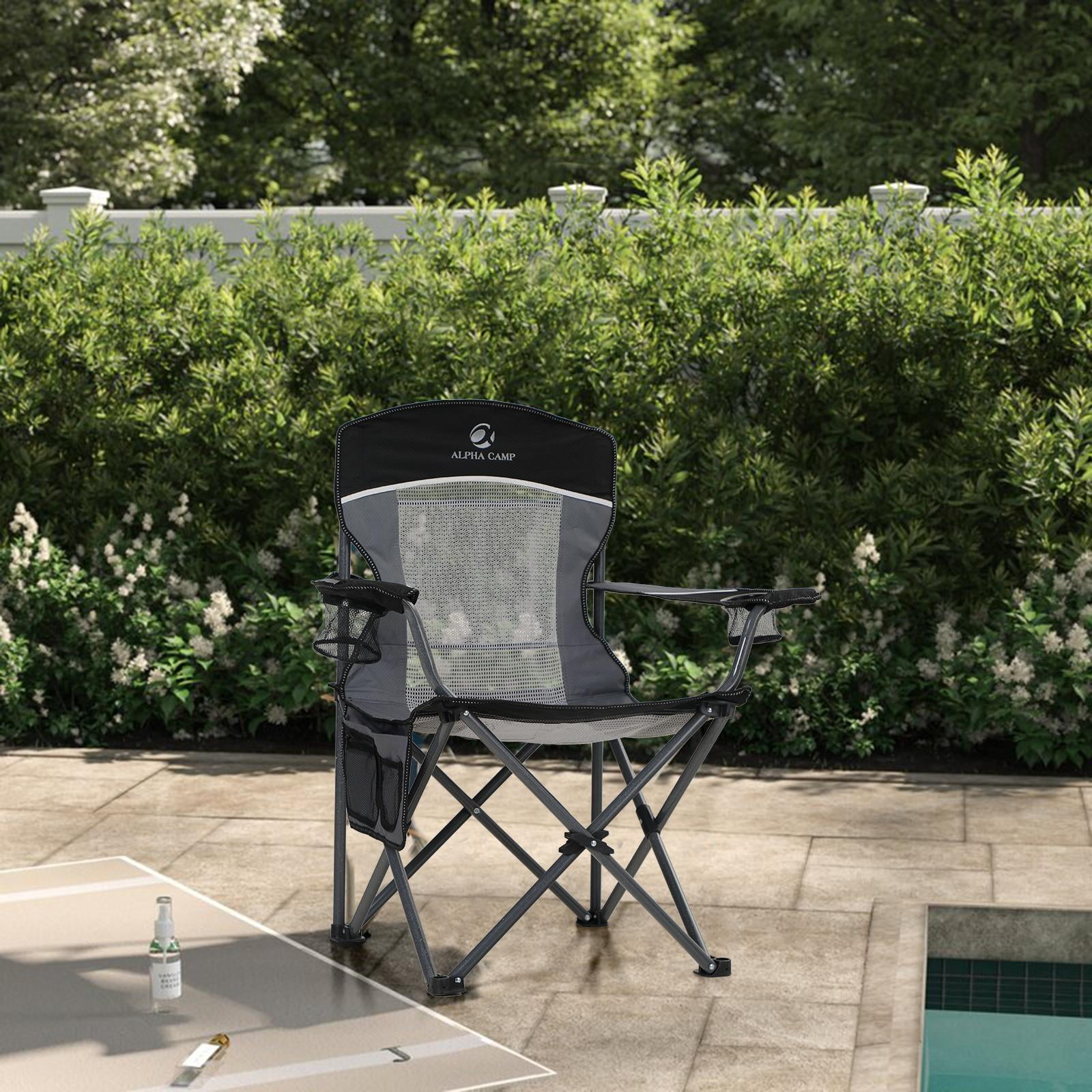 MF Studio Camping Chair, Black: Large Size: 37″ x 22″ x 40.1″ Powder-coated steel frame with durable Oxford fabric. All the materials are treated for weather-resistant Durable oxford fabric with coating assure water and stain resistance and mesh back fabric keeps ventilation well. With bigger size feels more comfortable and the mesh keeps you cool Extra-large storage spaces: Side zipped pocket to hold your cell phone and other personal goods; 2 durable mesh cup holders; Large pocket in the back of the chair Two built-in mesh cup-holders to keep all your favorite drinks nearby Perfect chair for a variety of outdoor activities like camping, tailgating, or watching sporting events No assembly required, easy to fold and open up in seconds, portable with a carry bag for easy carriage and storage Material: Thick oxford cloth Fabric: Oxford Weight: 9.7LBS Package Includes: 1 x Big boy XL chair; 1 x Carry bag