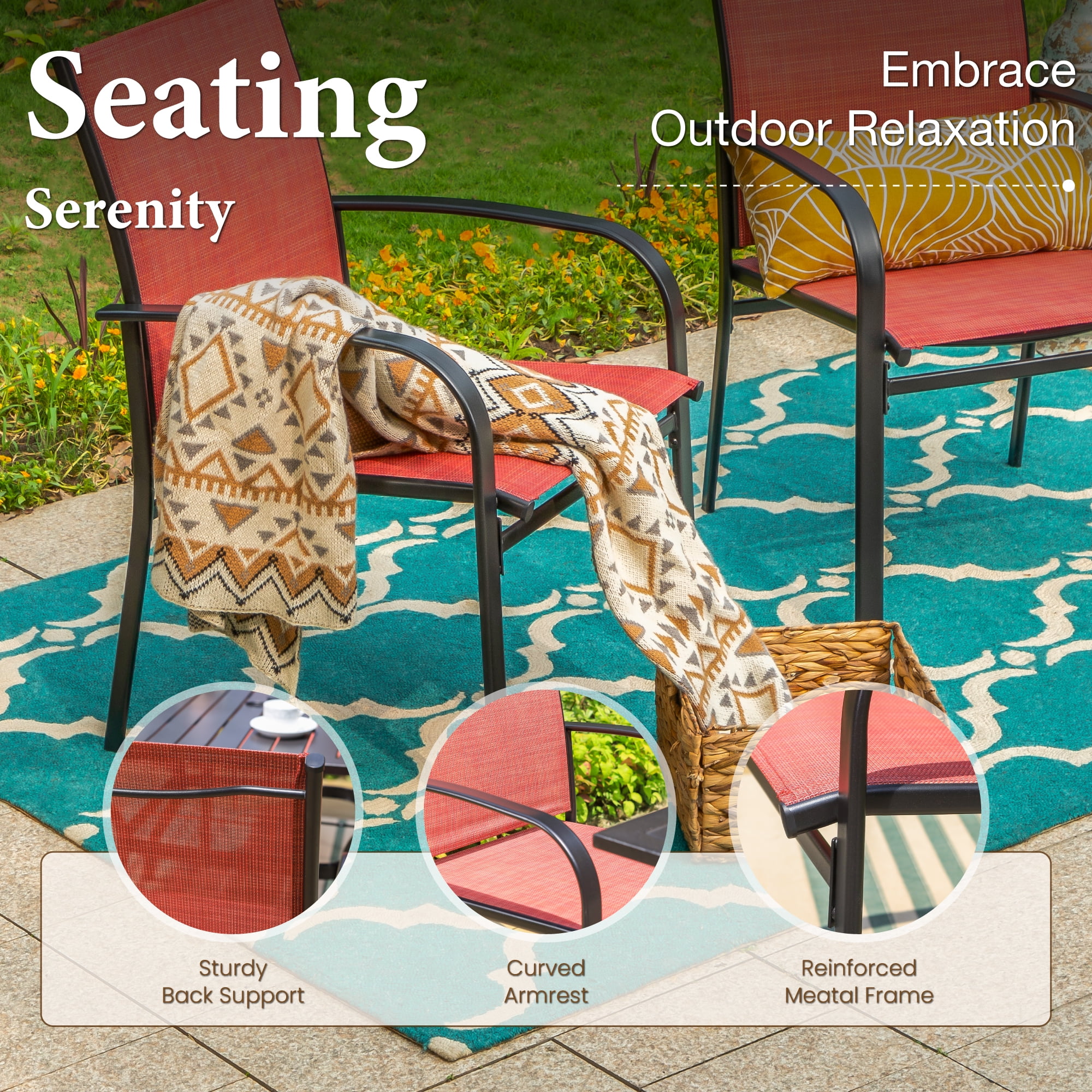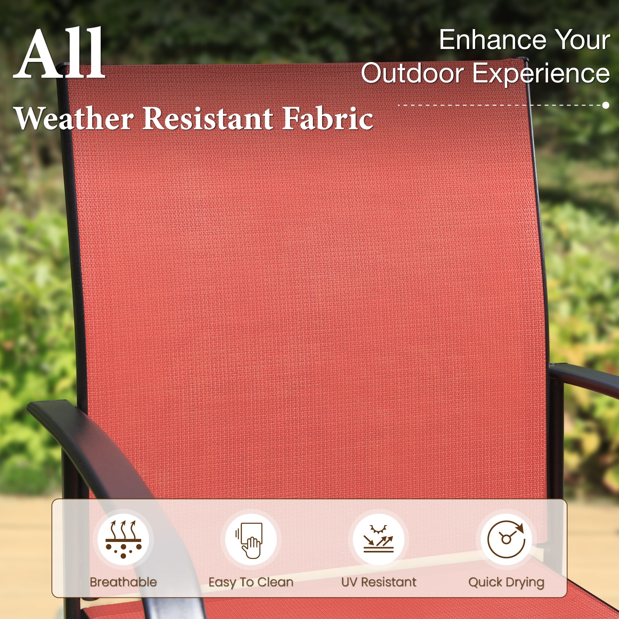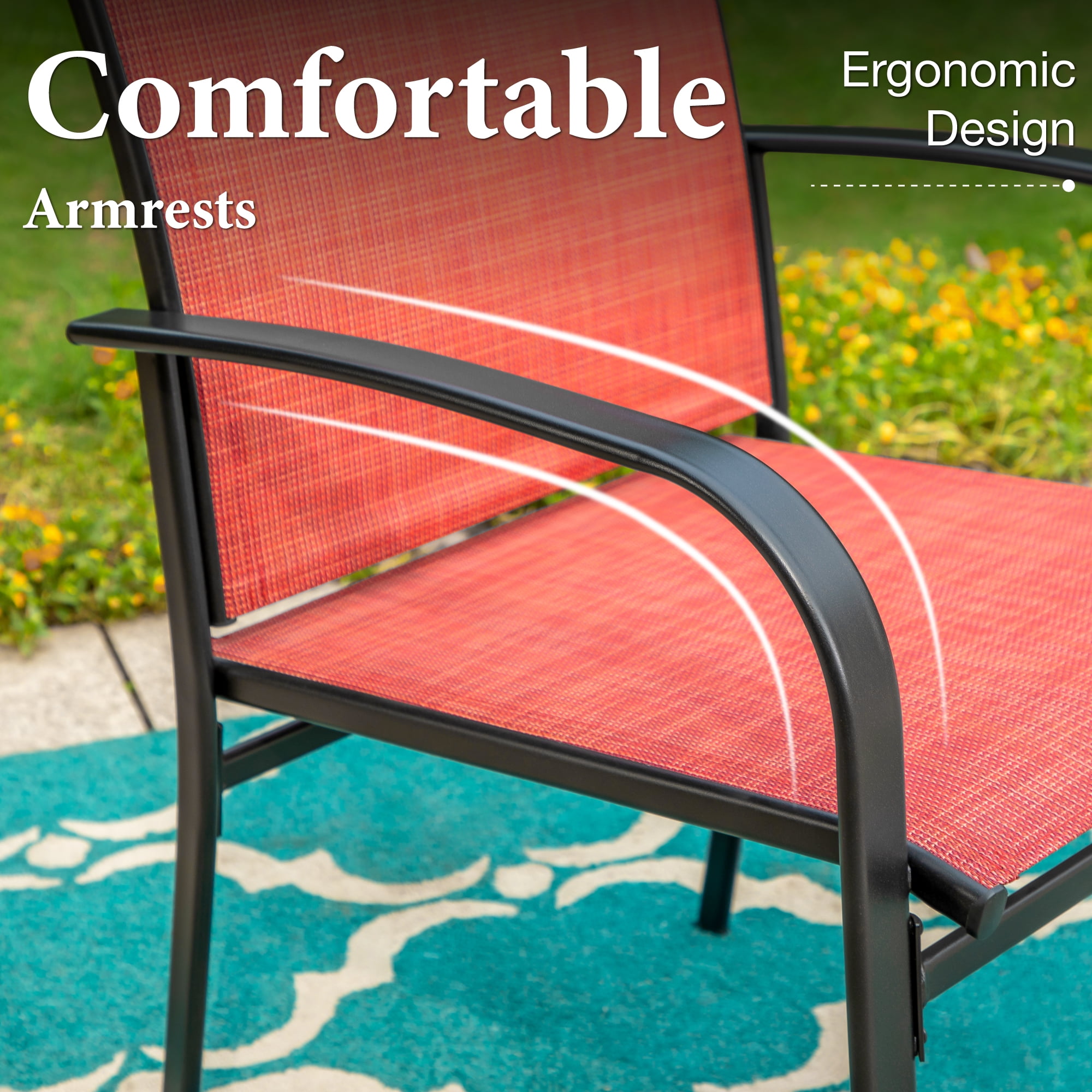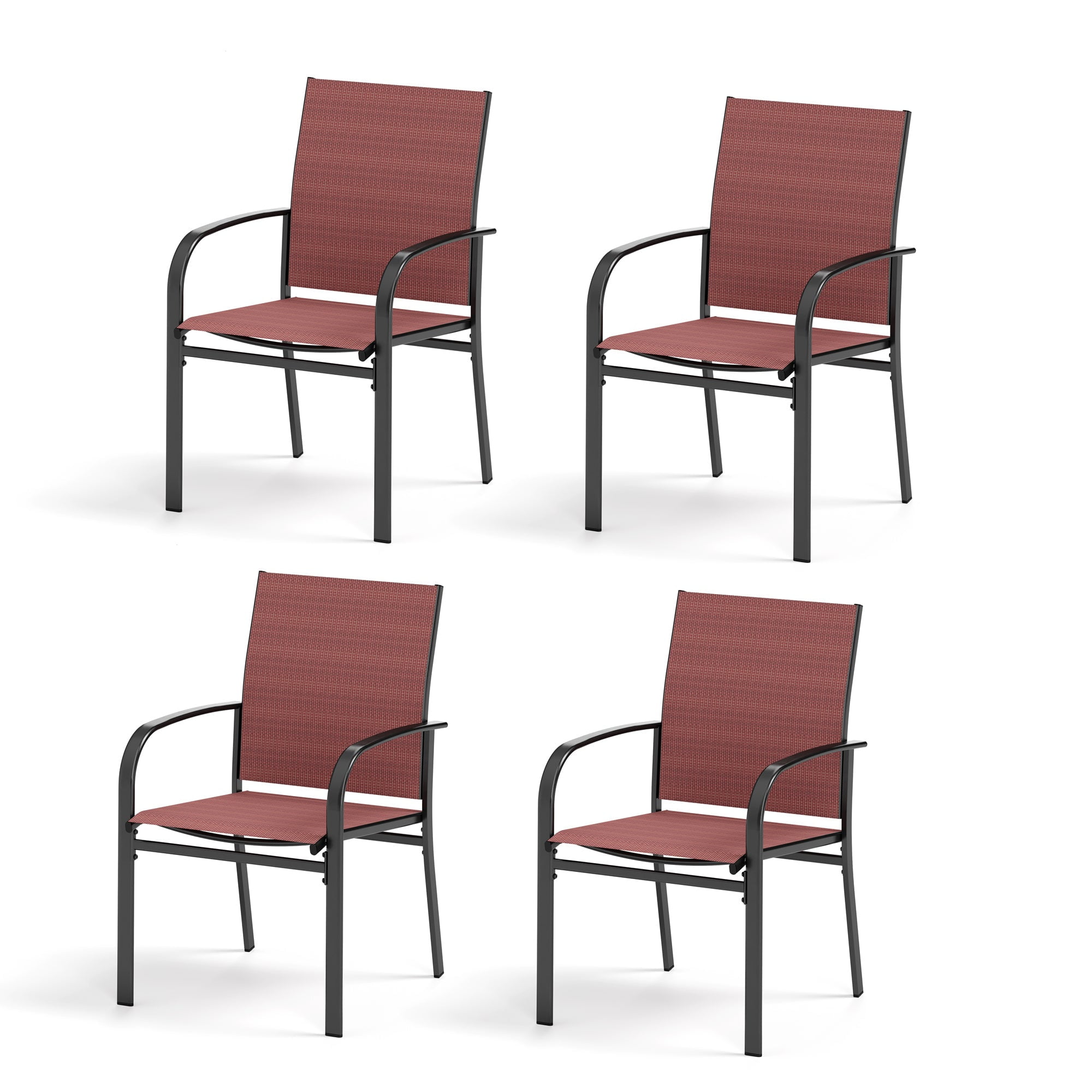 Set includes 4 outdoor patio dining chairs Chair size: 27.2″ L x 21.7″ W x 36.2″ H, seat dimension: 20″ x 20.5″, seat height: 17.3″ Heavy-duty steel frame with E-coating & powder coated finish, all weather & strong rust-resistance Tightly woven textilene seat, stain, water, UV-resistant, durable & breathable Colors available: red, blue & brown