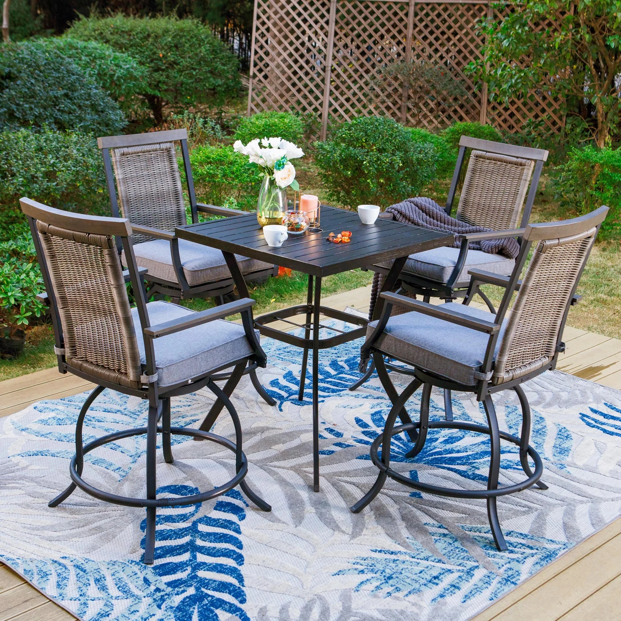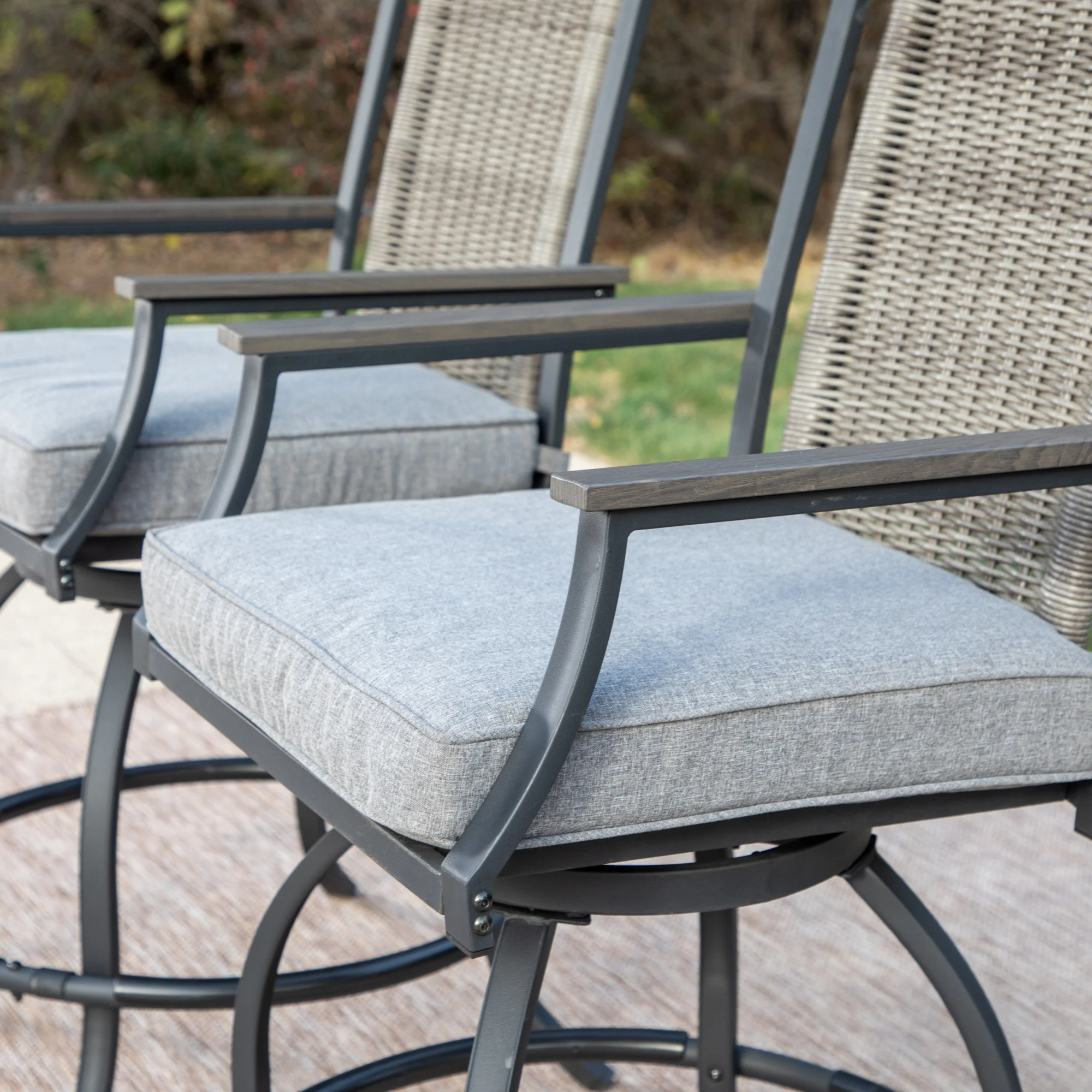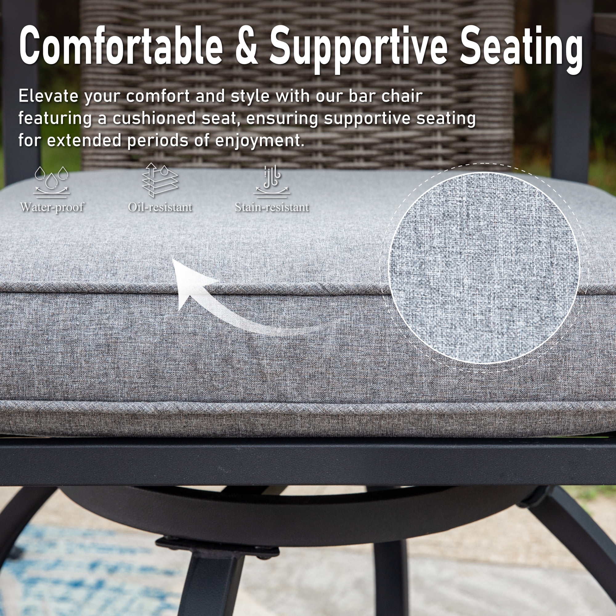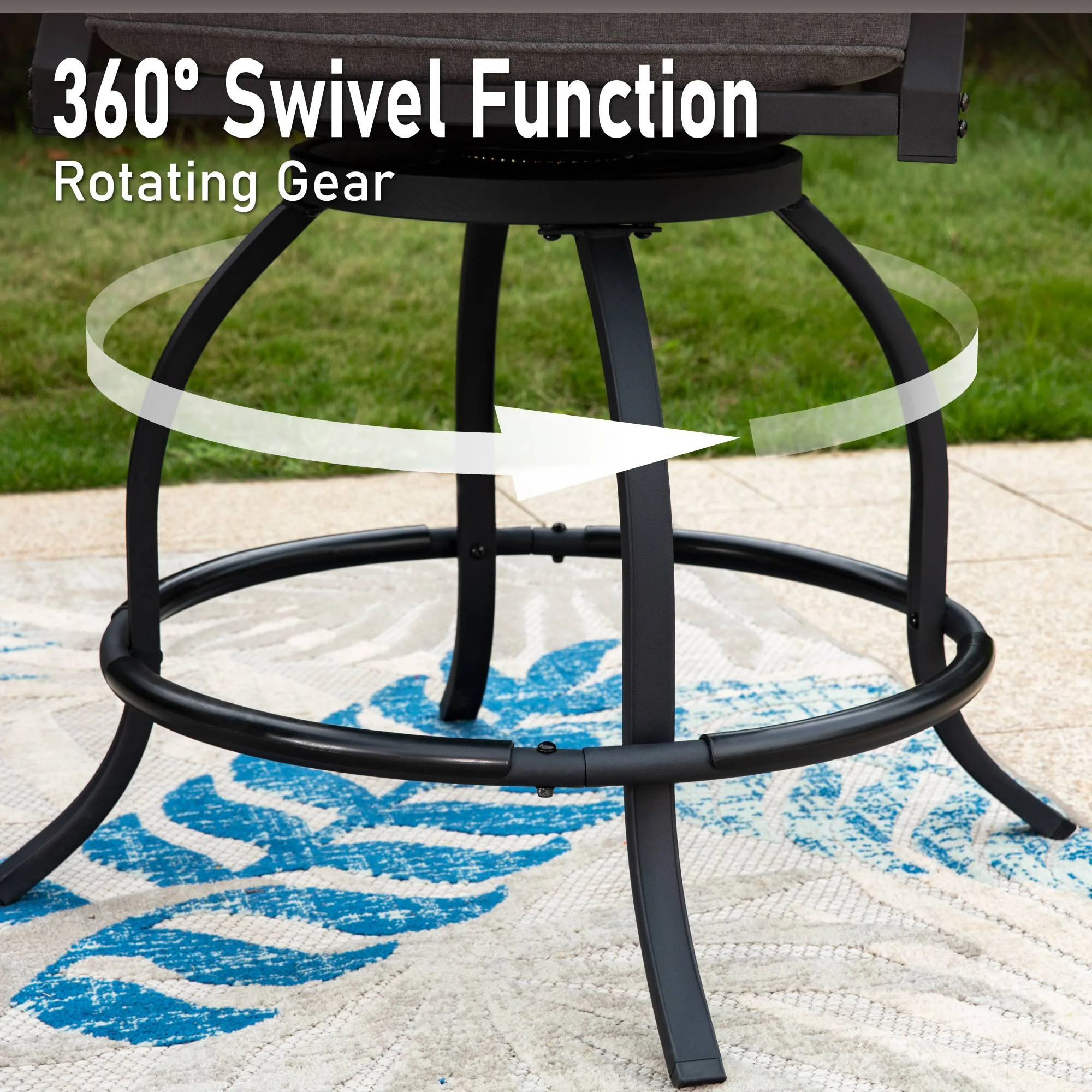 This MF Studio outdoor bar stool is a perfect choice for you to talking with your family or friends around your bar table. Crafted by heavy-duty steel frame with E-coating & powder coated finish, 3 layers production, stable and durable, more suitable for outdoor use. The bar chair features 360 degree swivel mechanism, wood armrests and headrest, PE rattan ergonomic high back and 3.5” seat cushion to provide you perfect support, whether sitting close to a table or lying on the back of the chair, it can make you feel comfortable during conversation. If you’re looking for outdoor bar stools to enjoy your relaxing time with your family/friends, these swivel chairs are sure to be your favorite. Specification Heavy-duty Steel Frame with Powder Coated Finish Overall Size: L 23.5″ x W 23.6″ x H 46.3″ Seat Dimension: L 20″ X W 20″ Seat Height: 23.8” Cushion Thickness: 3.5″ Premium Wood Printed Armrests & Wicker Backrest Weight Capacity: 300 lb. Color: Black&Gray