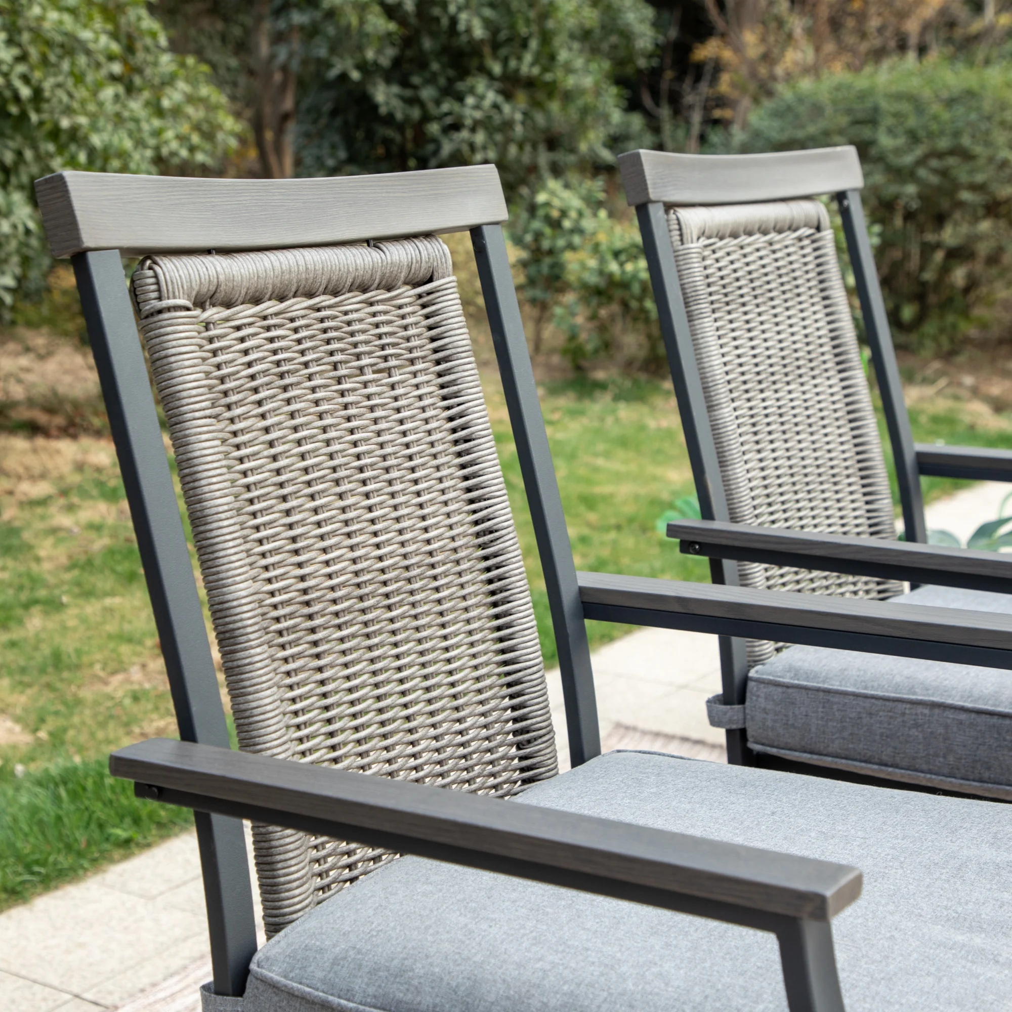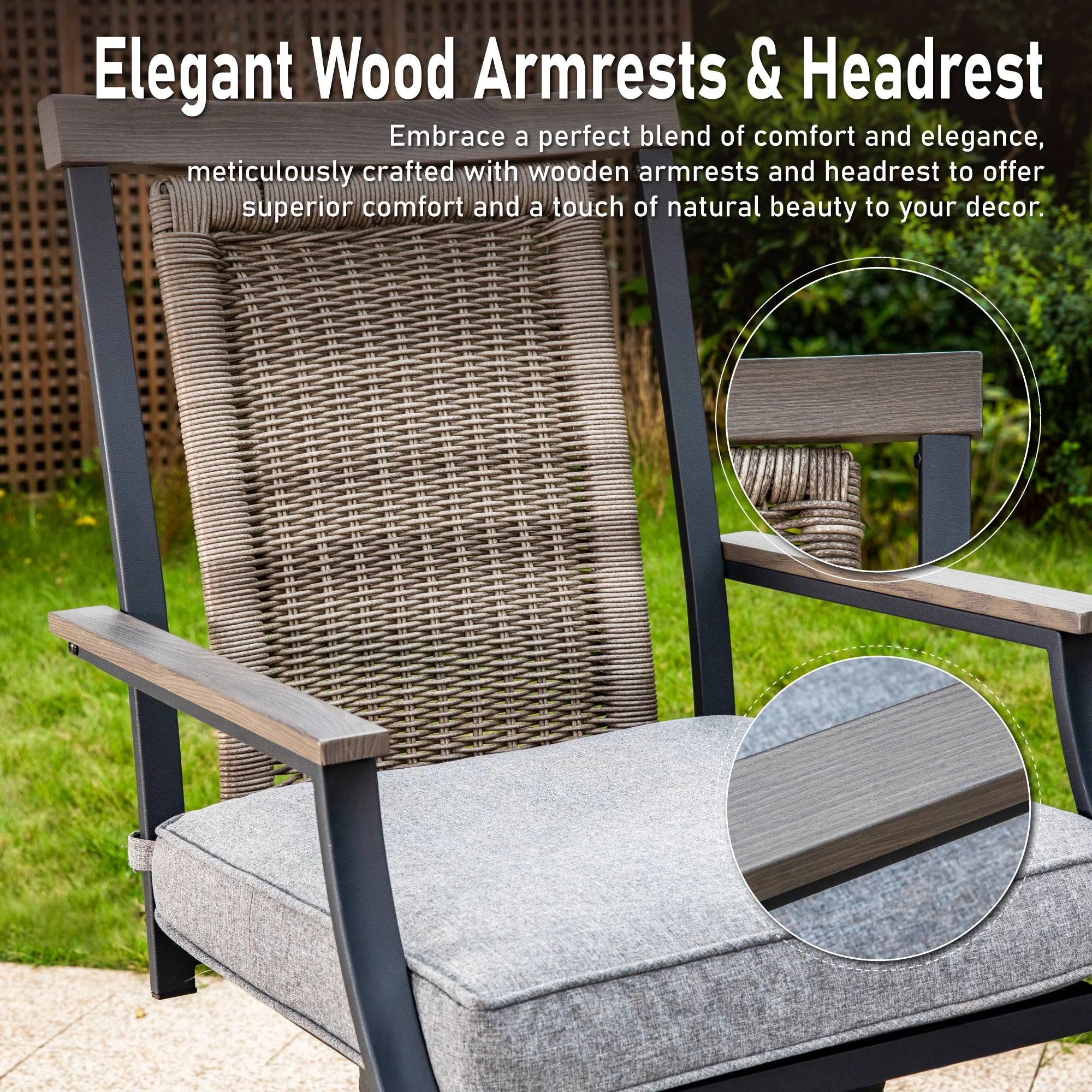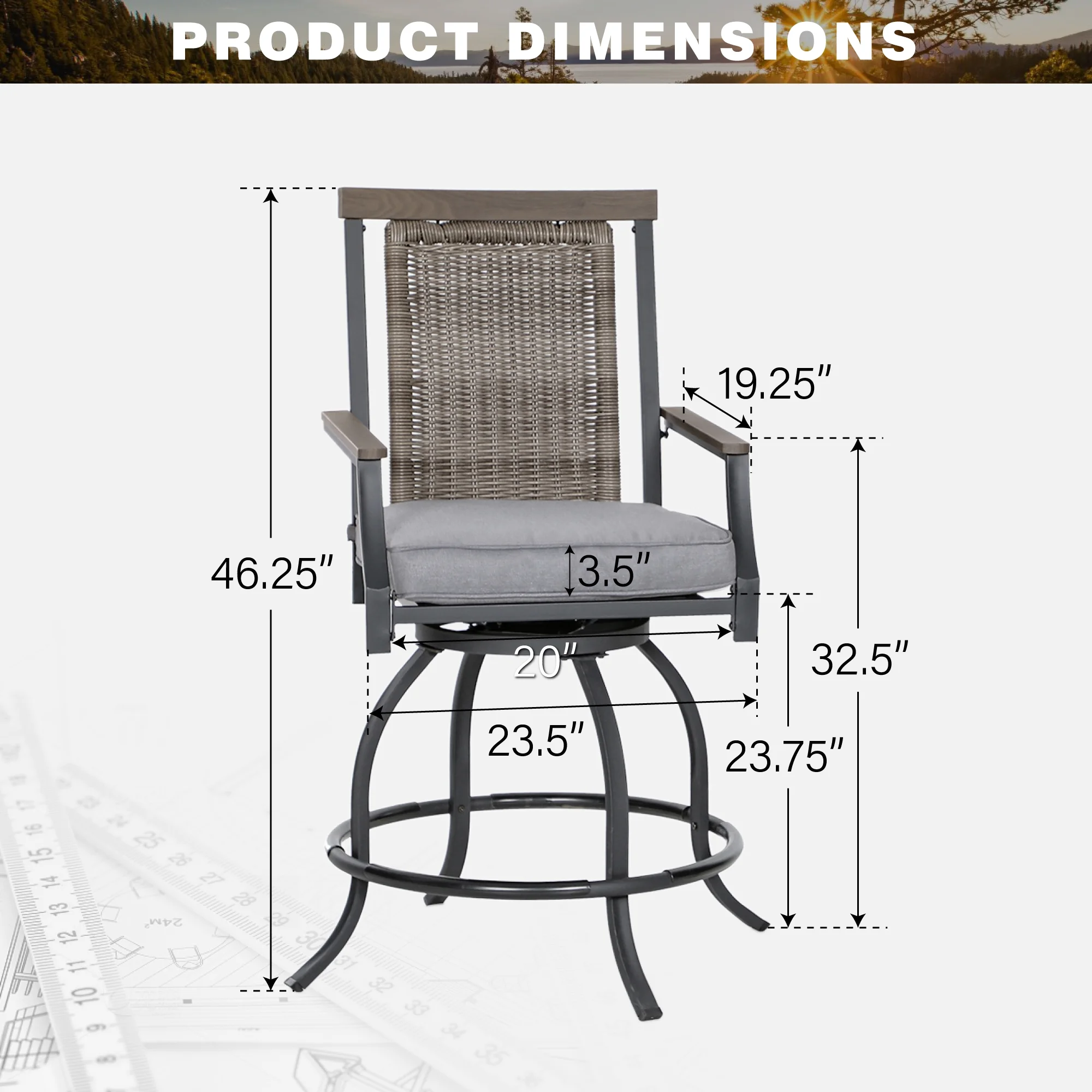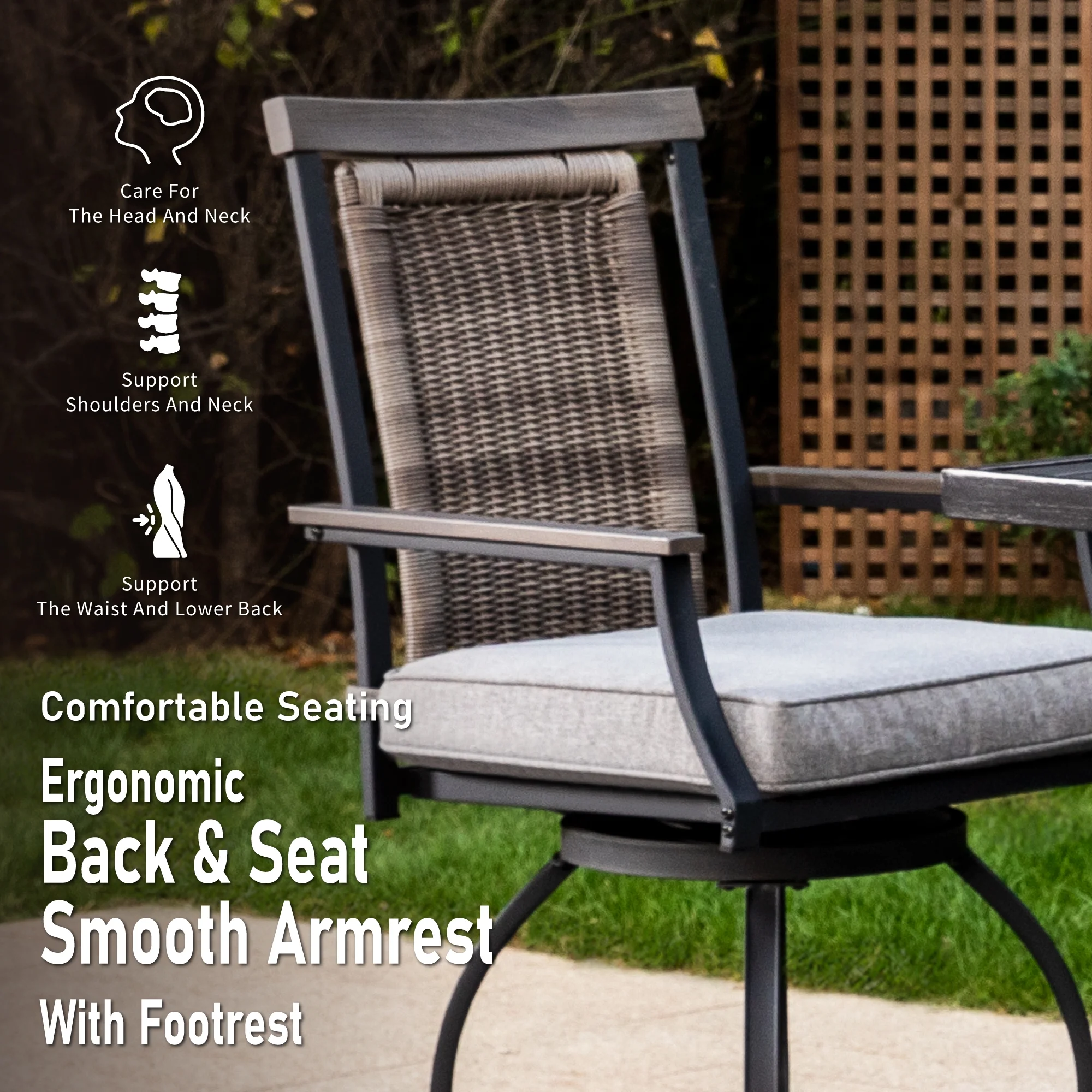 This MF Studio outdoor bar stool is a perfect choice for you to talking with your family or friends around your bar table. Crafted by heavy-duty steel frame with E-coating & powder coated finish, 3 layers production, stable and durable, more suitable for outdoor use. The bar chair features 360 degree swivel mechanism, wood armrests and headrest, PE rattan ergonomic high back and 3.5” seat cushion to provide you perfect support, whether sitting close to a table or lying on the back of the chair, it can make you feel comfortable during conversation. If you’re looking for outdoor bar stools to enjoy your relaxing time with your family/friends, these swivel chairs are sure to be your favorite. Specification Heavy-duty Steel Frame with Powder Coated Finish Overall Size: L 23.5″ x W 23.6″ x H 46.3″ Seat Dimension: L 20″ X W 20″ Seat Height: 23.8” Cushion Thickness: 3.5″ Premium Wood Printed Armrests & Wicker Backrest Weight Capacity: 300 lb. Color: Black&Gray