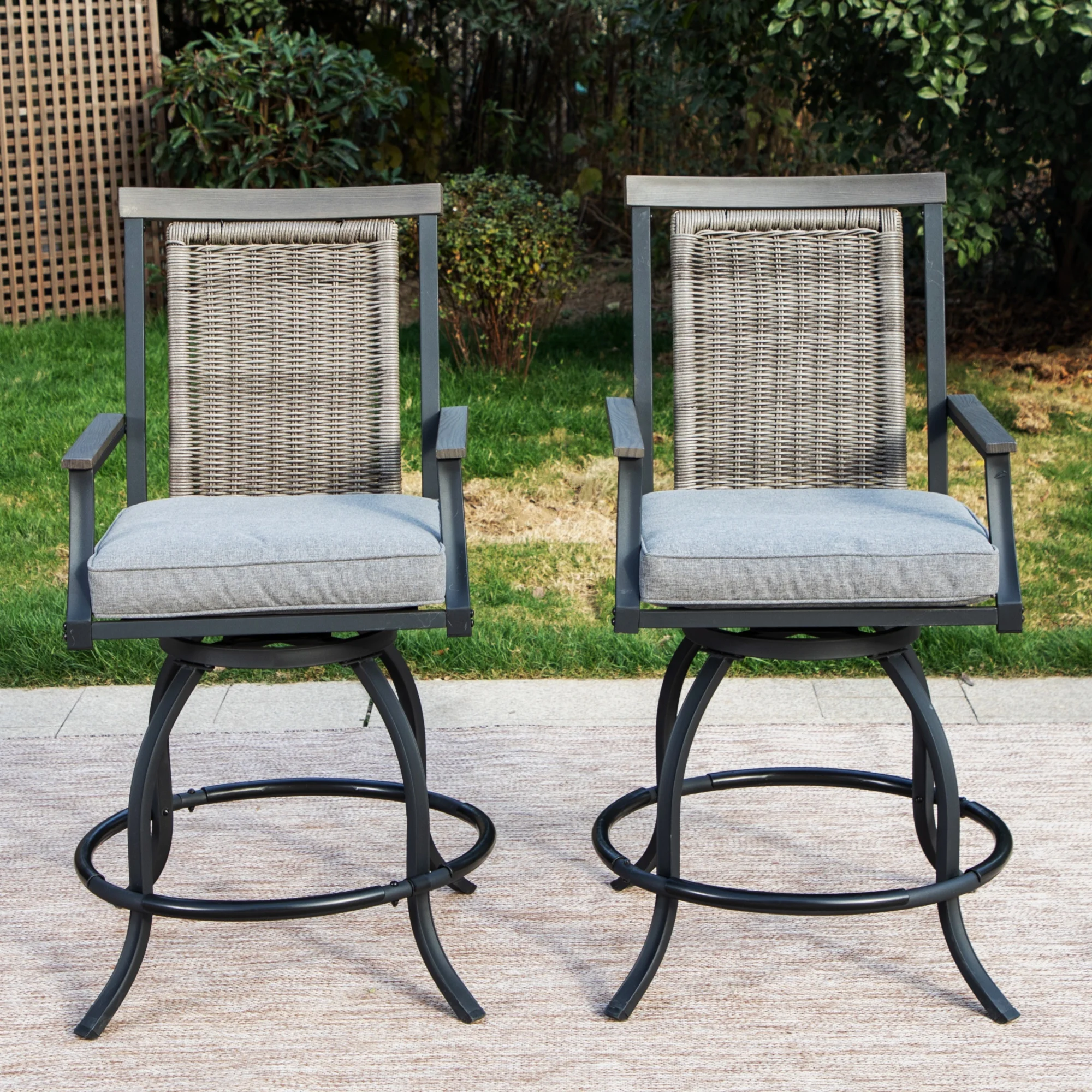 Features: Set of 2 high-back swivel counter height bar stools with wicker back & cushion Stable and durable: made of heavy-duty steel frame with powder-coated, rust and all weather resistant, easy to clean. Bowed legs with heavy-duty base for more stability. Swivel chair: 360 degree swivel mechanism, wood armrests and headrest, PE rattan ergonomic high back and 3.5” seat cushion, comfortable and perfect for bar table. High performance cushion fabric: water, oil and stain resistant, suitable for outdoor use. Safe: the chairs come with anti-scratch&non-slip chair foot pads Please kindly note this 2-piece patio swivel bar stool comes with 1 box. If any questions, please contact with our service team, service@alphamarts. com. Thank you. Cleaning & Maintenance Check stability regularly. Screws may loosen and need to be tightened. Keep the furniture clean and dry. Shake out the fabrics and wipe away excess water after a rain. We recommend you to store and cover your patio furniture in a coll dry place when not in use.