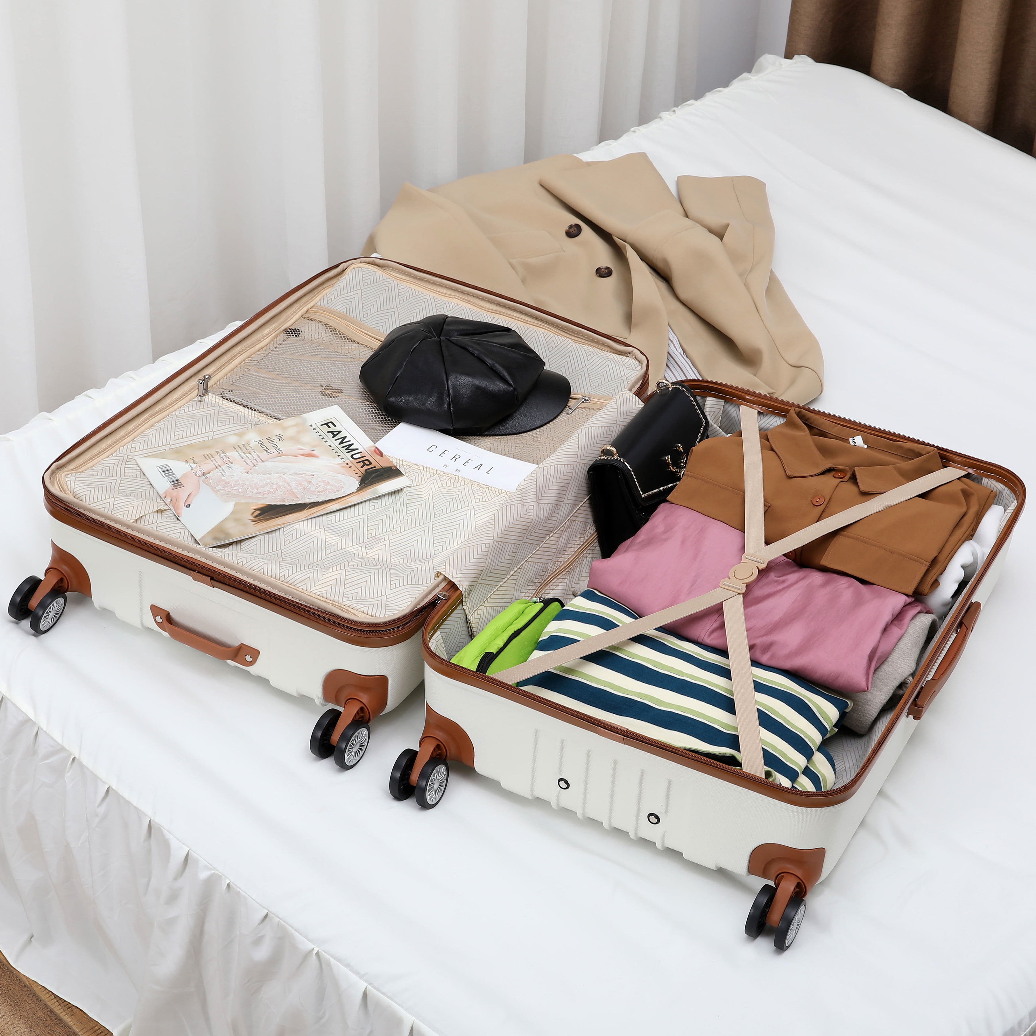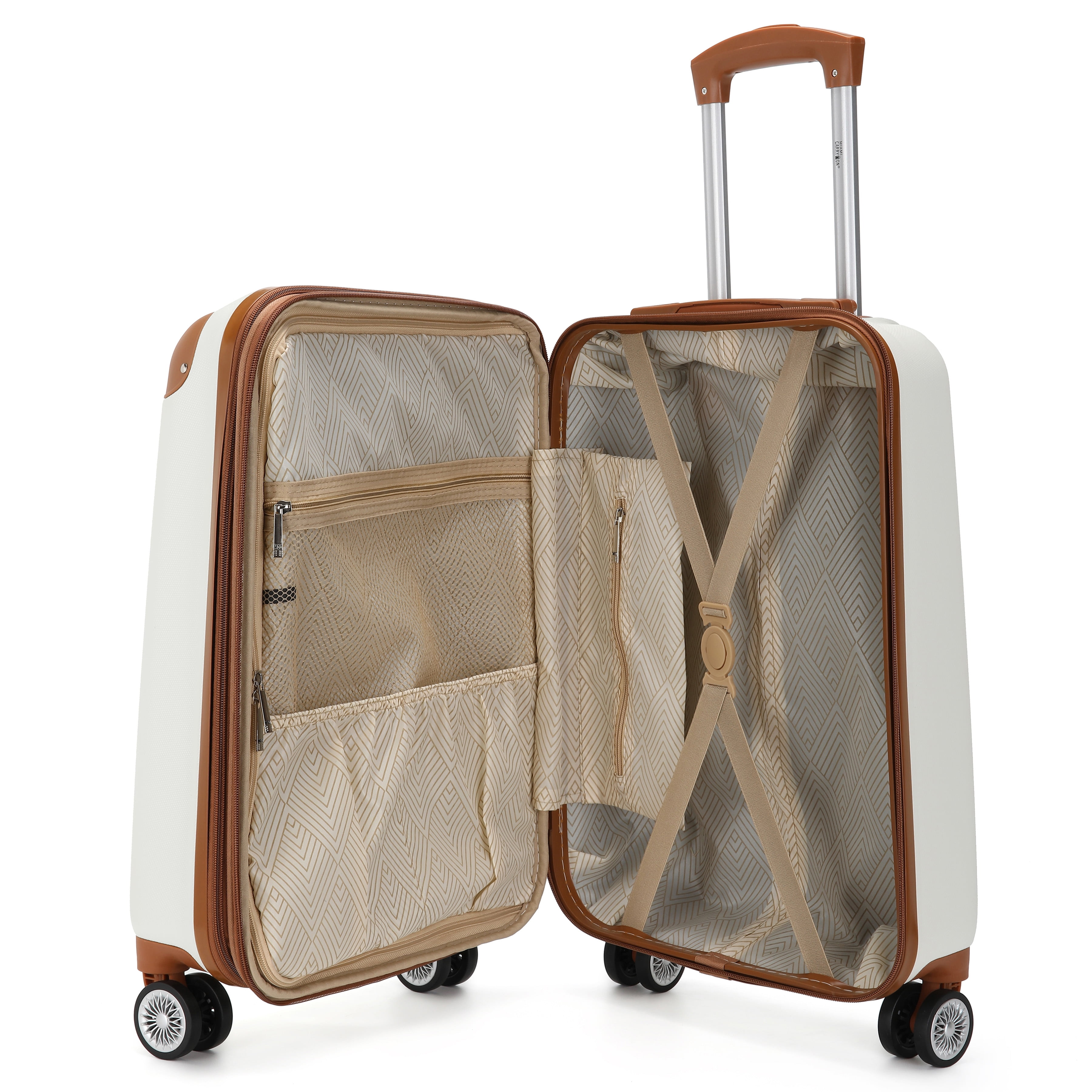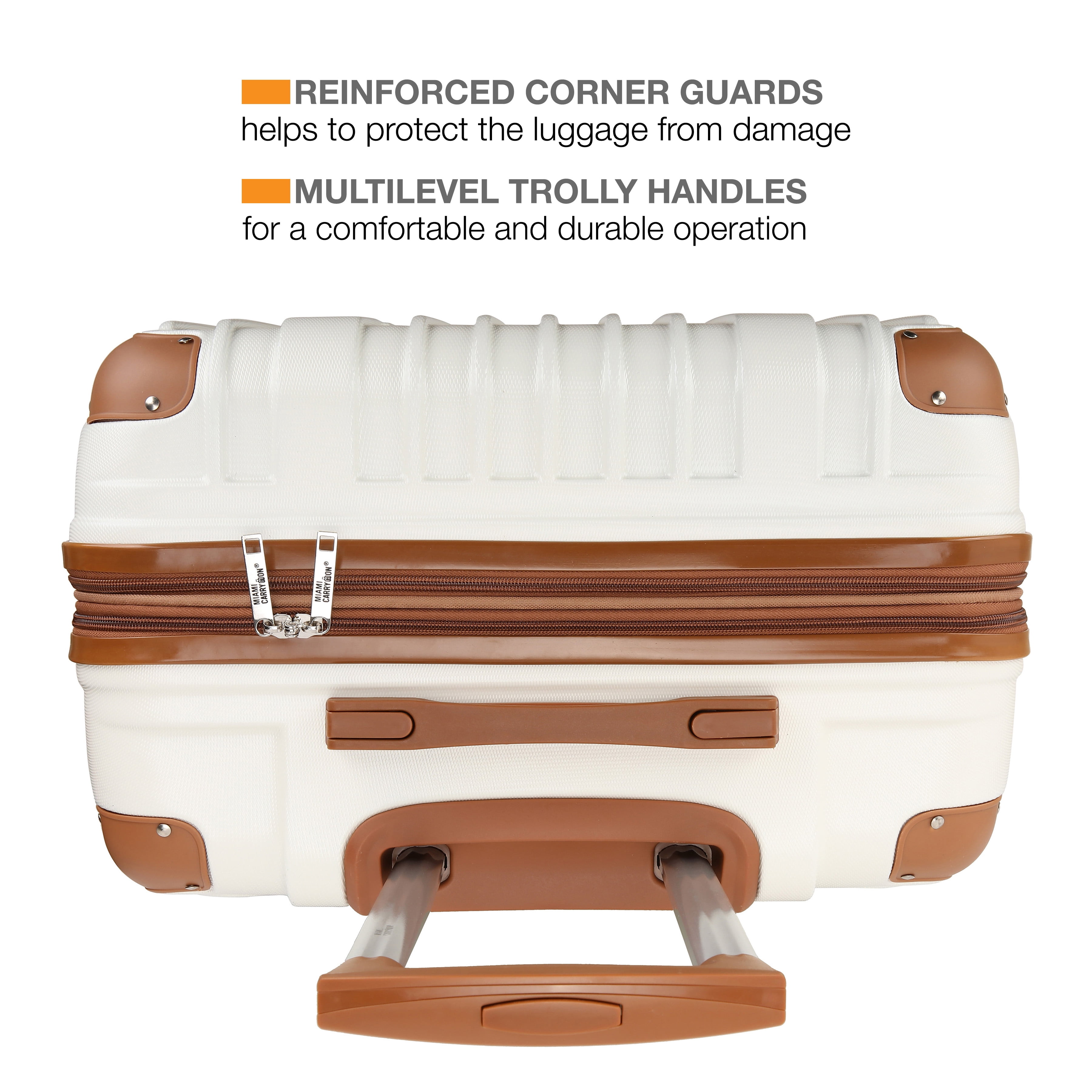 Made from thick ABS with a micro-diamond texture. Molded body, with reinforced corner guards. Eight spinner wheels that roll smooth, quiet, and handles heavyweights The luggage is expandable for more packing capacity The Interior includes separated compartments, a mesh pocket, and compression straps Sturdy and comfortable multi-level trolley 10-year limited manufacturer warranty