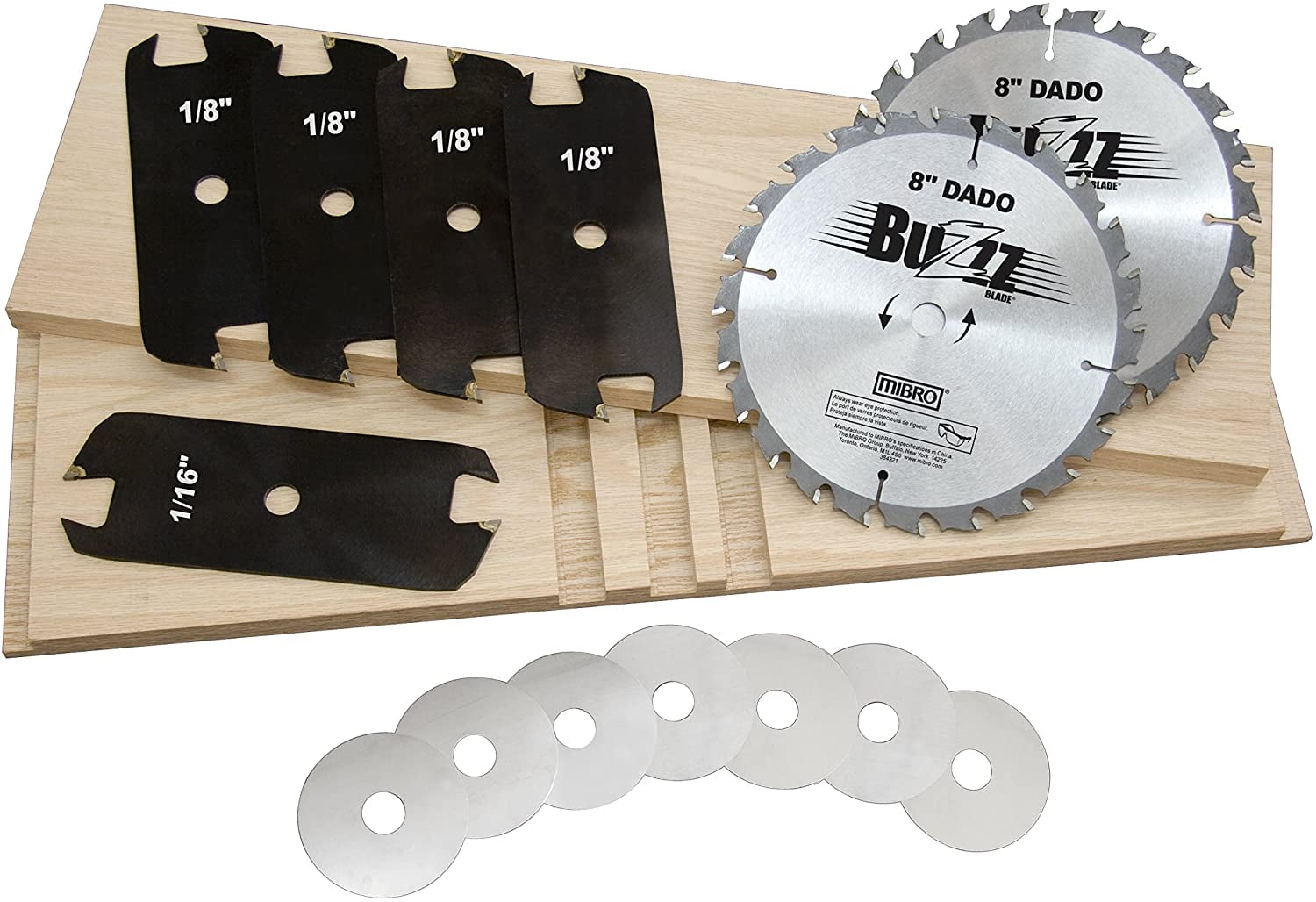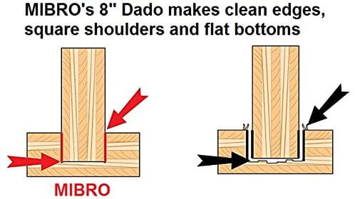 MIBRO’s 8″ Stacking Dado cuts clean edges, square shoulders and flat bottoms. Use the Dado to cut smooth and precise flat-bottomed grooves, either across or with the grain in all types of wood, plywood and composite wood materials. It’s ideal for the DIY, home or woodworking enthusiast, and light professional user. Cut grooves ranging in width from 1/4″ to 13/16″, increasing in 1/16″ increments. Can make a variety of different cuts, including Dado, Groove, Rabbet, Fillet, and Mortise & Tenon. Blade Technology For both the outside blades and the chippers, each tooth is electronically welded onto the blade body by fully-automated equipment from Germany. This ensures exact, centered placement and the correct amount of brazing material. Extra large carbide teeth make for longer lasting blades and overall life. Premium carbide helps to ensure the carbide does not chip or fracture easily. 8″ Outside Cutting Blades The two outside cutting blades have an 8″ diameter with 24 carbide teeth. Both blades have a tooth pattern of 5 beveled cutting teeth, followed by 1 straight raker tooth. The anti-kickback tooth profile prevents the blade from being fed material too quickly. 5 Chipper Blades Set includes one (1) 1/16″ Chipper and four (4) 1/8″ Chippers. Each Chipper Blade features two extra-large carbide teeth, which are also electronically welded onto the blade body by fully-automated equipment from Germany. The Chipper Blades are ground on the same equipment, at the same time, as the Outside Blades. This ensures that all of the blades together will cut a flat-bottomed groove. 7 Metal Shims Use the seven included metal shims for fine adjustments to the overall width of the Dado setup. Shim widths range from 0.004″ to 0.096″. All of the shims have a 3-5/32″ diameter and 5/8″ arbor hole.