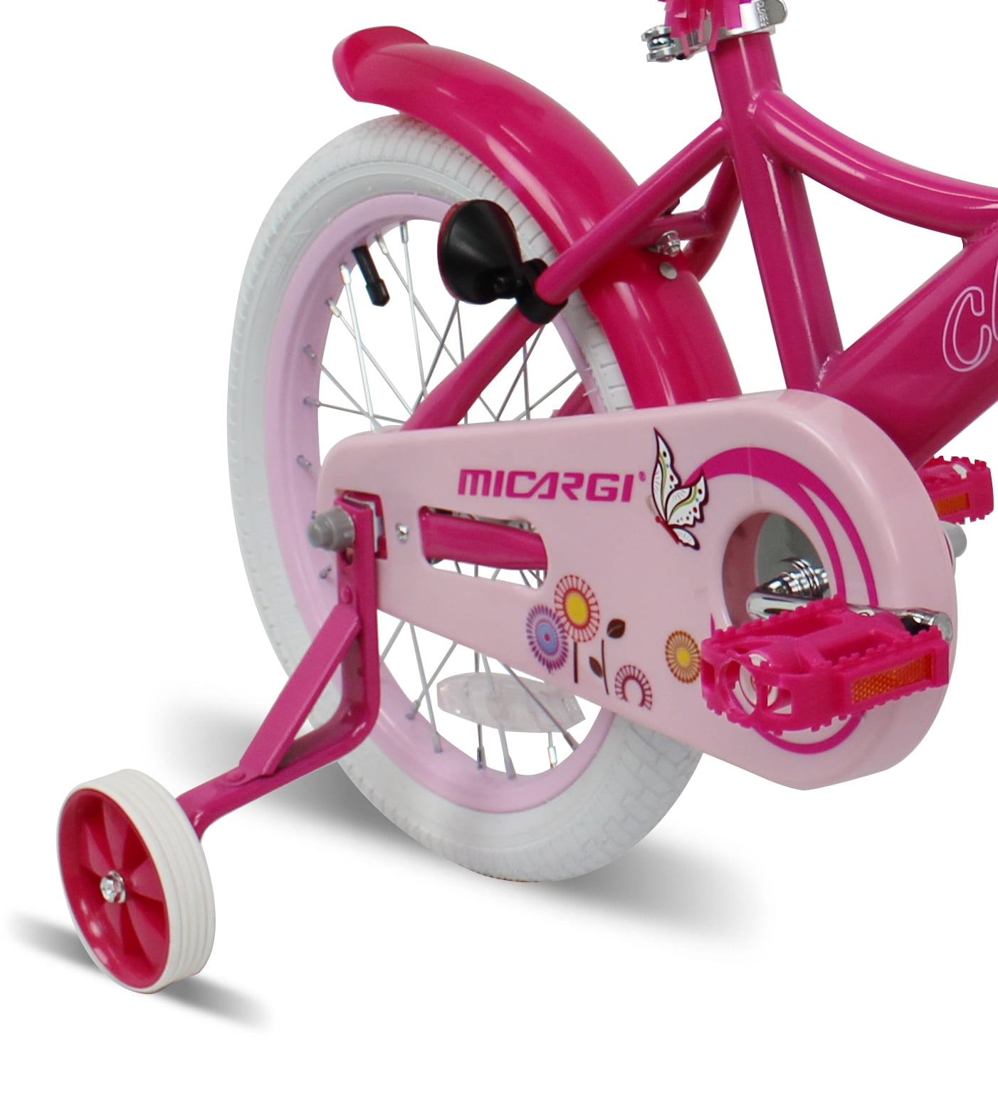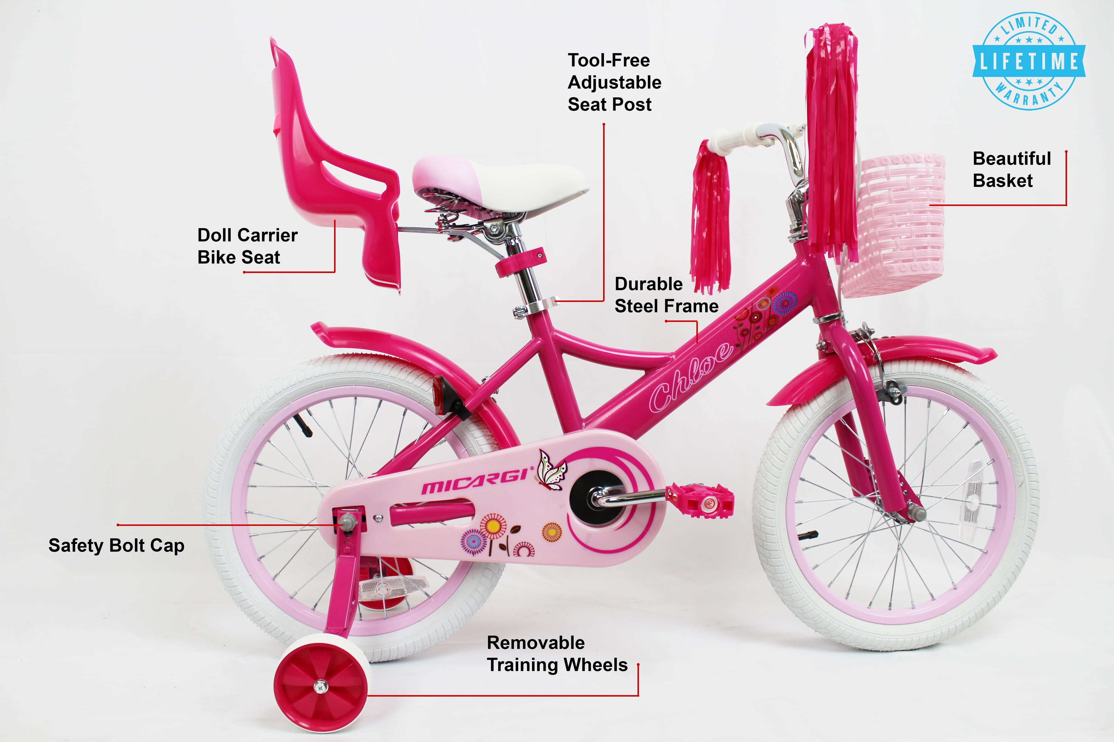 Beautiful stylish design especially for your princess girl Removable Storage Basket Doll Carrier Seat Front hand caliper brake plus rear/foot brake Enclosed chain guard to make sure your child do not touch the chain Removable training wheels Front and rear reflectors Soft handlebar grips Mudguards Bell Durable steel construction girl kids bike The girl bike is 85% assembled Comes with the basic assembly tools