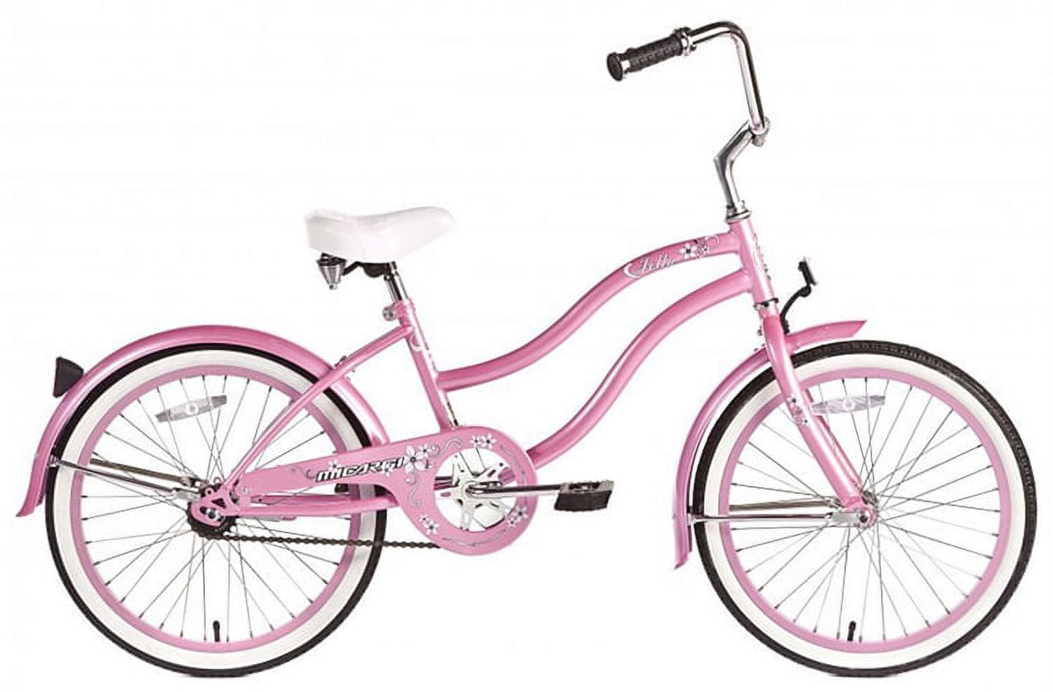 The Jetta is Micargi’s most popular 20″ cruiser that checks all the boxes on the list of what a young rider wants and needs. This single speed cruiser features a durable pink steel frame that looks perfectly complements the young rider. The matching pink fenders and matching rims paired with white wall tires complete the stylish look of this 20″ cruiser; sporting a look that is appealing to all. The Micargi 20″ Jetta features comfortable black grips and a comfortable white cruiser seat that makes riding for hours feel like minutes. Safe and easy to ride with the coaster brake, which makes stopping just as easy as going; just pedal backwards to come to a complete stop. It may take some getting used to by the young rider, but once mastered, it will feel like second nature.
