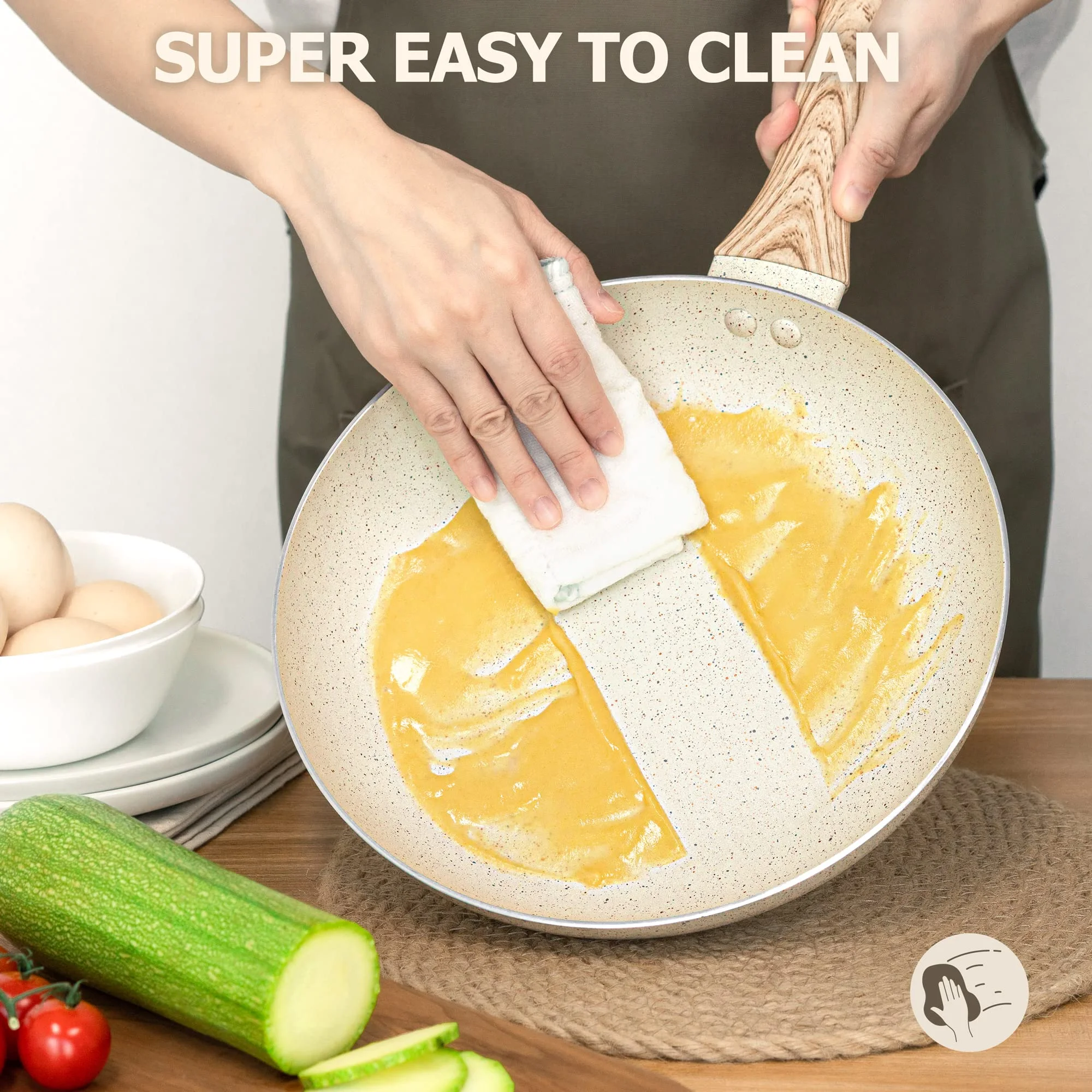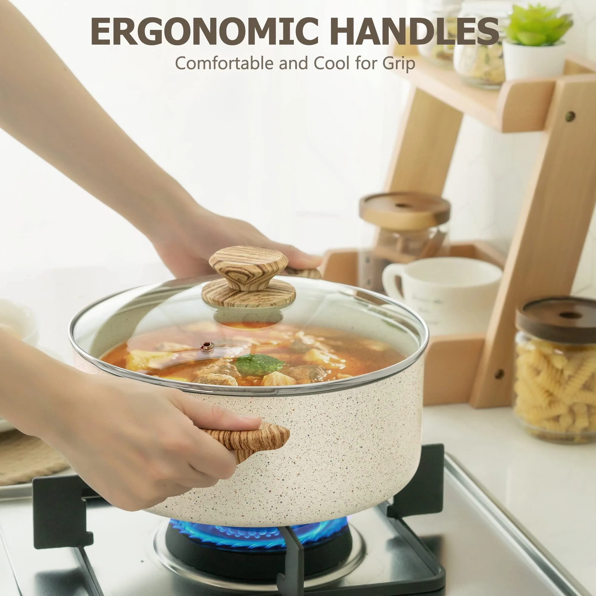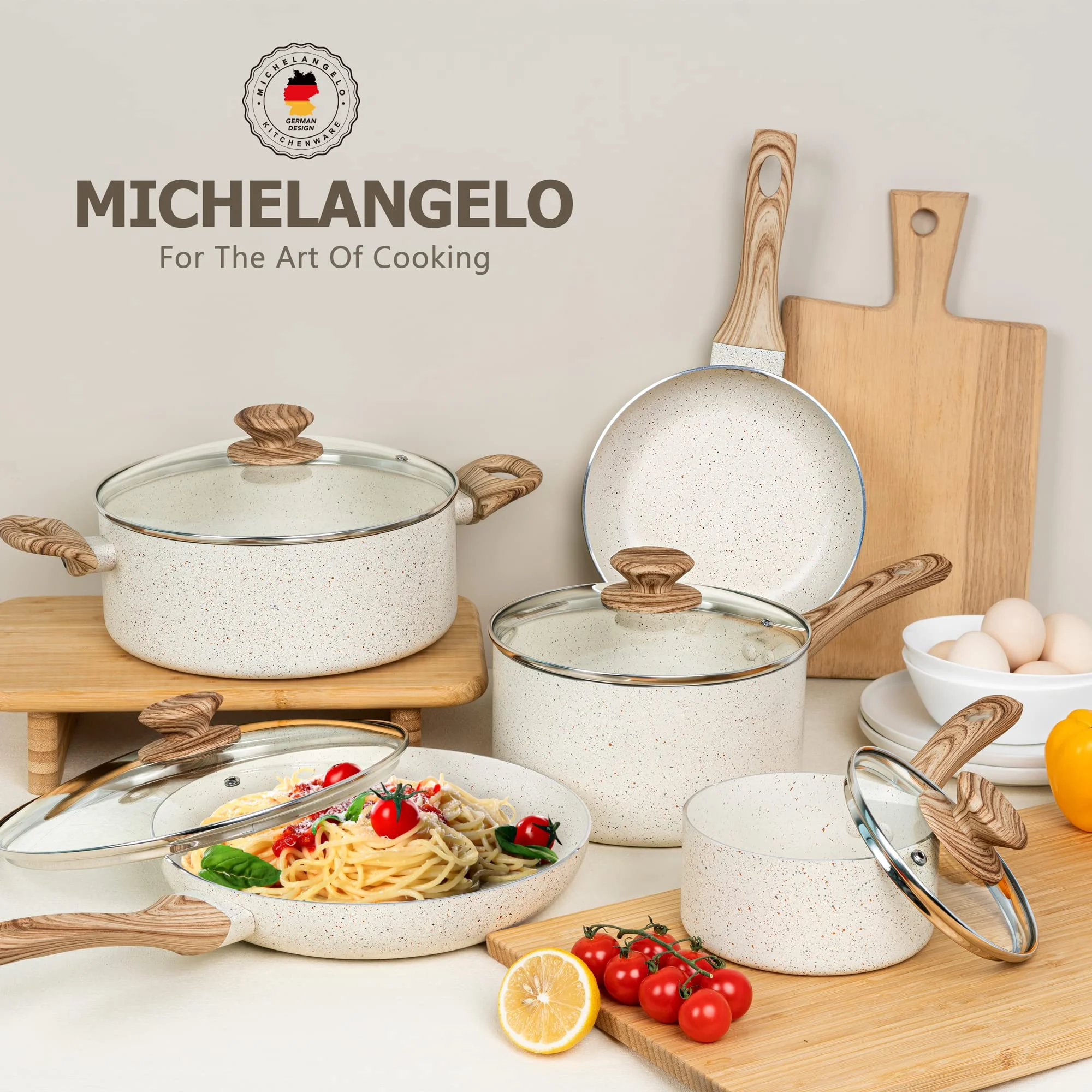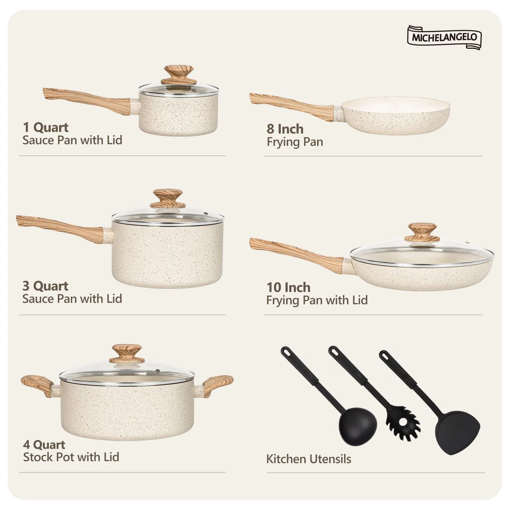 NON-STICK COOKING EXPERIENCE – The white granite coating of this pot set is triple-layered for super non-stick cooking performance and durability. Food slides right off our nonstick cookware for optimum cooking results. Cleaning is a breeze. MEET ALL YOUR DAILY COOKING NEEDS – MICHELANGELO 12-piece cookware sets include 8-inch frying pan, 10-inch frying pan with lid, 1 quart saucepan with lid, 3 quart saucepan with lid, 4 quart stockpot with lid, 1 spatula and 2 spoons. NON TOXIC COOKWARE SET – These white granite pots and pans are made from natural elements that are 100% PFOA, lead and cadmium free, ideal for healthy cooking. Choose these granite cookware for greener and safer cooking! HEATS QUICKLY & EVENLY – The cream pot and pan set features professional grade aluminum alloy which conducts heat quickly and evenly with precise temperature control and no hot spot. VERSATILITY – All of our pots and pans are made with a flat alloy base that allows them to be used on all stovetops including gas, electric, ceramic, glass, etc. Dishwasher safe.