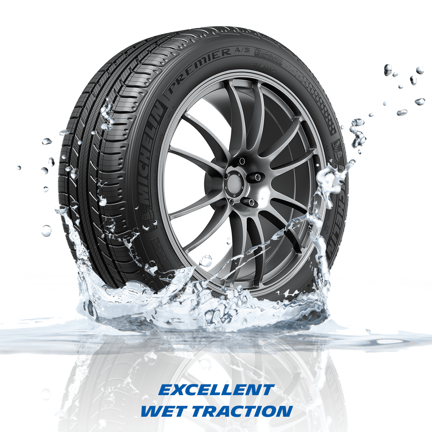 Michelin Premier A/S Tire Delivering category-leading wet grip when new and worn. Designed for the drivers of coupes, sedans and minivans looking for tires that deliver category-leading wet grip when new and when worn. Michelin Premier A/S has long lasting winter performance. EverGrip technology allows the expanding rain grooves to widen and emerging grooves to open as the tire wears. Sunflower Oil in the advanced EverGrip Compound allow the tire to be flexible in lower temperatures. This technology allows the tires, even when worn, to stop shorter on wet roads than leading competitors’ brand new tires, as well as provide all season traction on wintry roads The Premier A/S is a Michelin total performance tire that utilizes innovative technologies to bring multiple performances together. Combining stopping power, driving control, promised weather appropriateness and enhanced fuel efficiency.