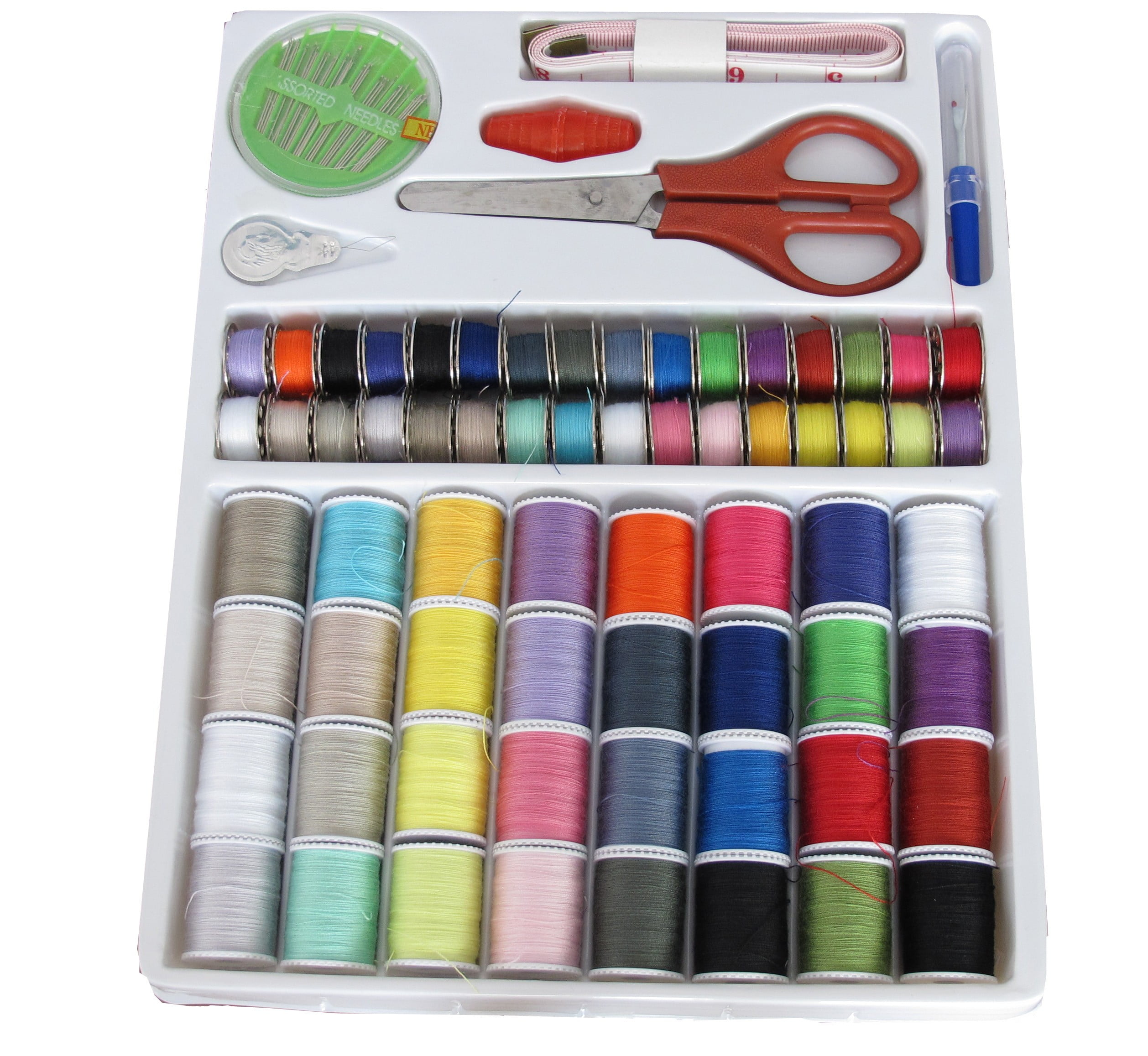 12 built-in stitch patterns High/low speed selector 2-thread lockstitch Forward and reverse sewing Auto bobbin winder; top drop-in bobbin; easy-to-use magnetic bobbin system Sews sleeves Accessory storage drawer Built-in sewing light and thread cutter Uses hand switch or foot pedal to start Operates with 4 AA batteries (not included) or 6-volt DC power adapter Dimensions: 10.8 in. x 4.8 in. x 10.2 in. Electric scissors use 2 AA batteries (not included), ideal for cutting fabric quickly and easily 100-piece kit includes 32 spools of thread in different colors, 32 bobbins of thread in different colors, 30 needles, measuring tape, small scissors, 2 thimbles, threader, and seam ripper Includes 100-piece kit, electric scissors, 2 thread spools, 2 metal bobbins, foot pedal, adapter, replacement needle, needle threader, and instruction manual