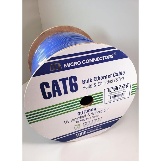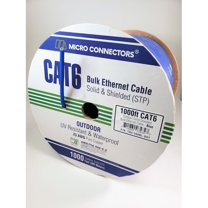 Micro Connectors cat 6 solid STP bulk Ethernet cable is perfect for your office of warehouse cabling project. Our cable allows for maximum performance while minimizing electromagnetic interference/radio-frequency interference (emu/RF) and almost eliminating alien crosstalk (act). Suitable for fast, gigabyte, and 10-gigabyte Ethernet and supports bandwidths of up to 550 MHz. Packaged in a hassle-free, tangle free, easy pull reel (with a spool inside the box), you will not have to worry about getting behind on your next job. Pure bare copper produces a stronger signal along with better conductivity and flexibility when compared to copper clad aluminum (CC). Designed to withstand sunlight, dirt, and moisture. Rugged and durable for extreme environments. Bury directly in the ground or use in conduit. Connect to what matters: computers, printers, gaming consoles, routers, Ethernet extenders, switch boxes, VIP phones, up cameras, Poe devices, etc. All data cables meet or exceed ANSI TIA/ea 568-C.2 Standards, and are roes compliant.
