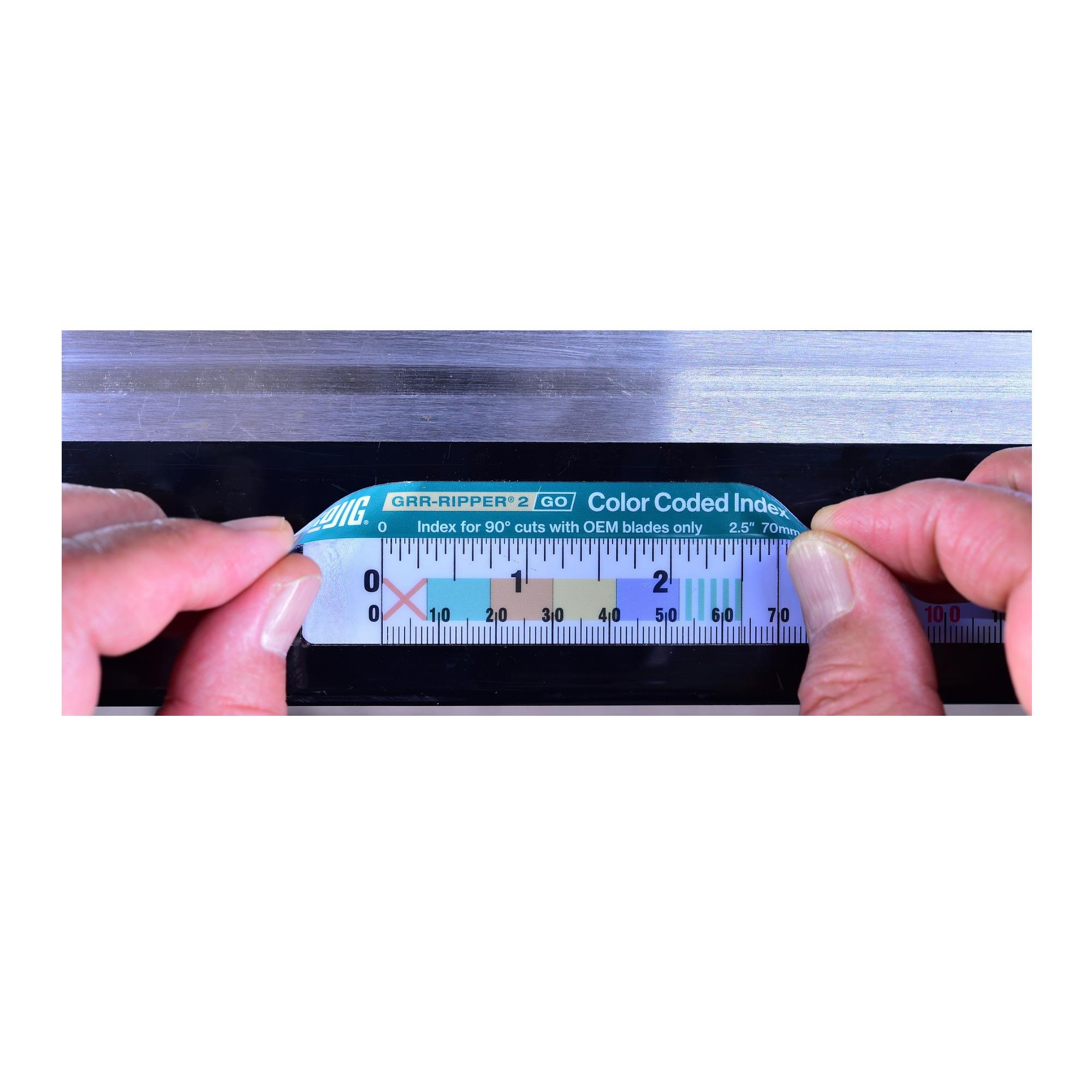The Grr-ripper2 Go comes fully assembled and with a sticker for your fence scale. Matching colors from the fence scale to the Grr-ripper2 Go end keeps the blade in the correct tunnel. Simply see the color over your cutting width and match the color to the correct end.