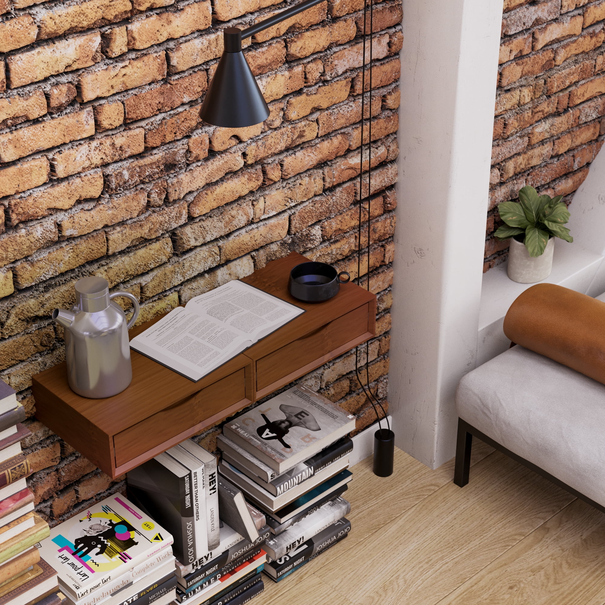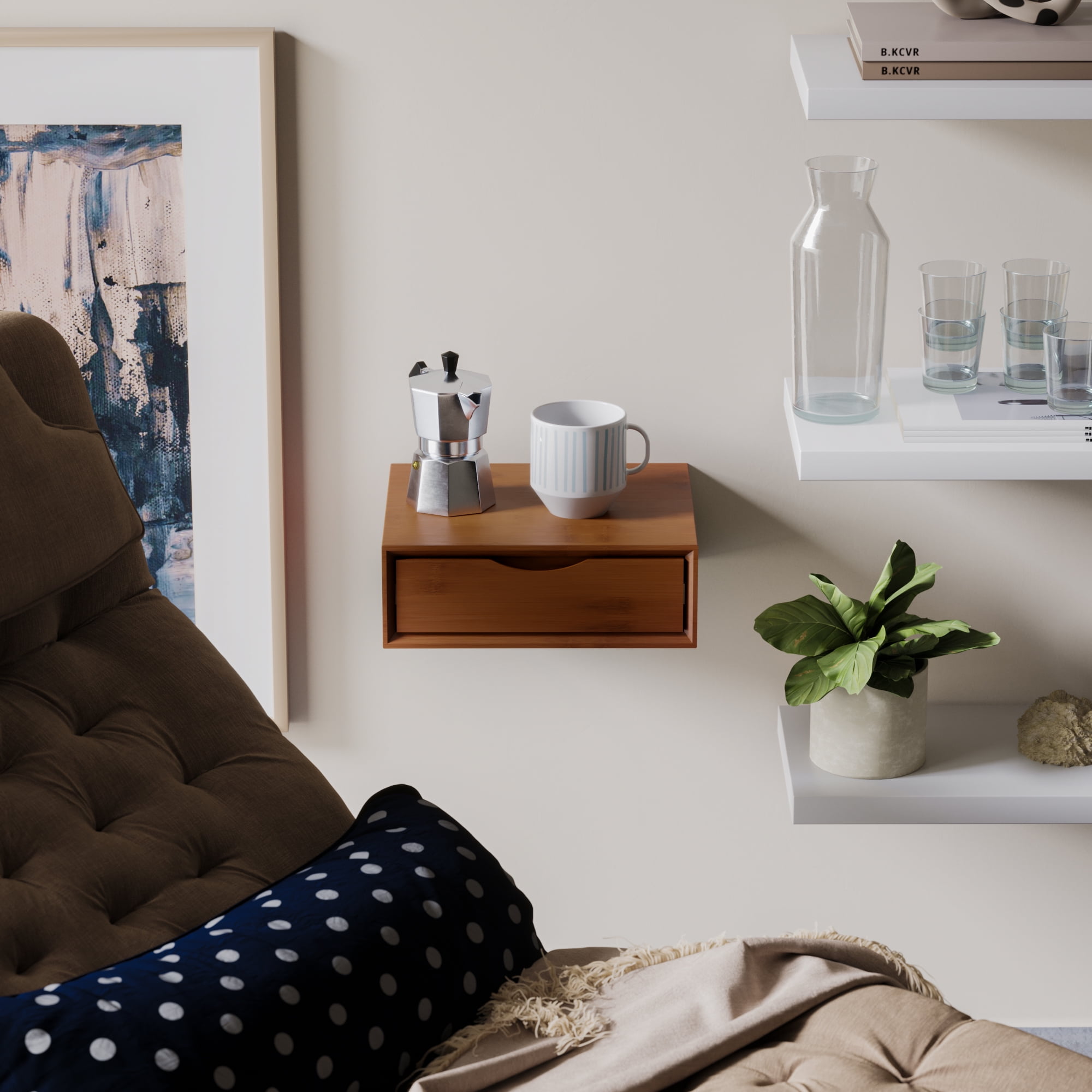 Middleton Row Bamboo Wood Wall Mounted Floating Nightstand with Drawer, Mahogany REAL BAMBOO WOOD – Made of eco-friendly real bamboo, this beautiful small shelf furniture fits in perfectly in bedrooms, small spaces, apartments and is the perfect gift for students living in dorms. The shelf is also highly versatile and can be used as a nightstand, floating dresser, or end table. NO ASSEMBLY REQUIRED – The shelf comes assembled out of the box. It also comes with an installation guide for hanging the floating shelf, and all necessary hardware is included. HIGH QUALITY CONSTRUCTION – This floating shelf has a pull-out drawer and is mounted on high quality metal rails. This allows for the smooth operation of the mini floating shelves. UTILIZE FLOOR SPACE – This shelf is wall mounted, and is floating, allowing for mounting flexibility. You can choose the height of the shelf, as well as better utilize floor space. USE SINGLE OR DUAL – These bedside shelves are 15.8 inches wide by 11.8 deep by 4.7 inches tall. They are also constructed of real wood. It looks great as a single unit, as well as placing multiple units’ side-by-side.