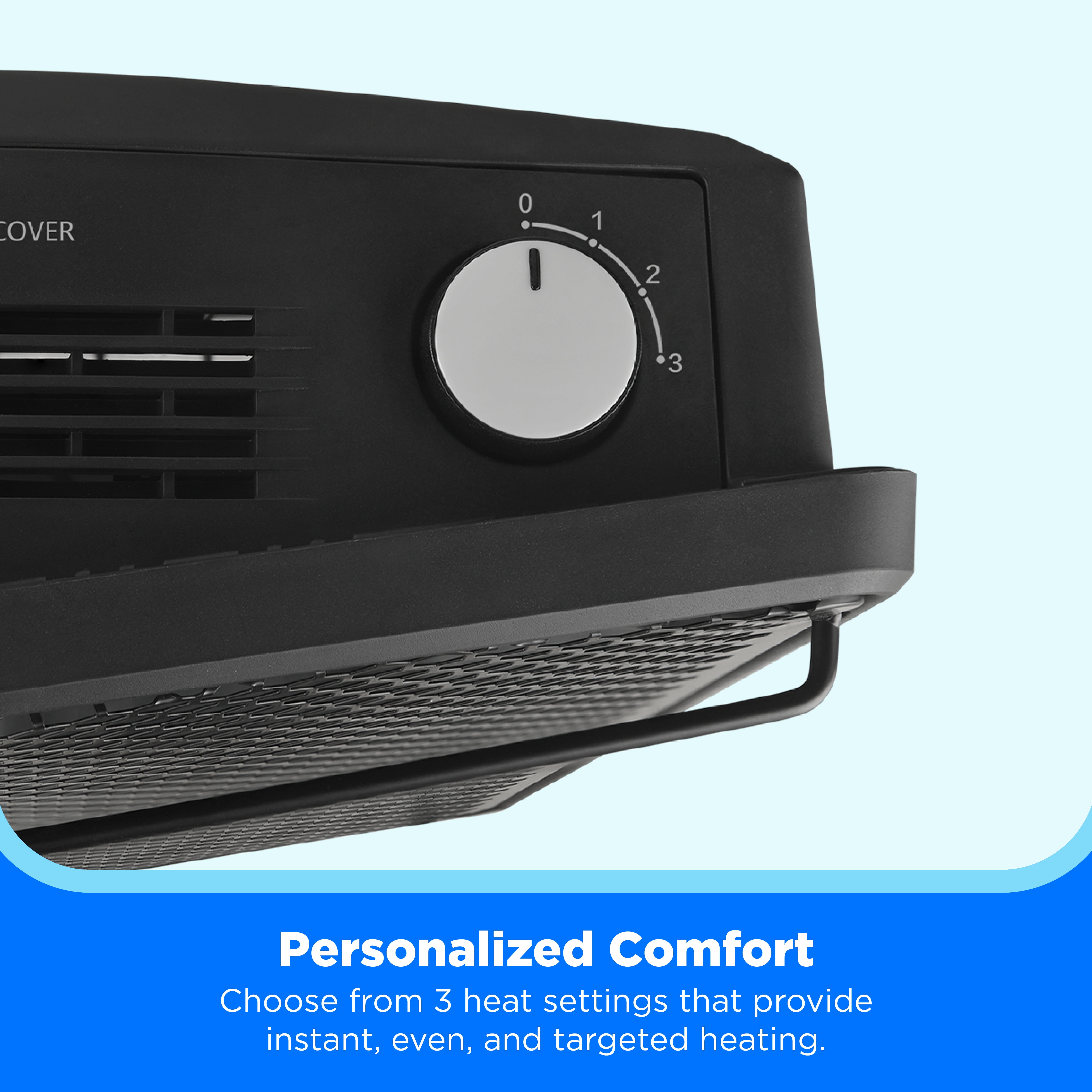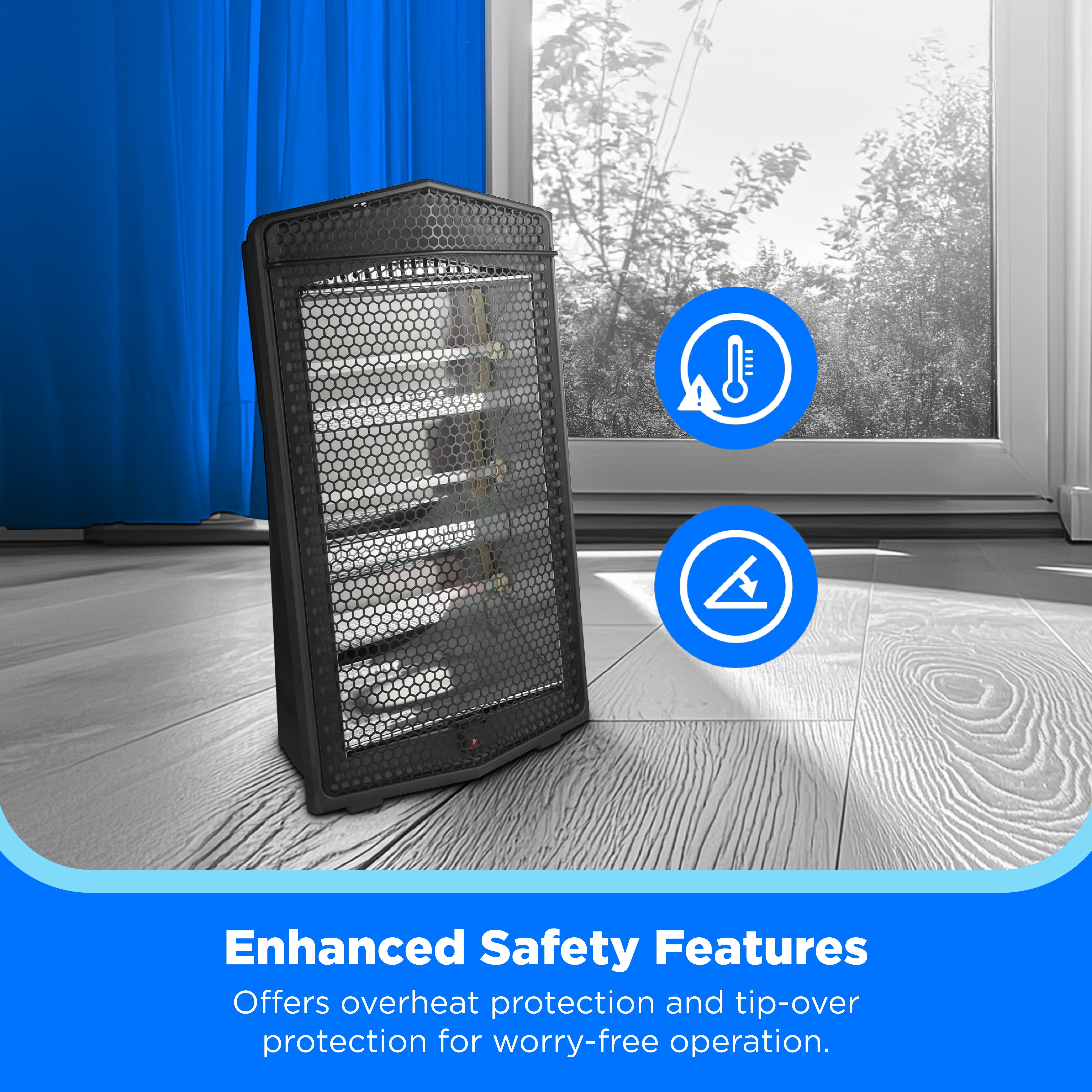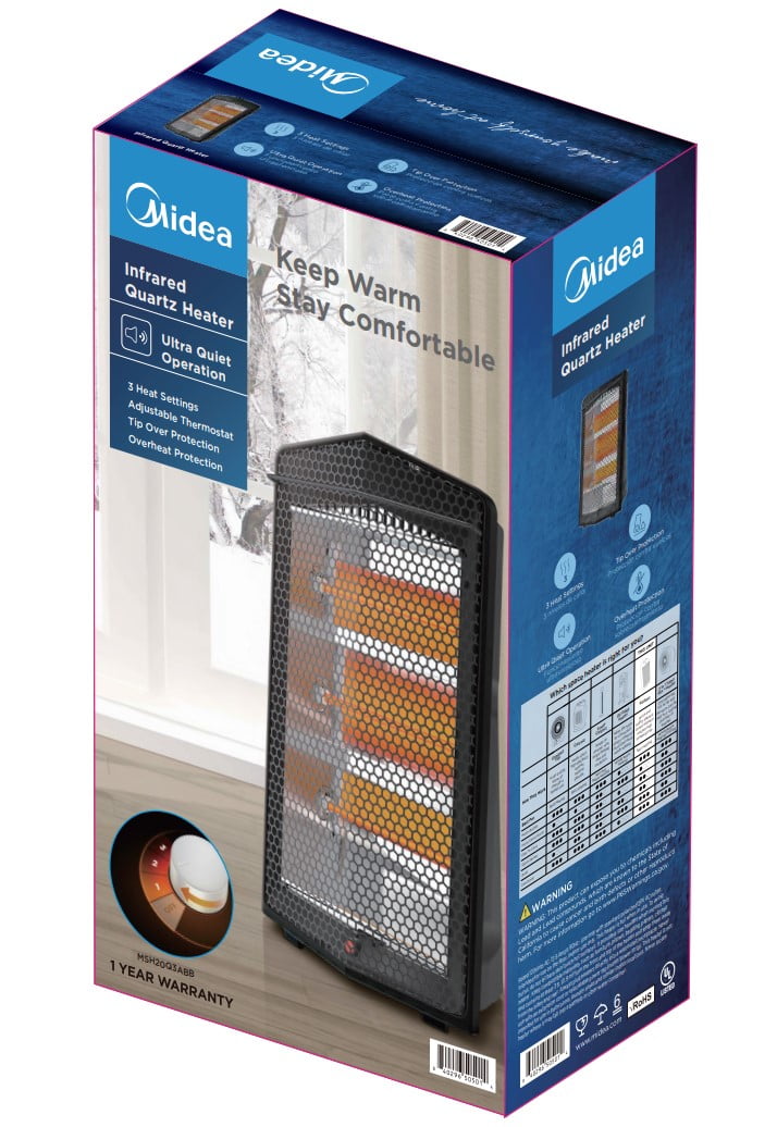 Create a warm and comfortable space for work or relaxation with this new Midea radiant quartz heater. By lowering your home thermostat slightly and using this heater to warm just the room you are occupying, it can lead to significant savings on your heating bills. The heater employs three quartz tubes, which heat up quickly and give off a warm glow when in use. The quartz heater offers 3 different heat settings. You can switch between the high, medium and low heat settings by simply turning a control knob at the top of the unit. A second knob allows you to easily adjust the thermostat to just the right temperature for your space. This heater is designed with safety in mind, a tip-over switch automatically turns the heater off if it is knocked over, while a built-in sensor helps to prevent the unit from overheating. A molded handle makes it easy to carry, and the stay-cool handle and housing allow you to safely transport it from room to room. The Midea quartz heater has a space-saving design that fits into small rooms with ease. It comes in a sleek black finish that effortlessly complements a wide variety of different decor styles.