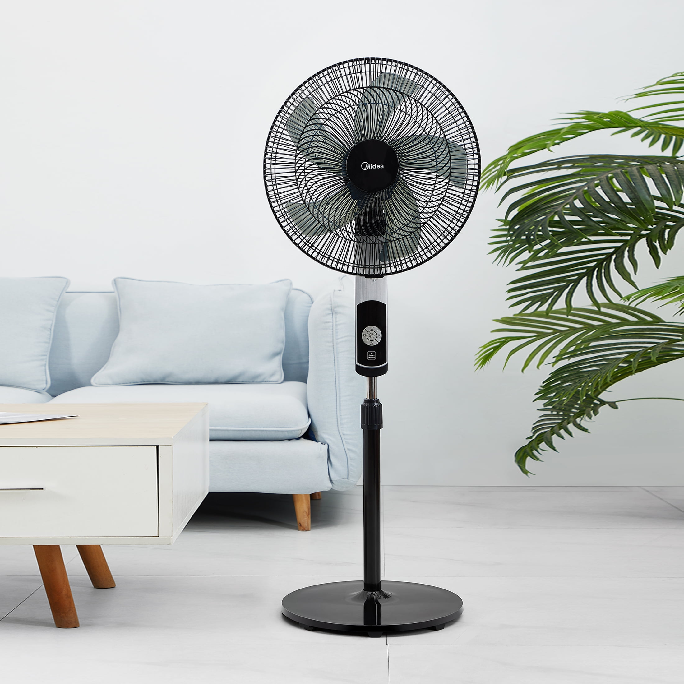 Make comfort smarter with the New Midea 16-inch Smart Stand Fan. With 12 speed settings, a 12-hour programmable timer, adjustable height, and 4 fan modes, you can customize your cooling to match your needs. With the ultra-quiet DC motor, you can keep cool while reading a book, watching your favorite movie, or enjoying undisturbed sleep. This Smart Fan is Wi-Fi enabled with the MSmartHome App. Voice controls are available with Alexa and Google Assistant Devices. Along with the smart features, this fan can also be controlled with the easy-to-read LED display and included remote control.