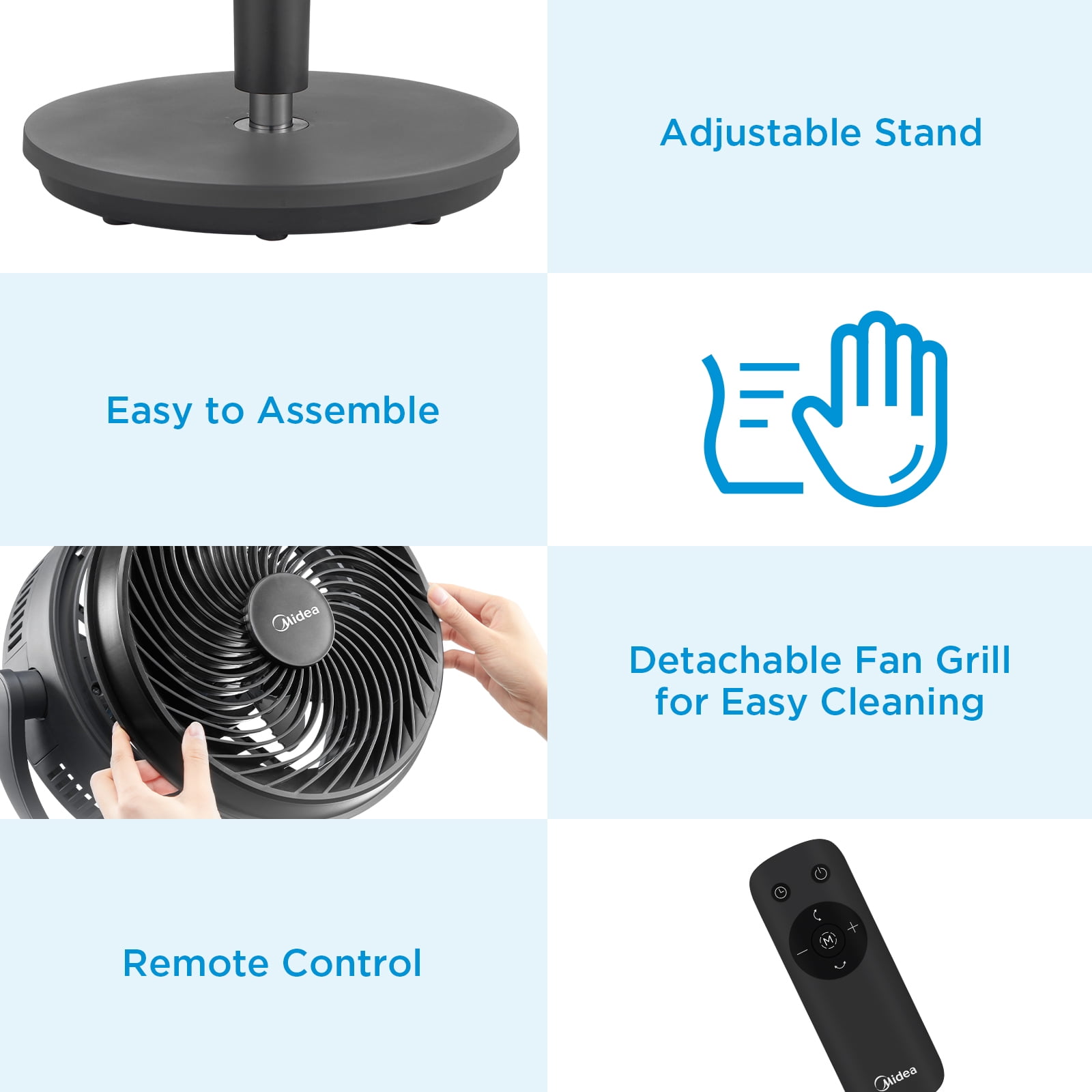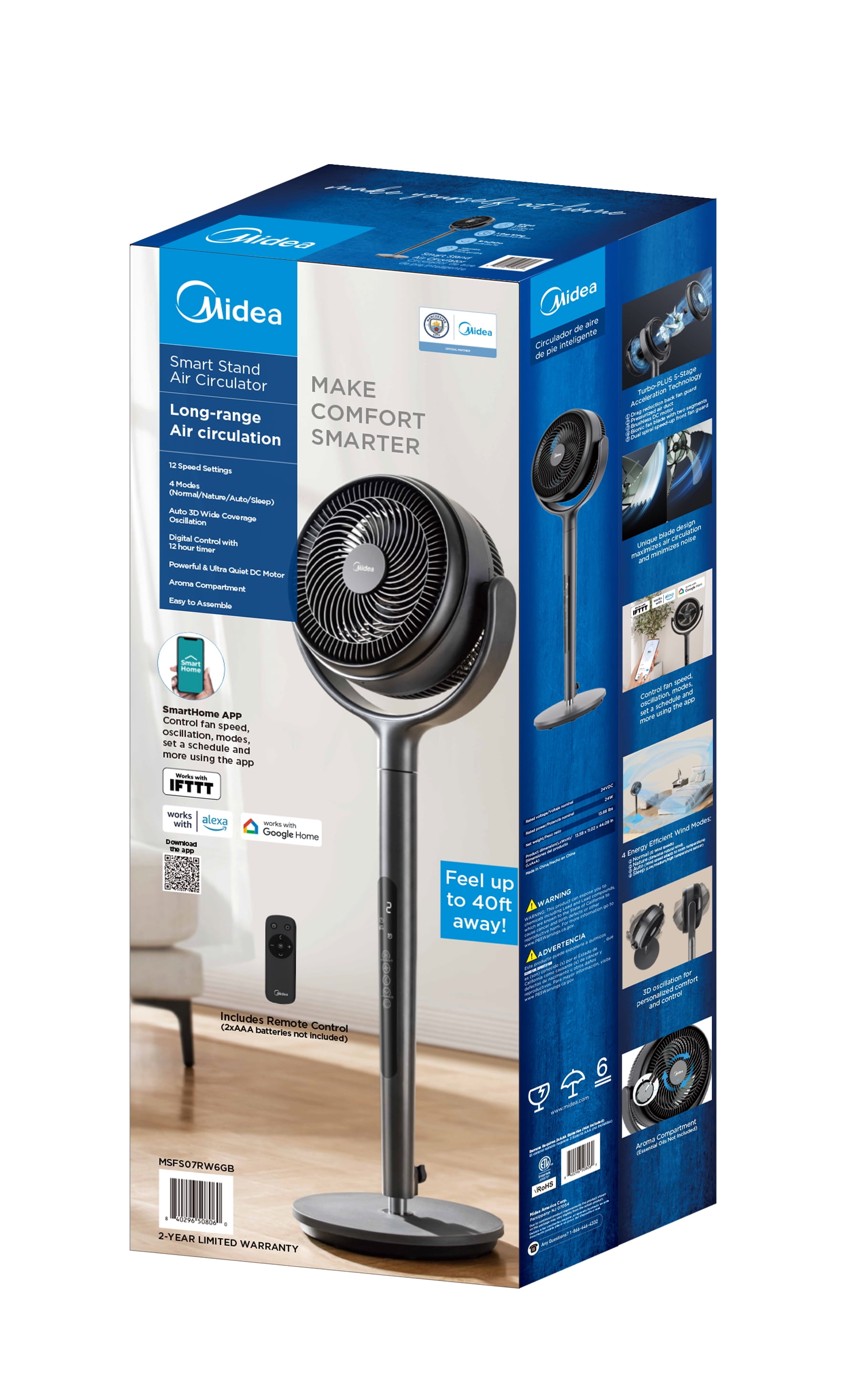Midea 44″ Tall 12-Speed Smart Air Circulator Pedestal Fan, MSFS07RW6GB, New, Black #1 Home Comfort Brand: Midea brand named #1 Home Comfort brand in the US according to Circana/Retail tracking service data for 2023 Four modes for daily use: Adjustable: Aromatherapy: Enhanced Energy Efficiency: